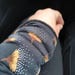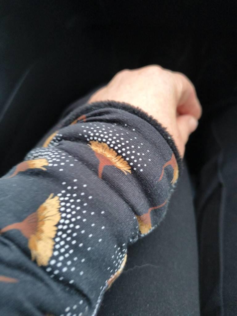 These arm warmers are made from a soft jersey fabric with a floral pattern on a black background. They are lined with a warm fleece fabric – also black.