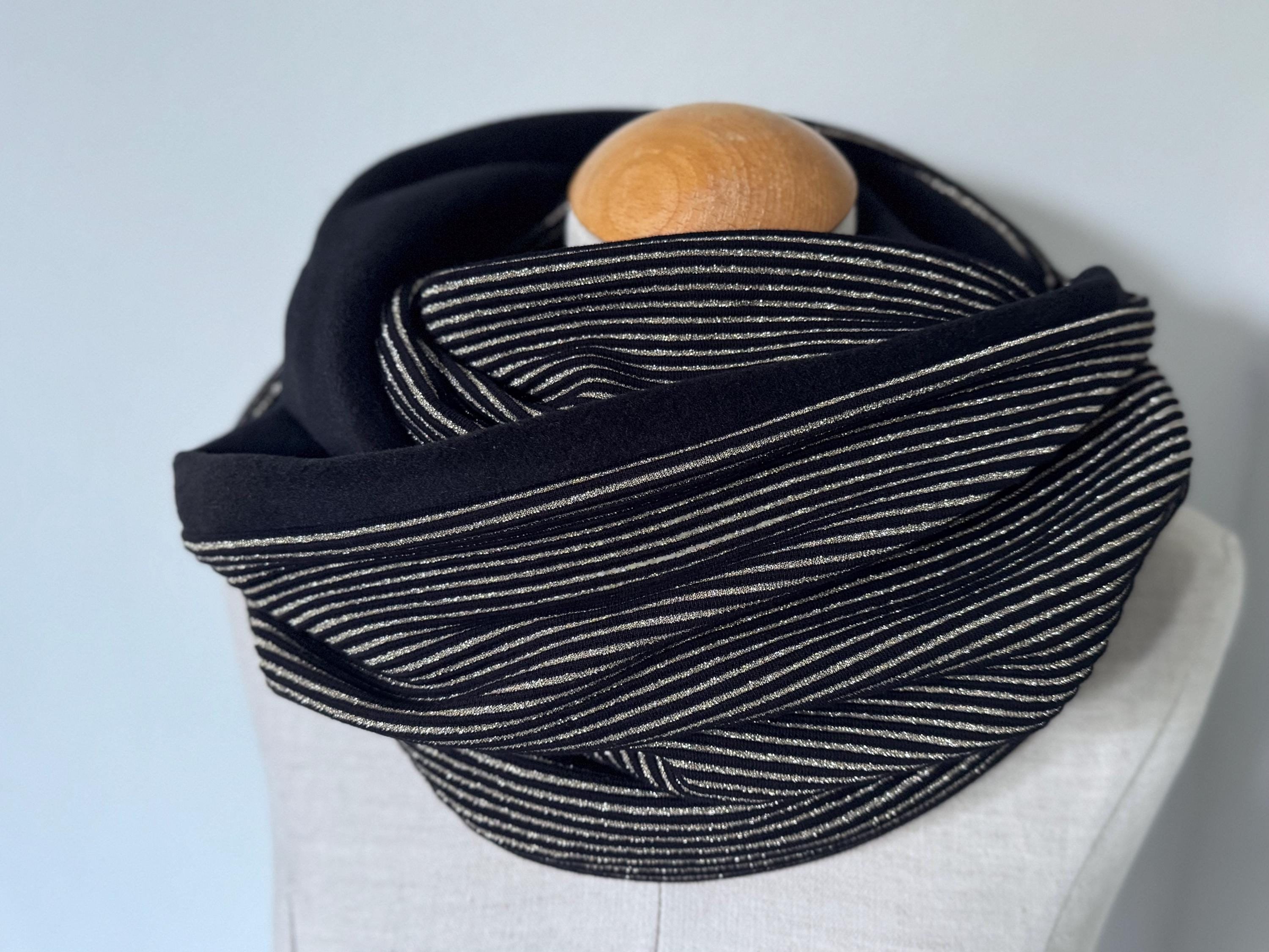 For this loop scarf, we used a jersey fabric with glittering gold stripes.