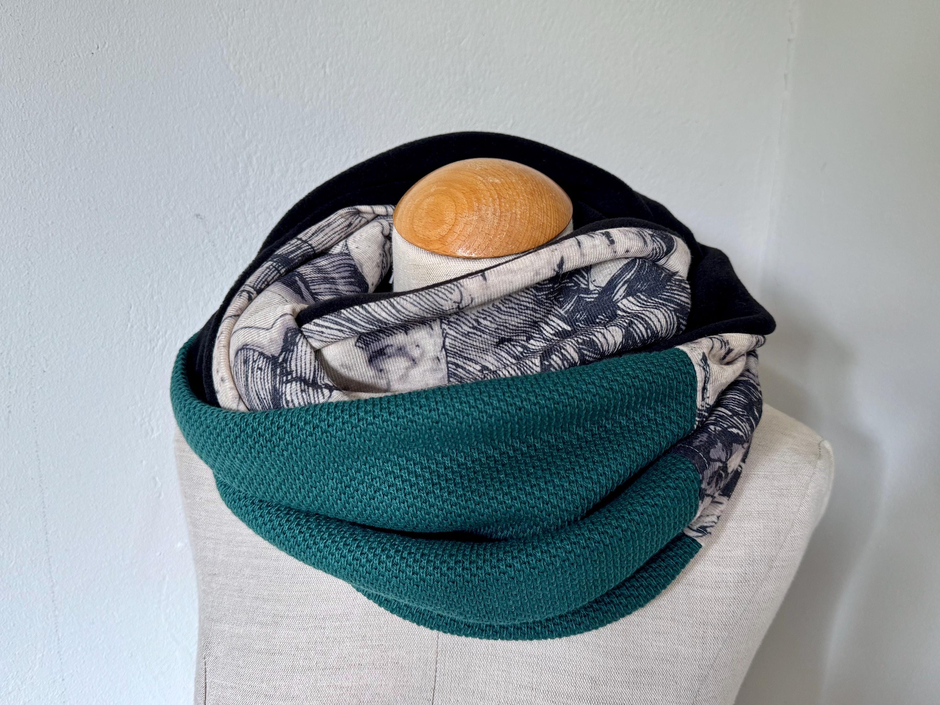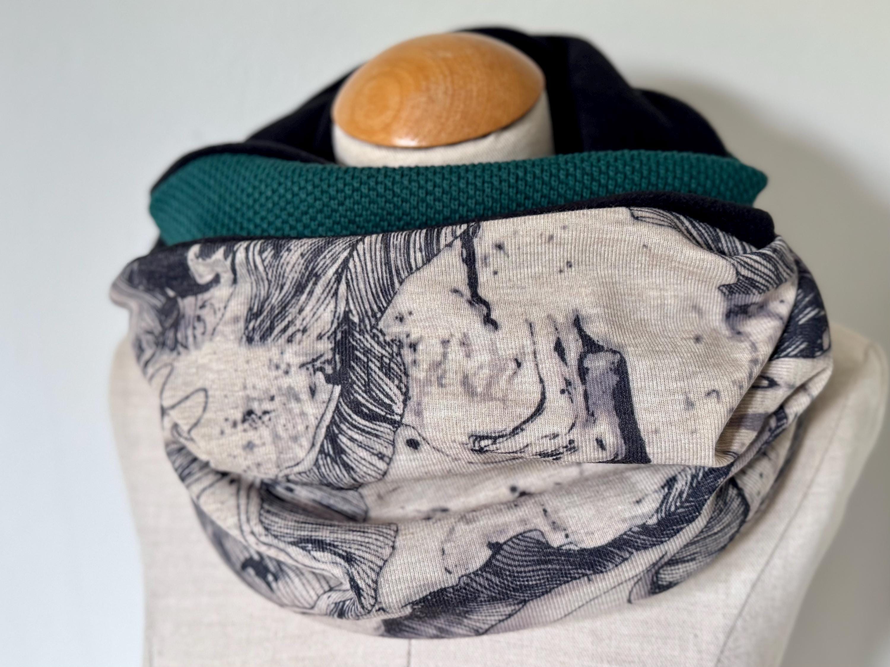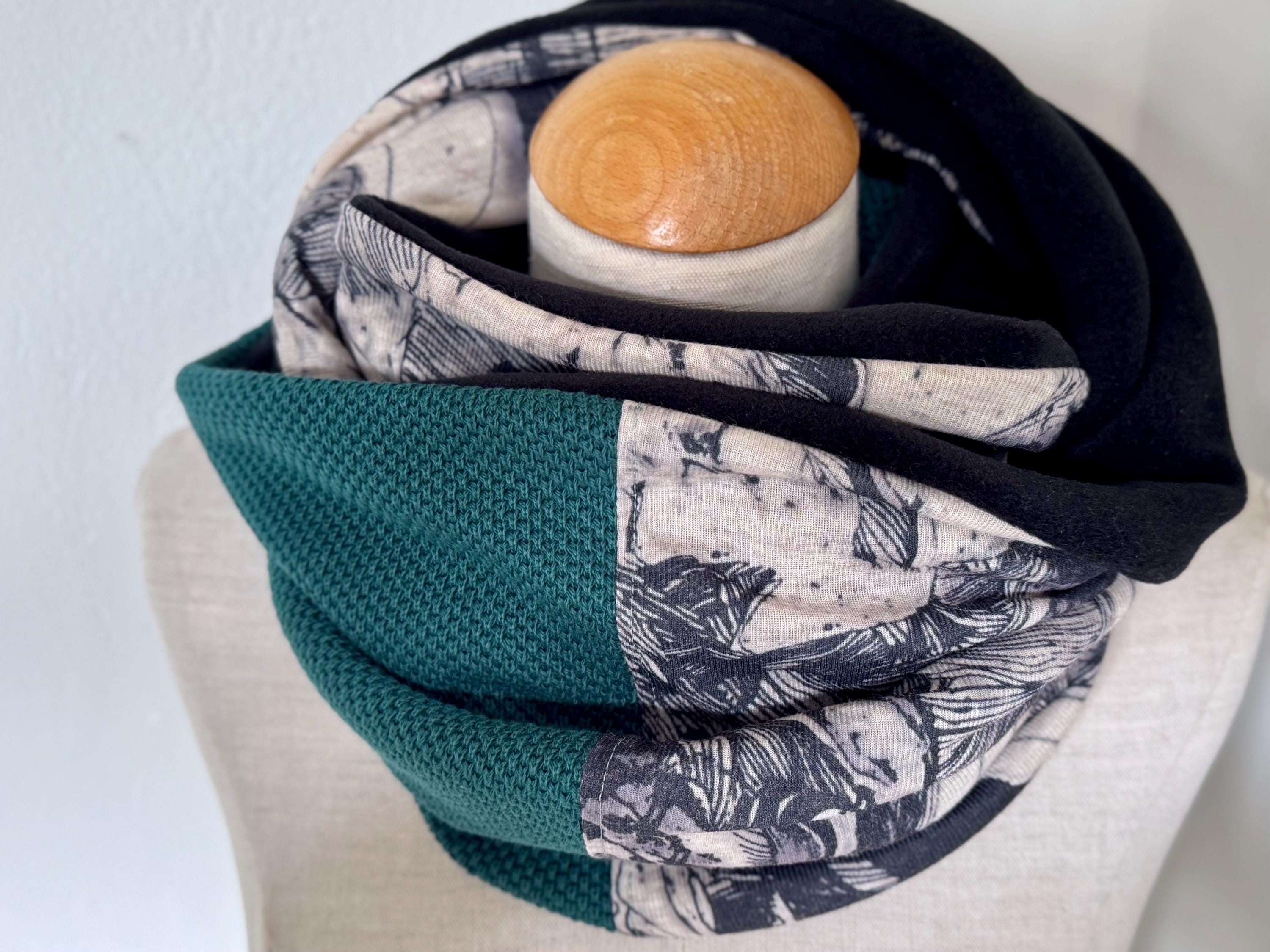 Here is a wonderful, soft loop scarf. It is sewn from three great fabrics, is reversible and therefore very versatile in its appearance.