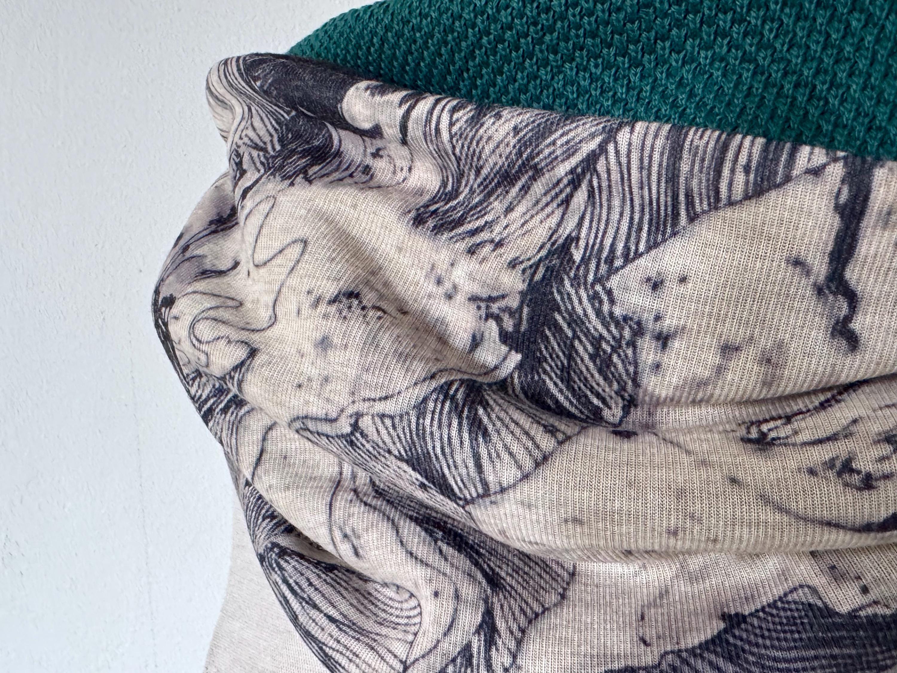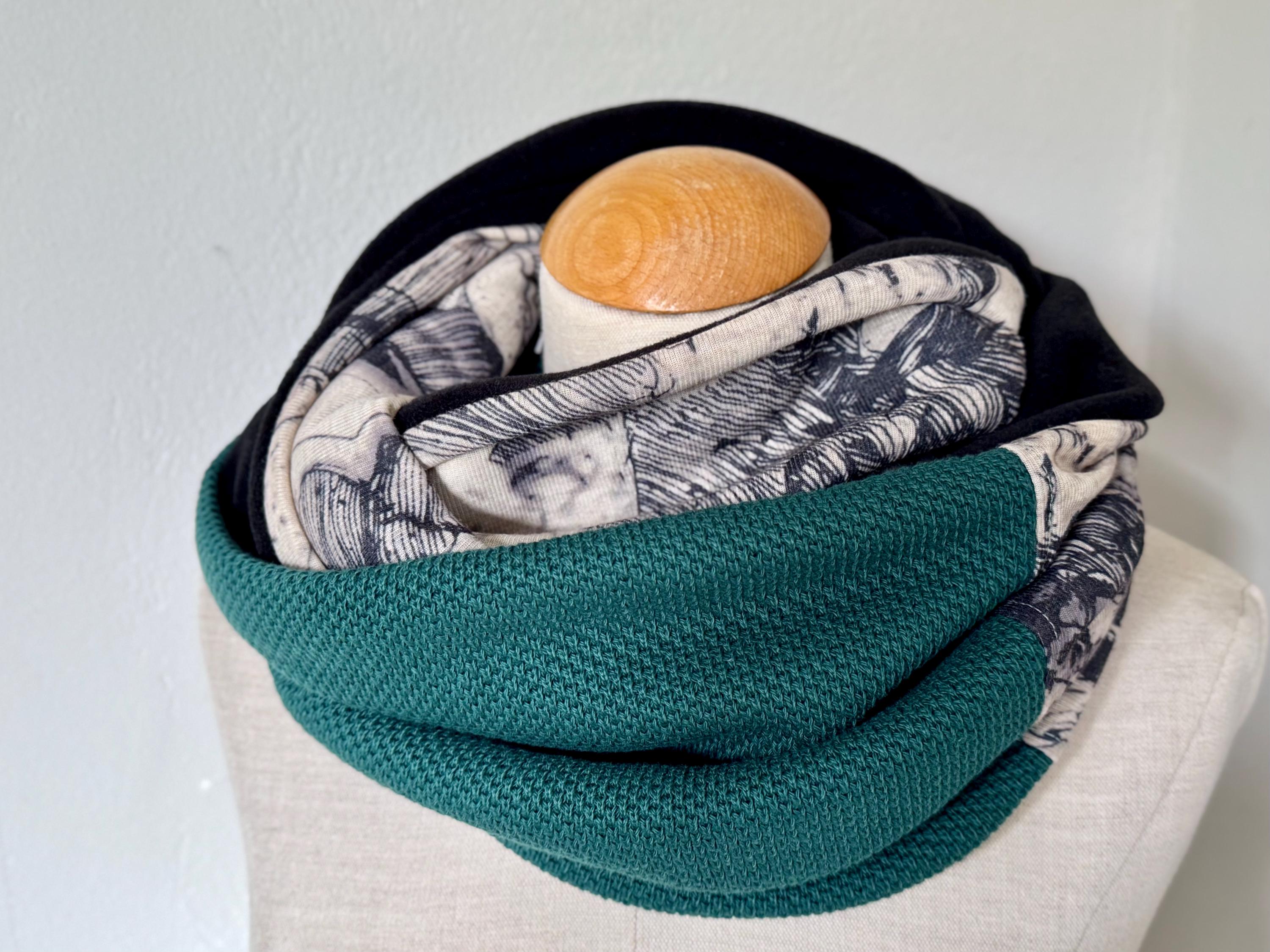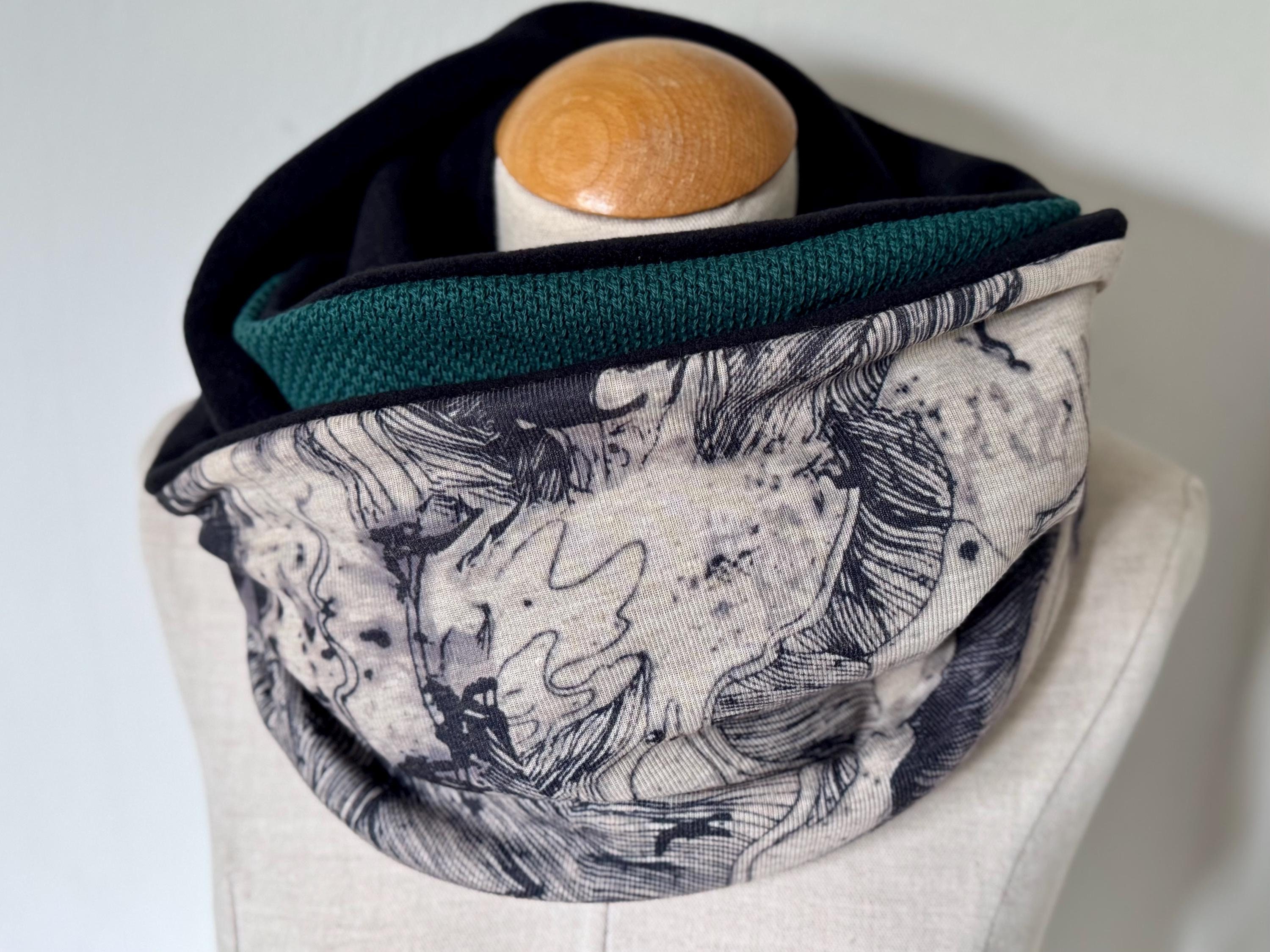 Here is a wonderful, soft loop scarf. It is sewn from three great fabrics, is reversible and therefore very versatile in its appearance.