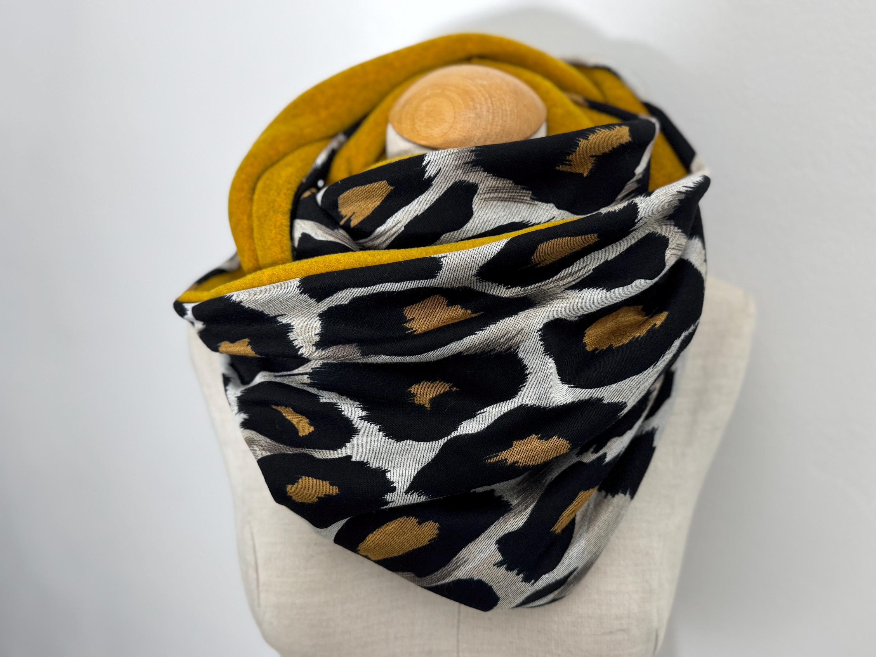 This scarf is made from a beautiful jersey fabric with a large leopard print. The high-quality fleece lining in a warm yellow tone is incredibly cozy.