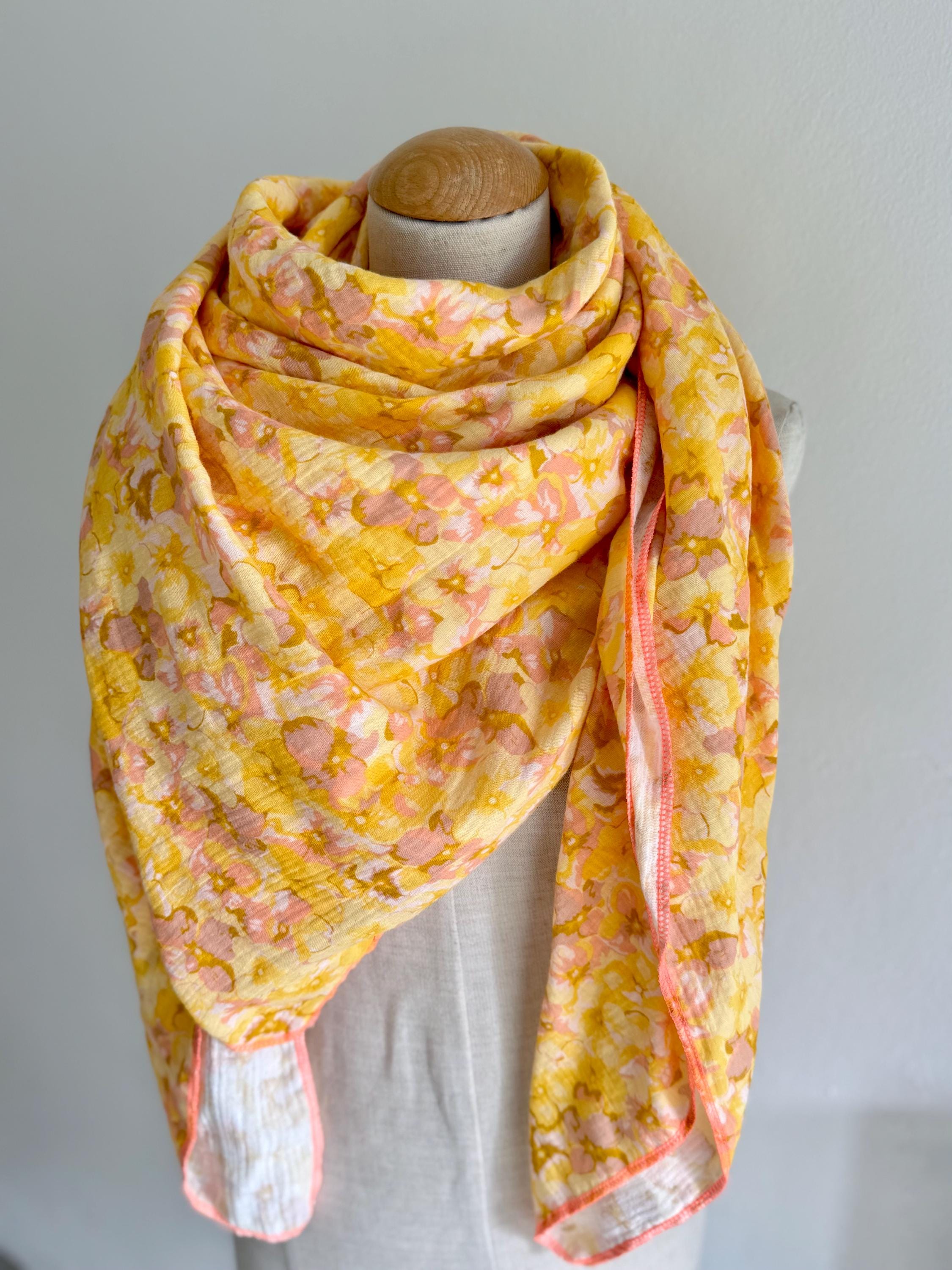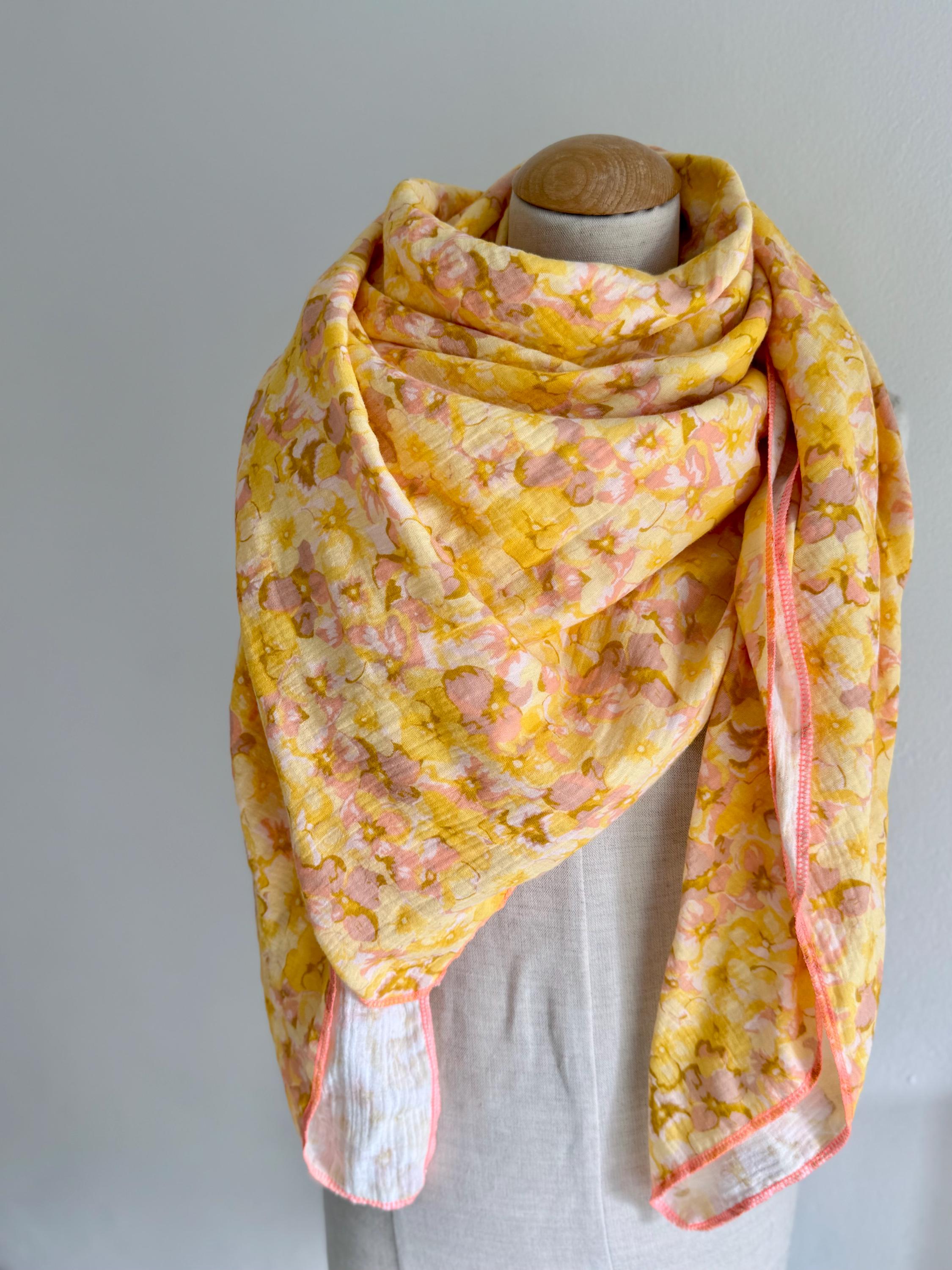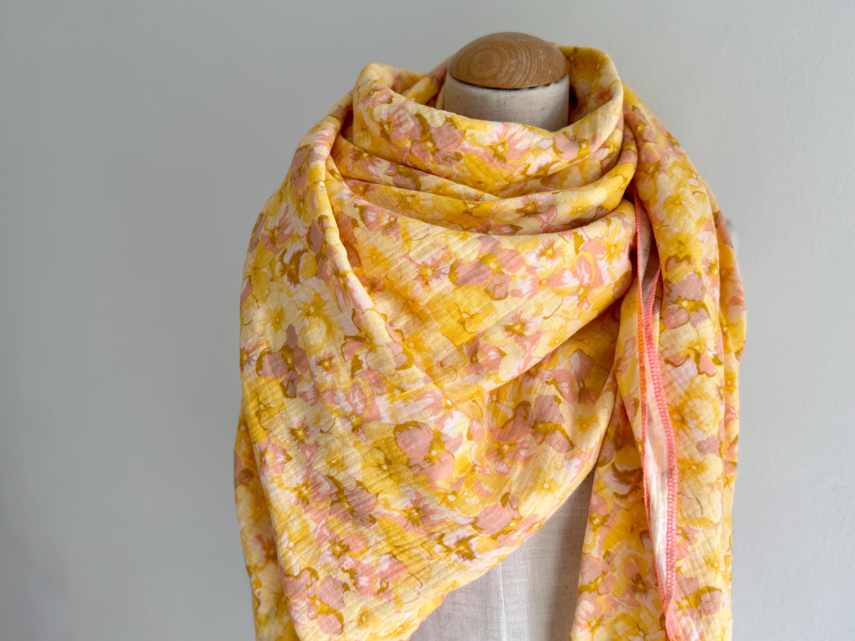 Summer scarf square muslin XXL wrap scarf triangular scarf loop scarf pink yellow pastel flowers cotton scarf stole gift Mother's Day