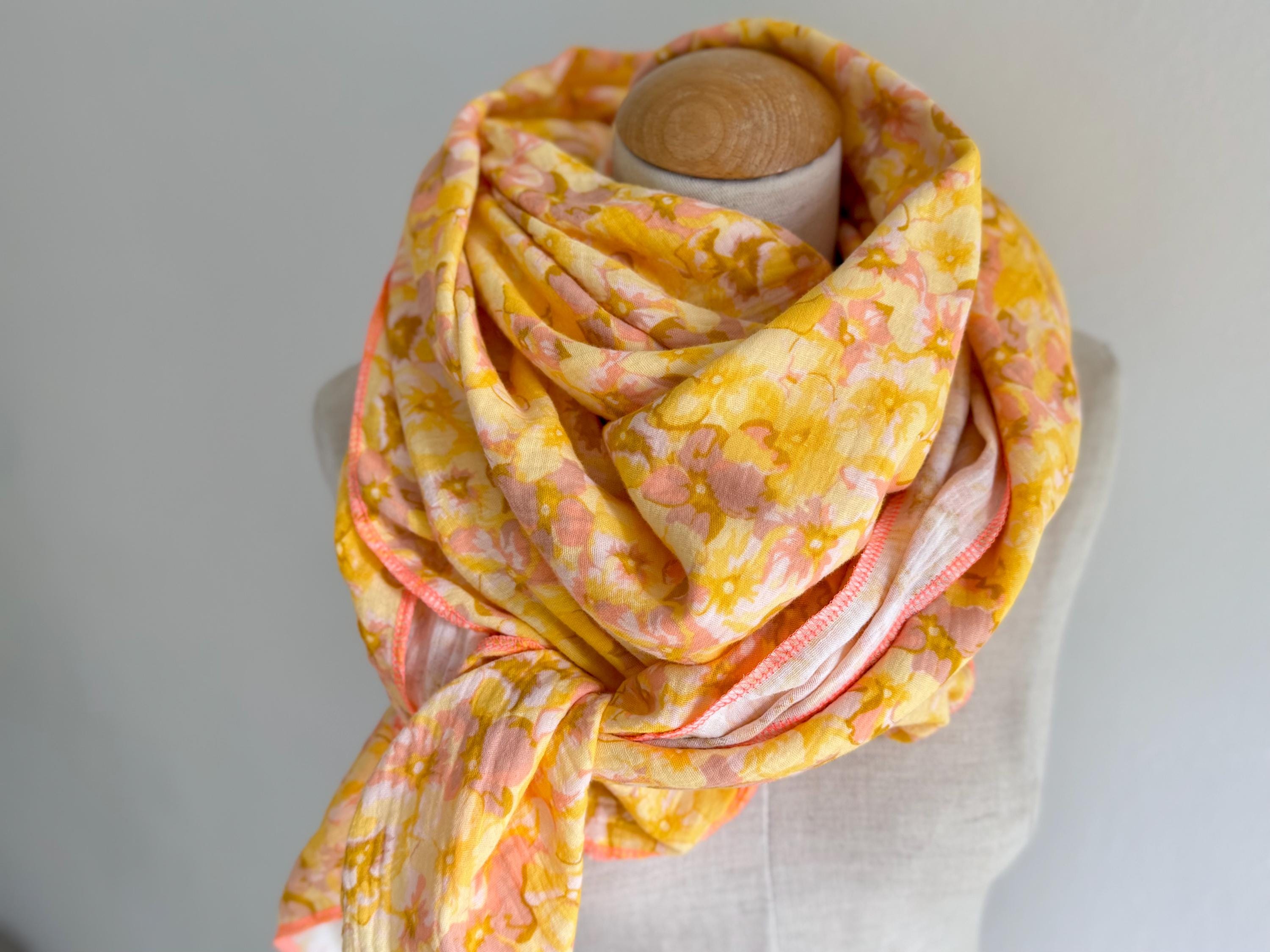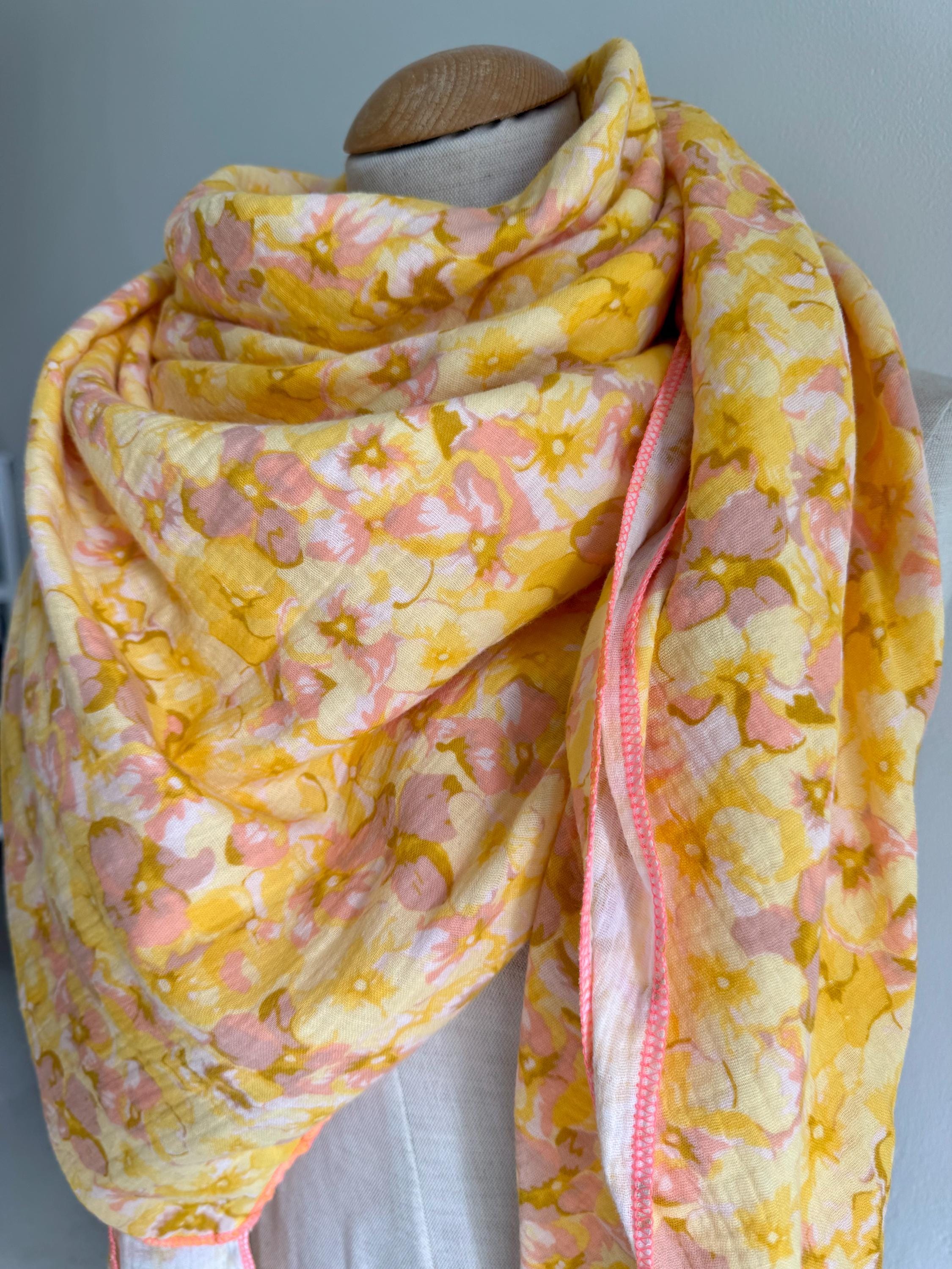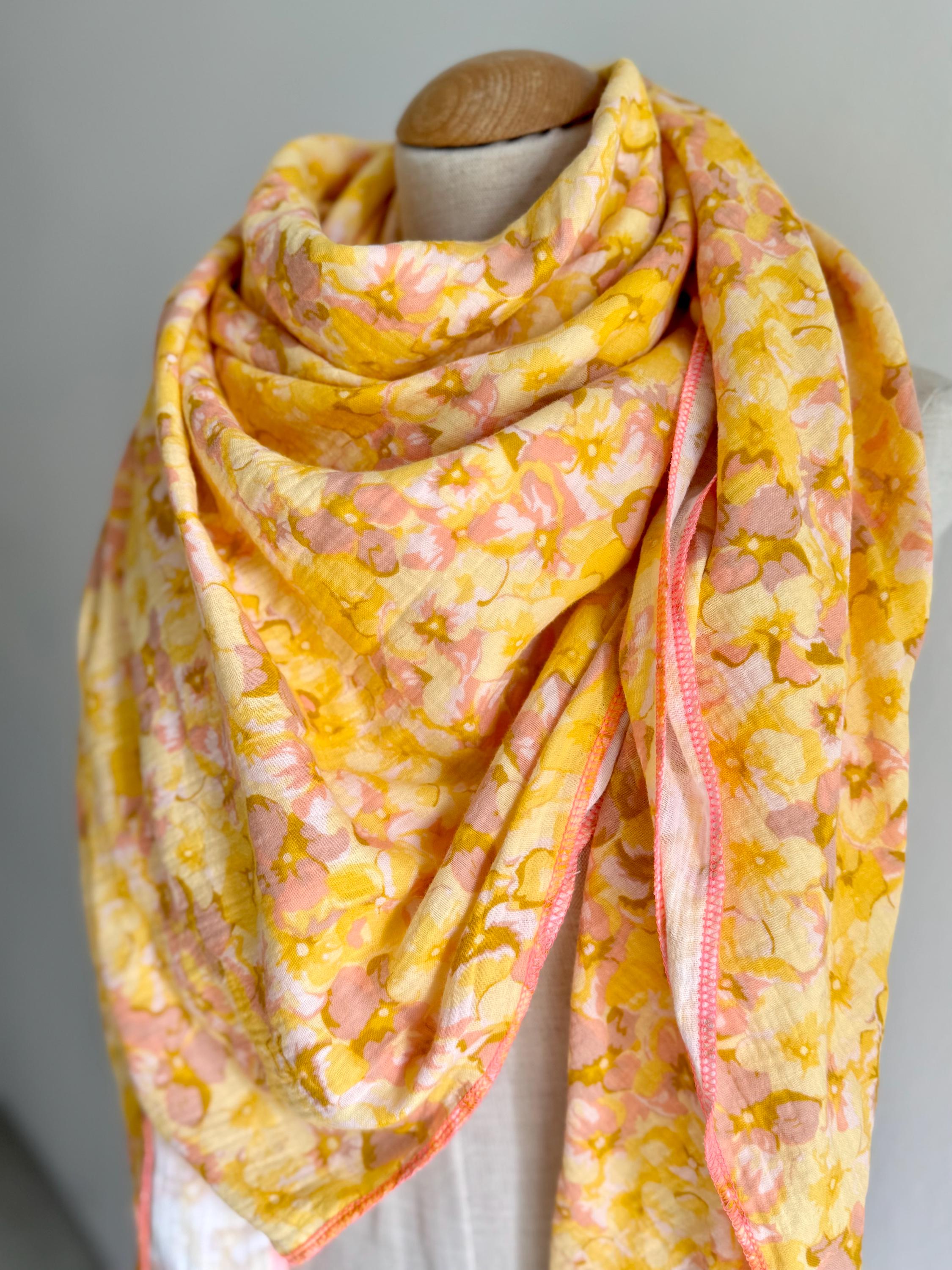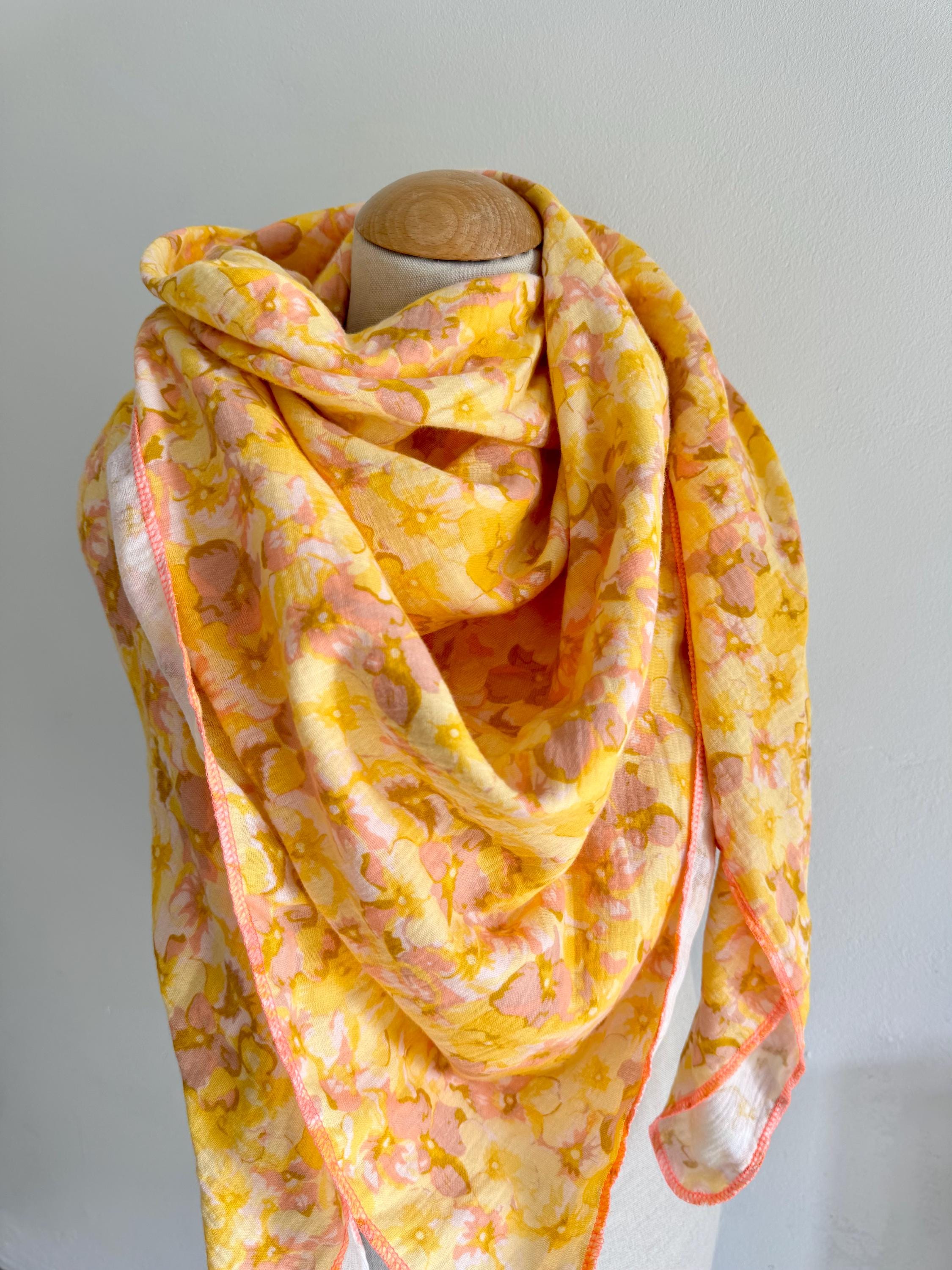 Summer scarf square muslin XXL wrap scarf triangular scarf loop scarf pink yellow pastel flowers cotton scarf stole gift Mother's Day