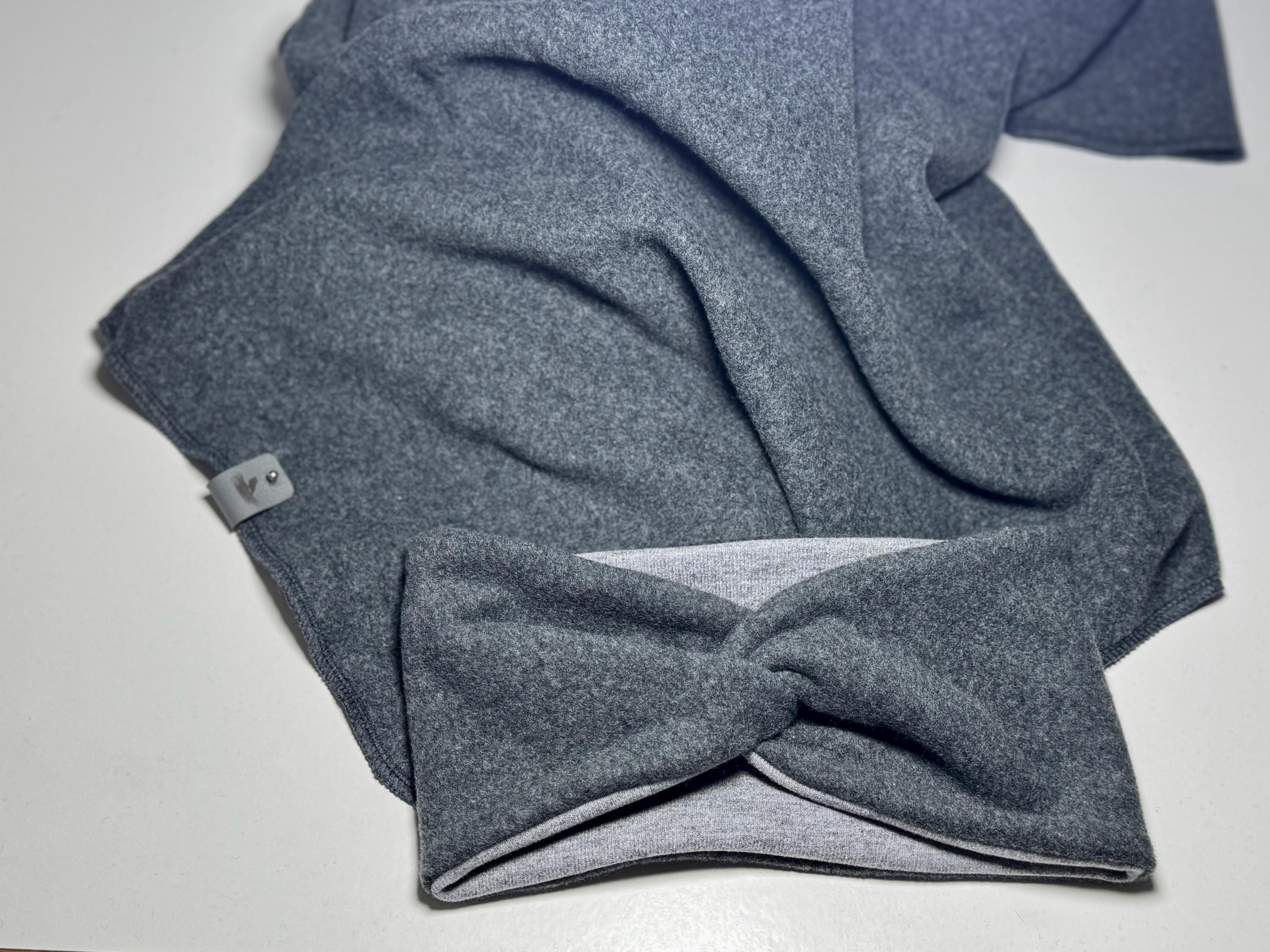 A matching headband is available. It is lined with a fluffy grey jersey.
