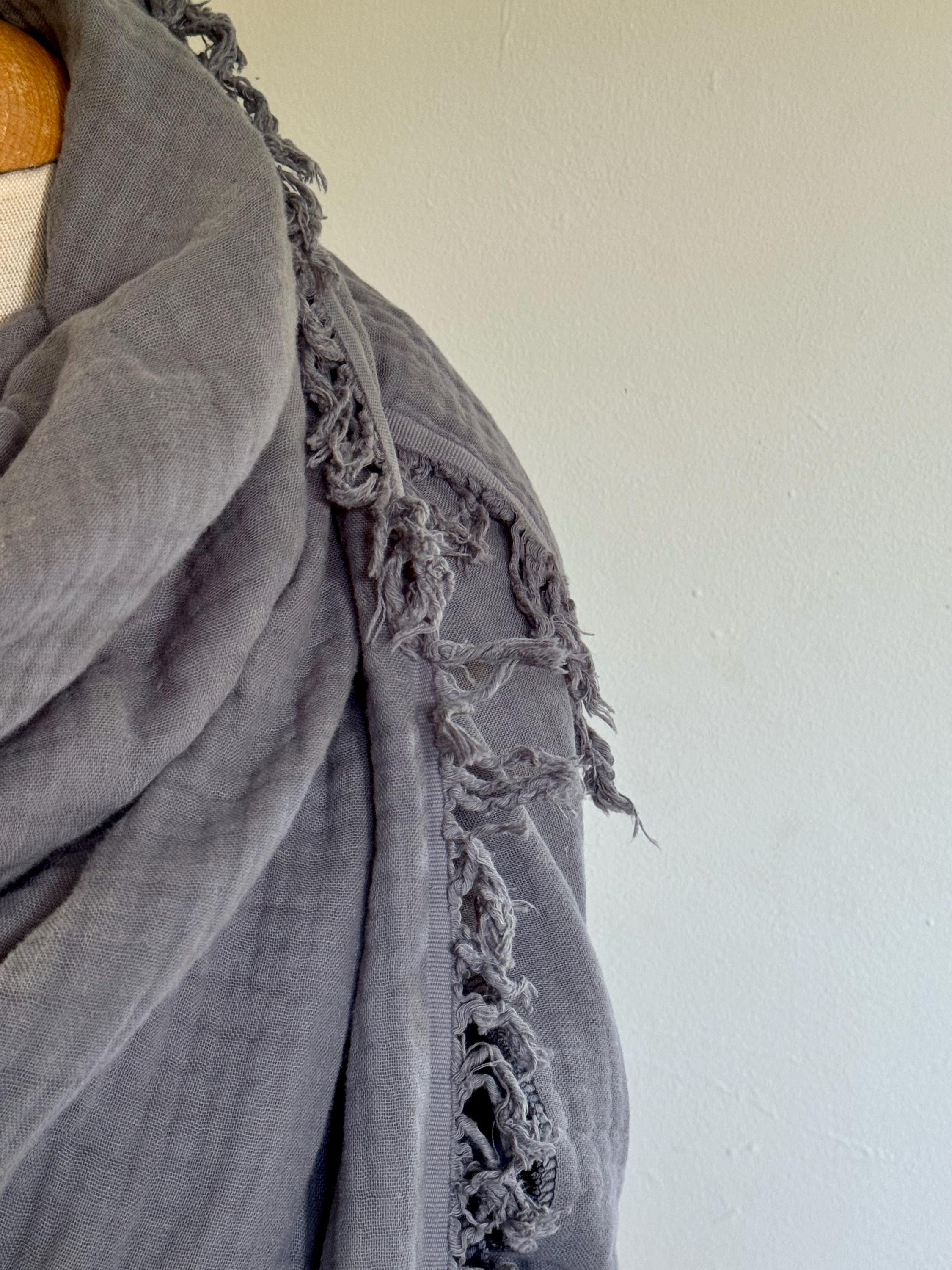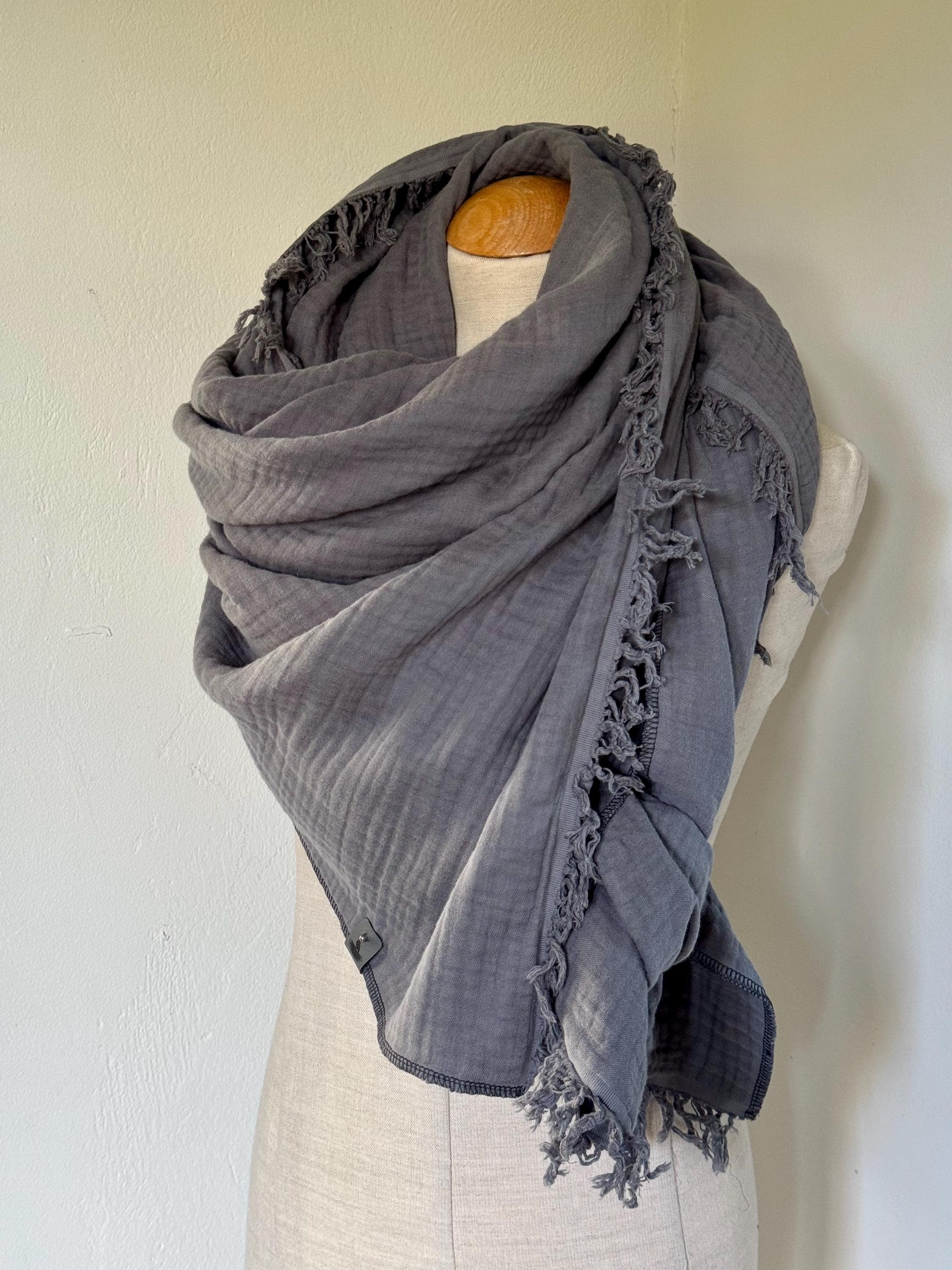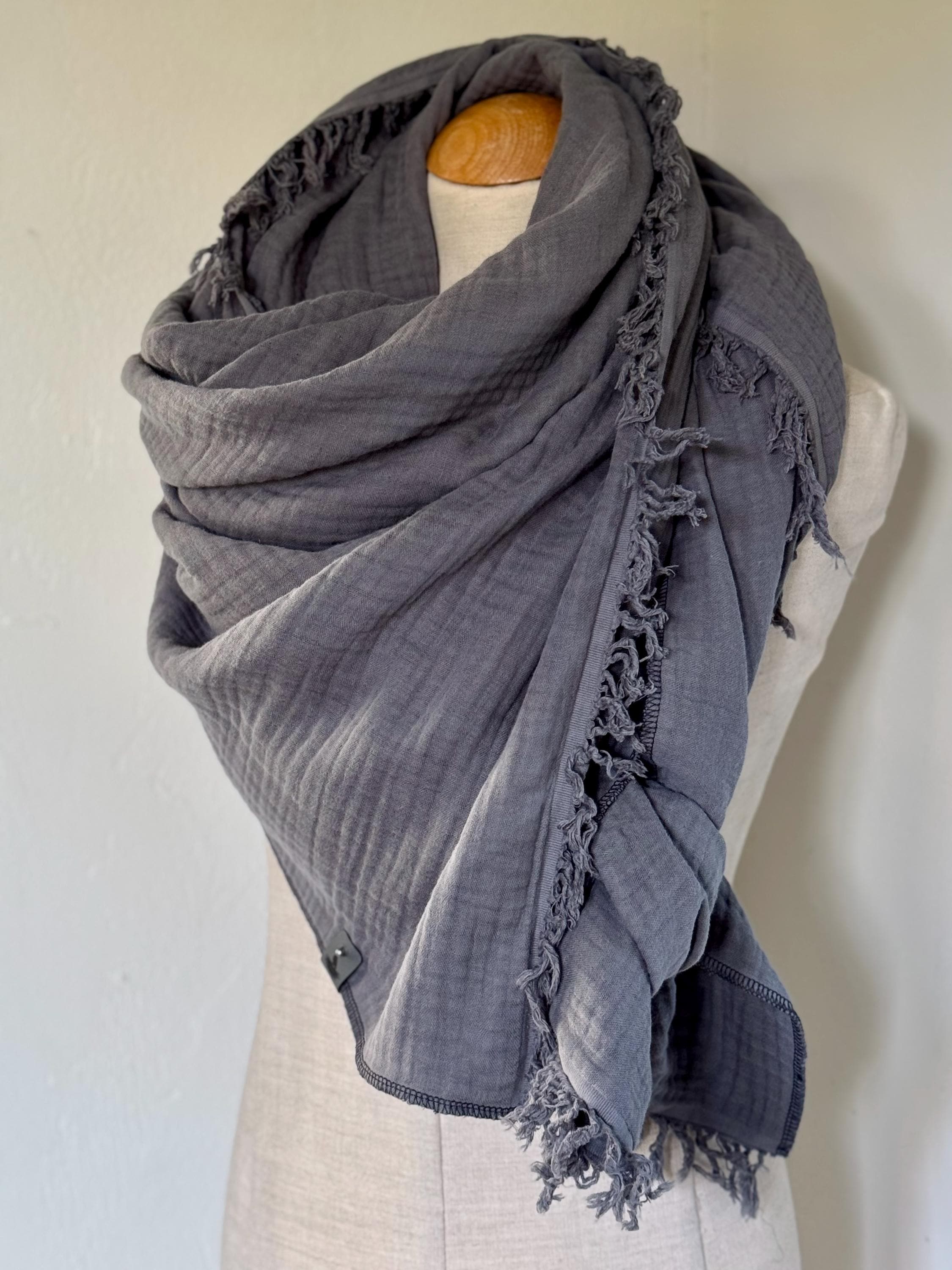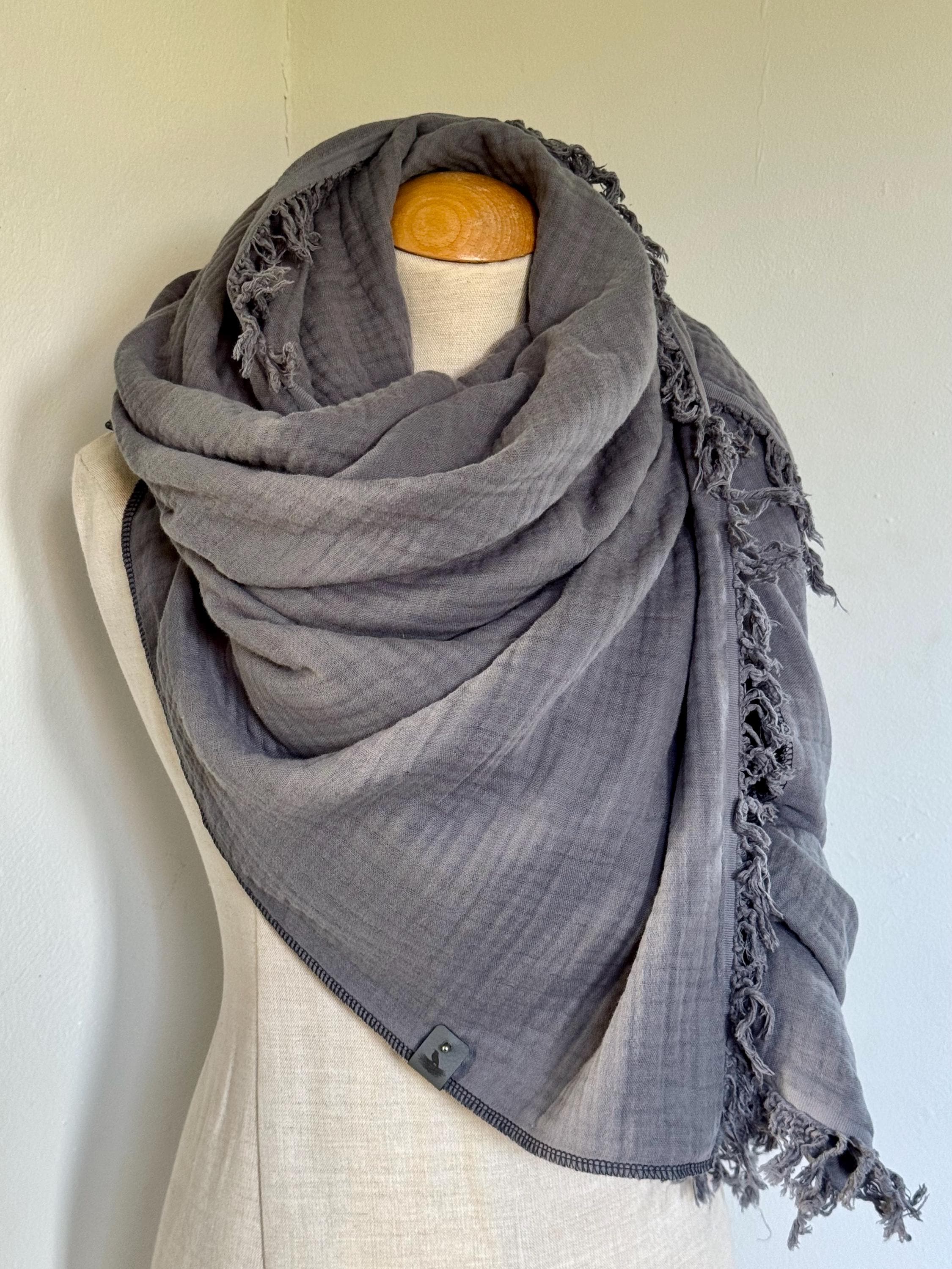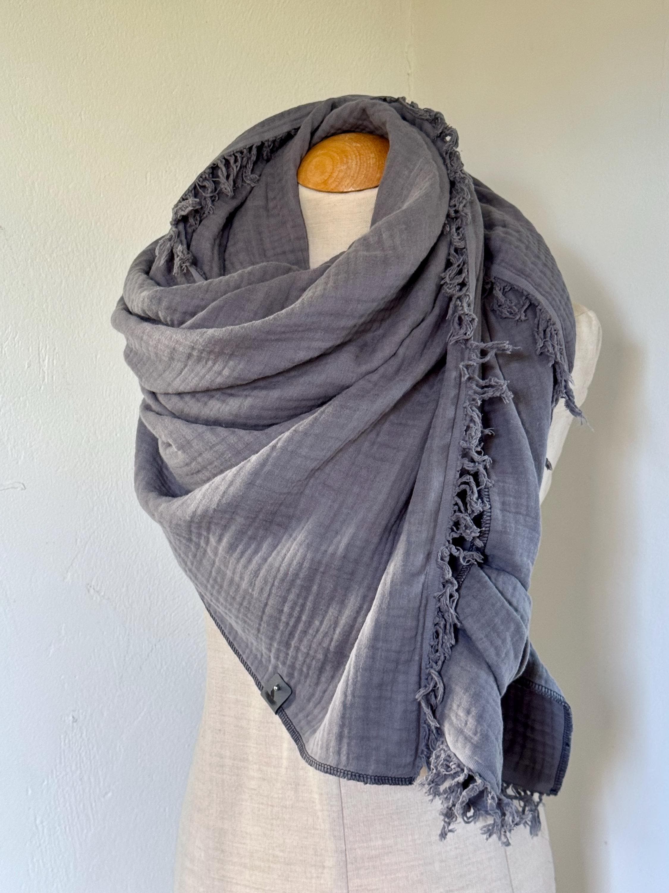 The airy cotton muslin feels wonderfully soft against the skin—perfect for wrapping, cozying, and layering. Whether as a wrap scarf, summer shawl, stole, or large triangular scarf—this scarf is a true favorite for every season.