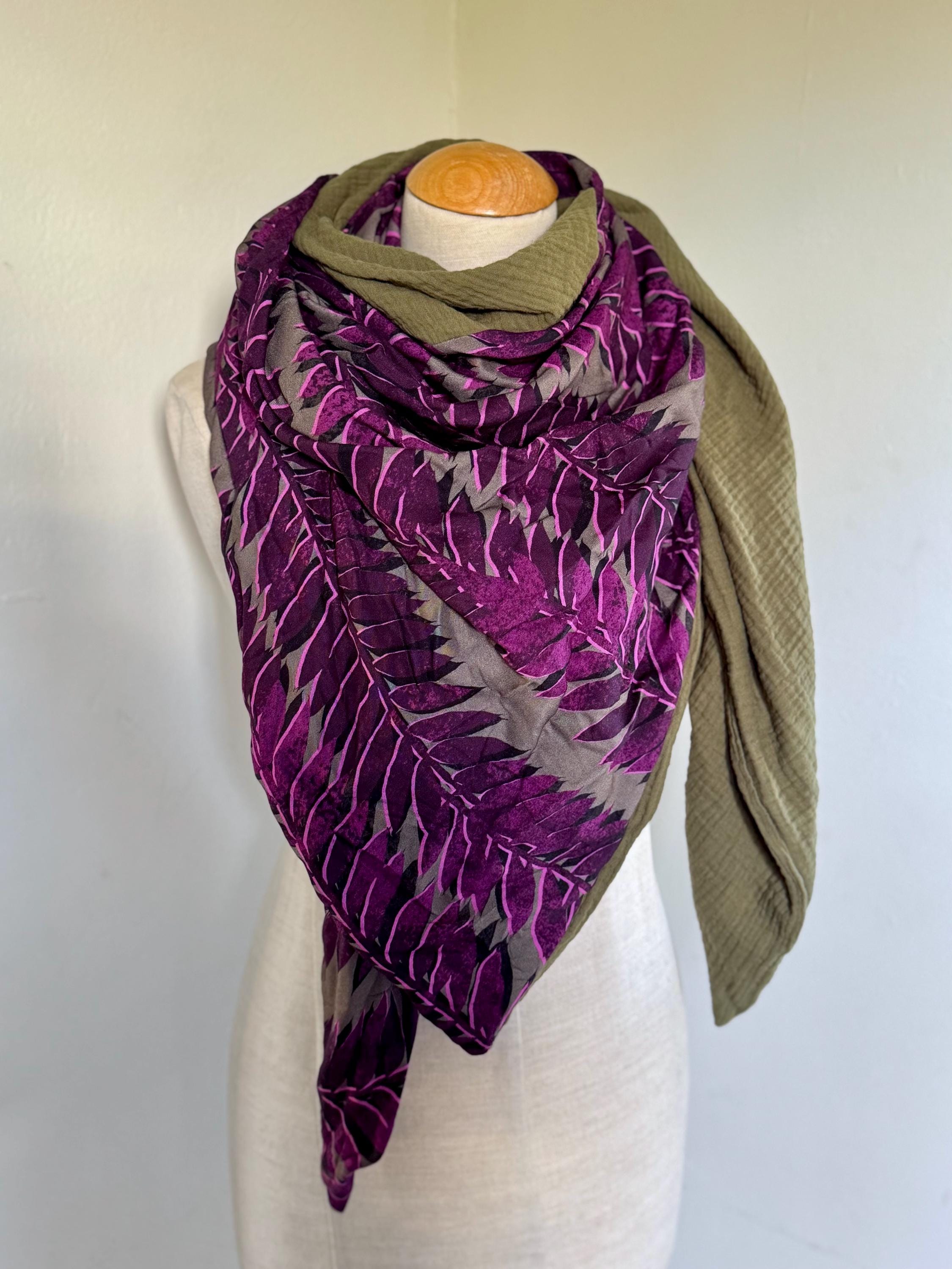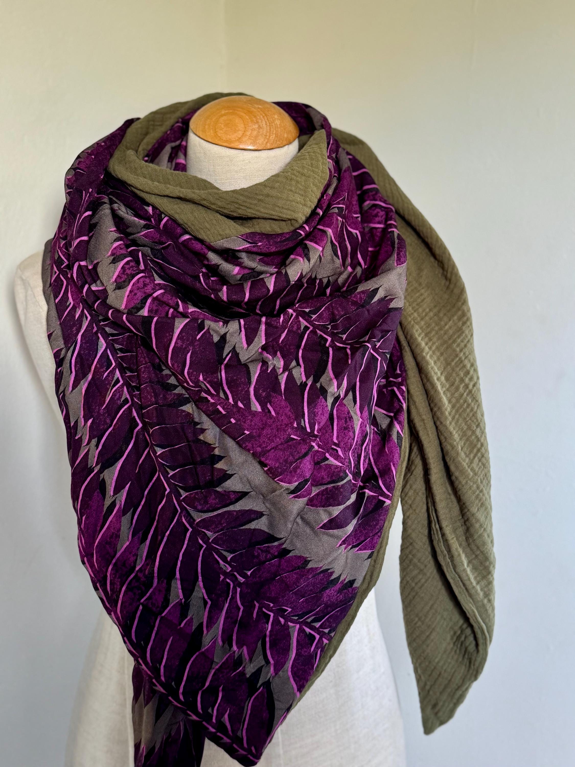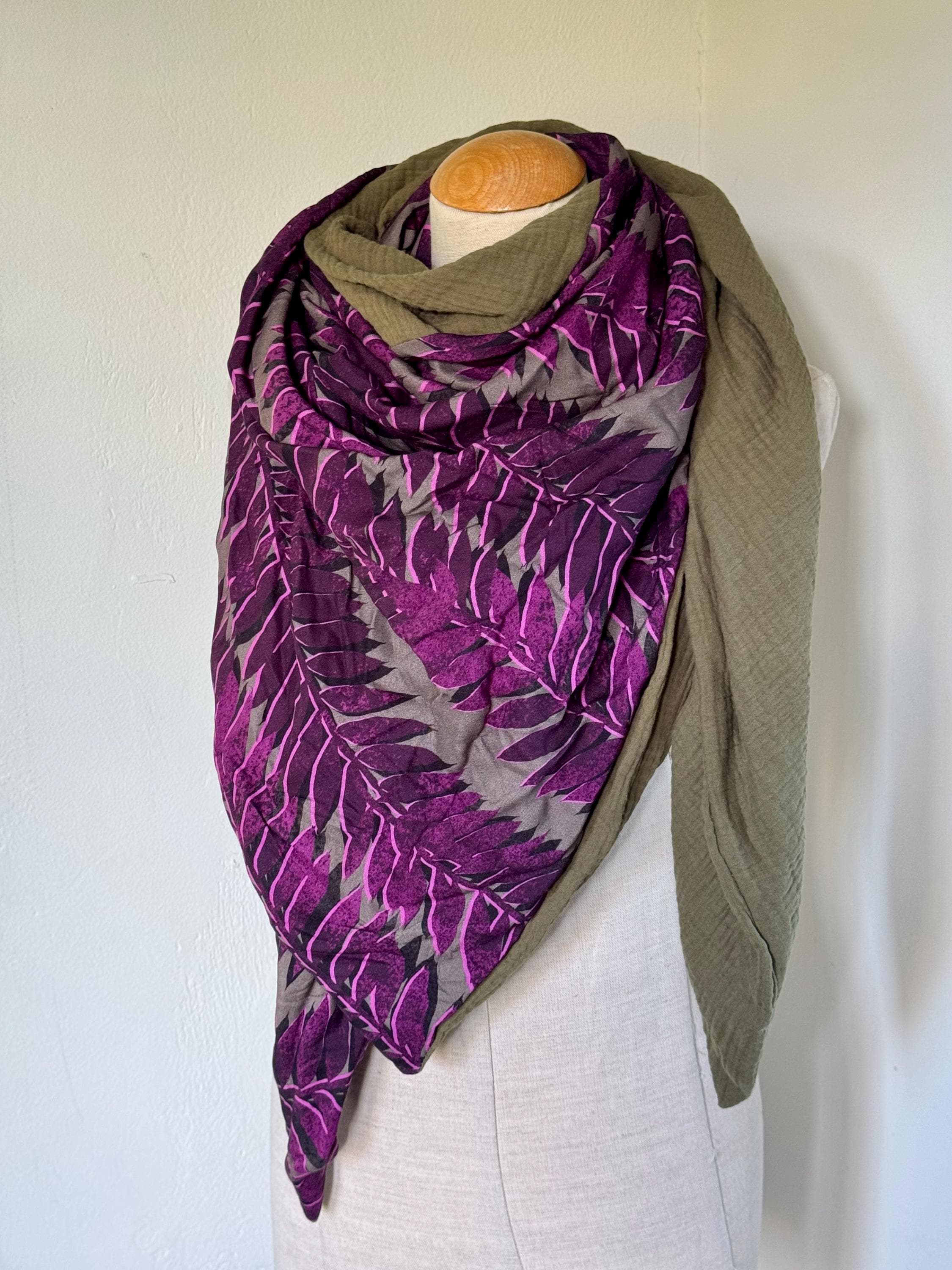 This handmade triangular scarf is a real eye-catcher! A sophisticated viscose print with a beautiful leaf motif in purple and fuchsia is combined with a soft, khaki muslin fabric – a harmonious interplay of color, texture, and comfort.