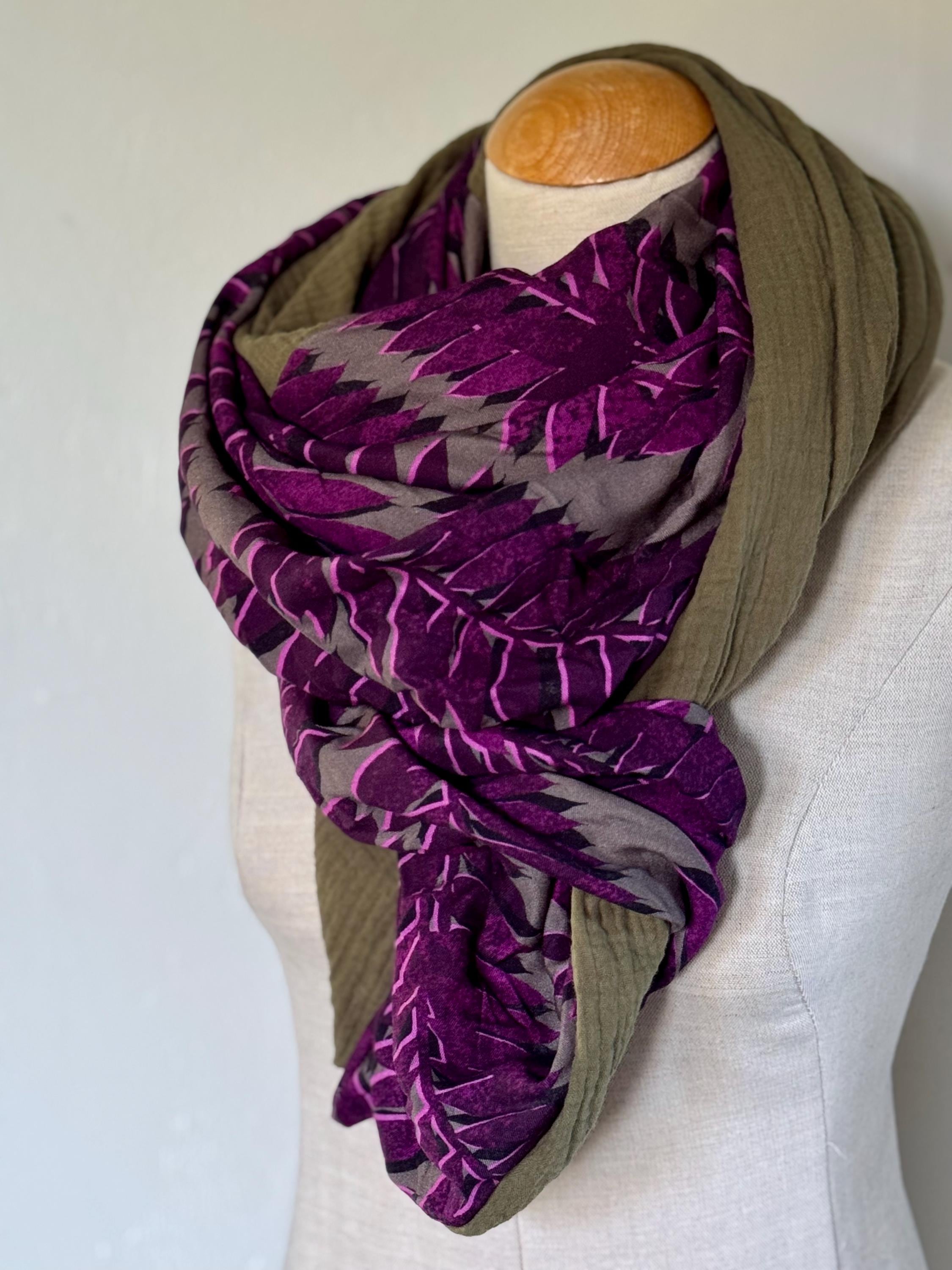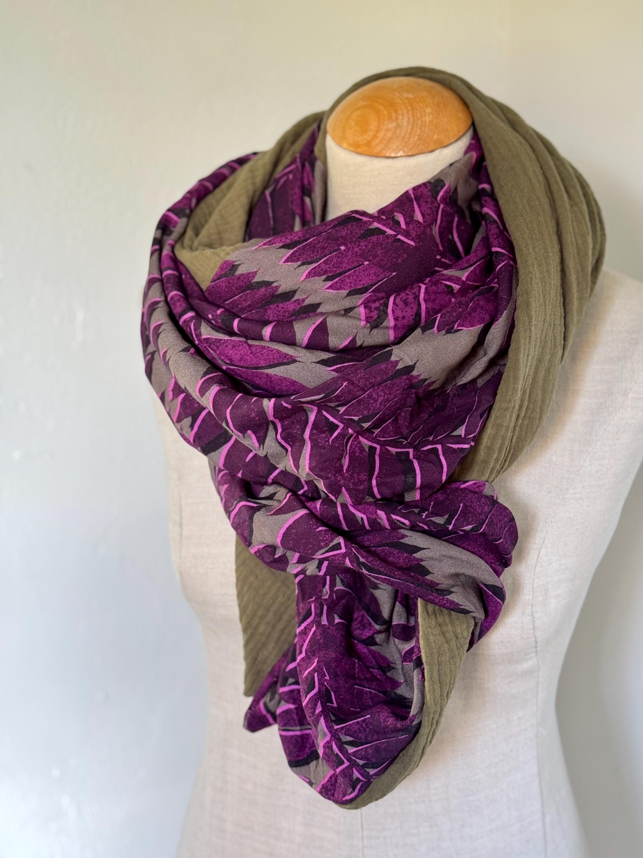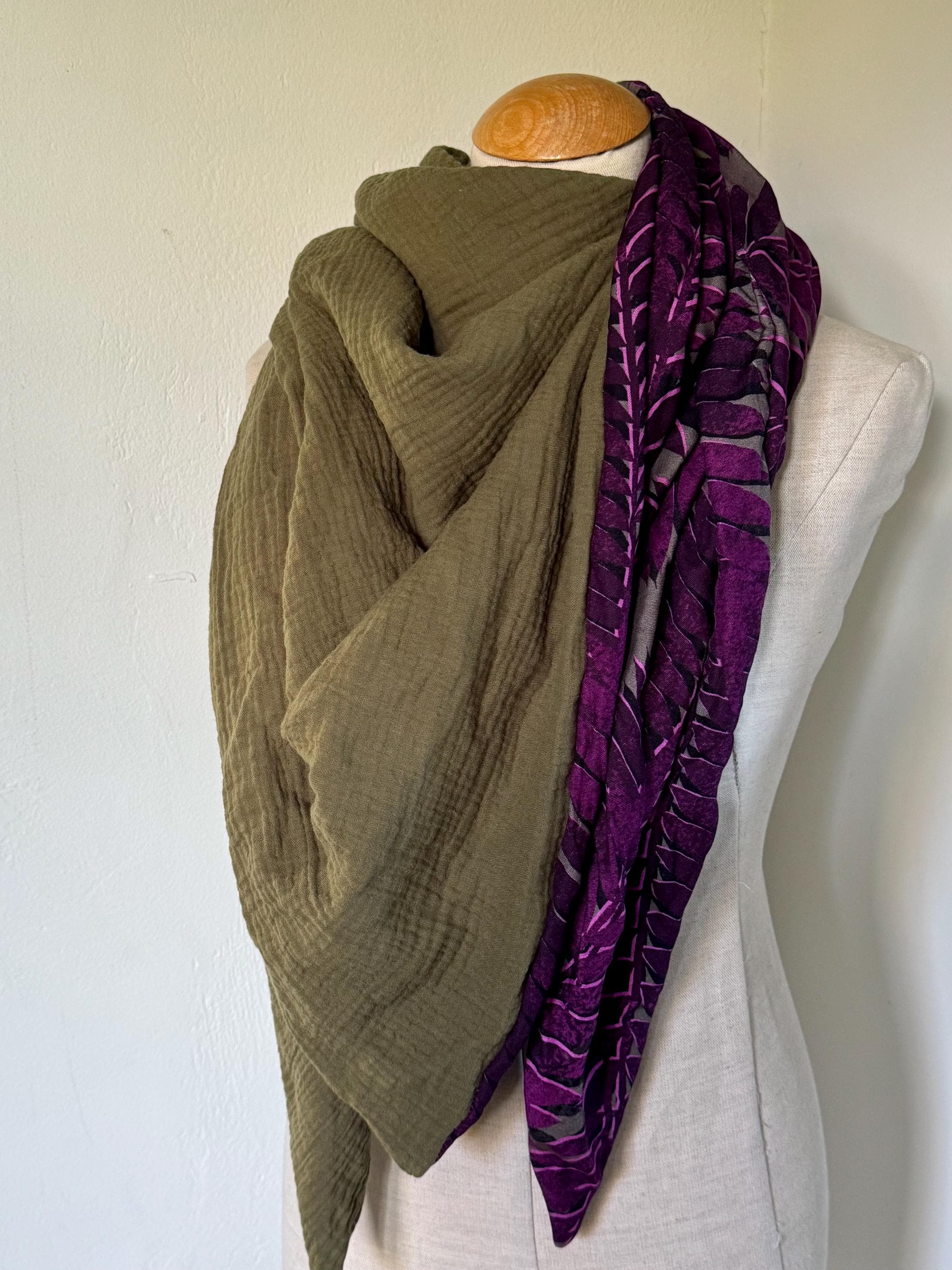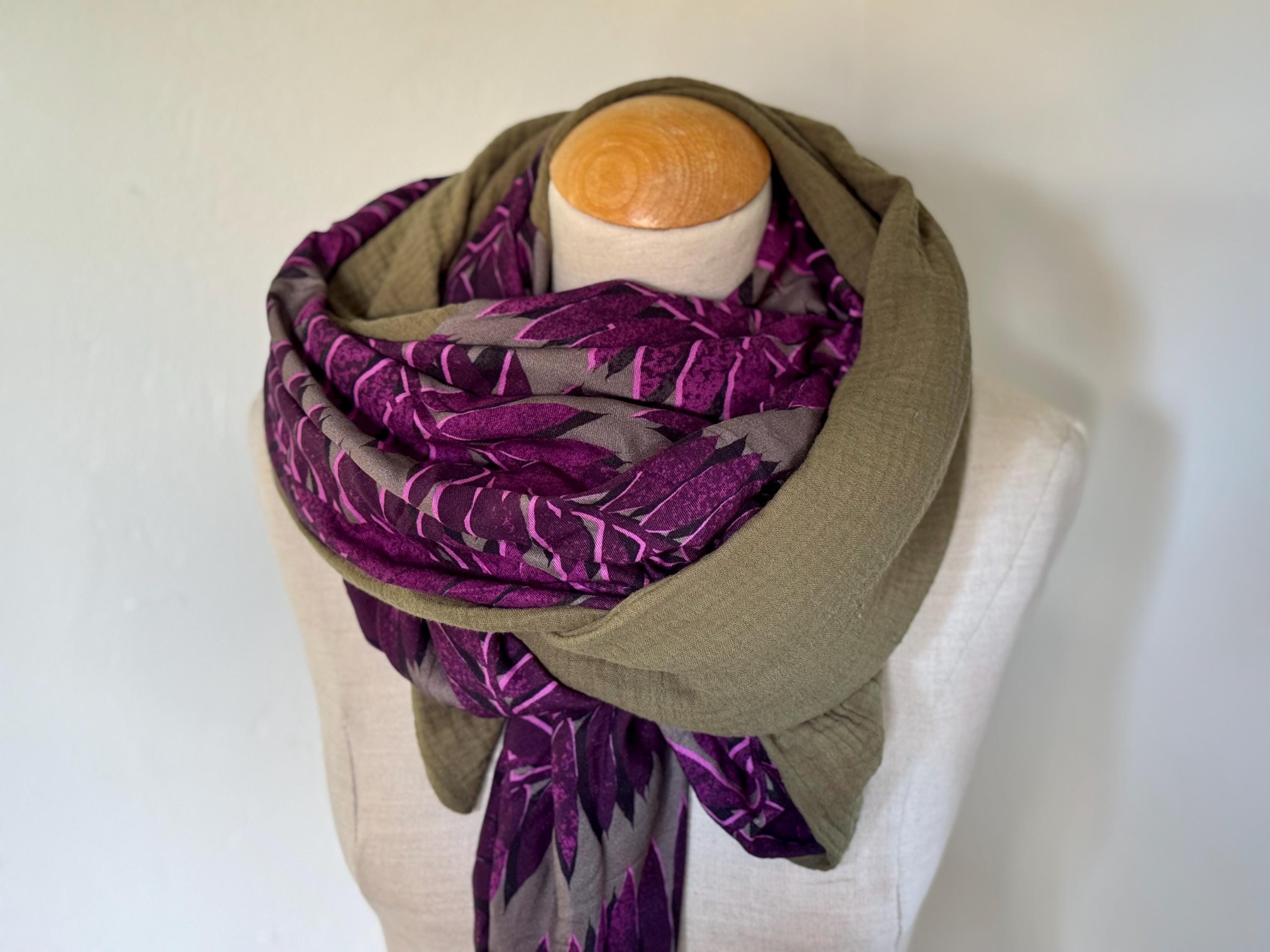 This handmade triangular scarf is a real eye-catcher! A sophisticated viscose print with a beautiful leaf motif in purple and fuchsia is combined with a soft, khaki muslin fabric – a harmonious interplay of color, texture, and comfort.