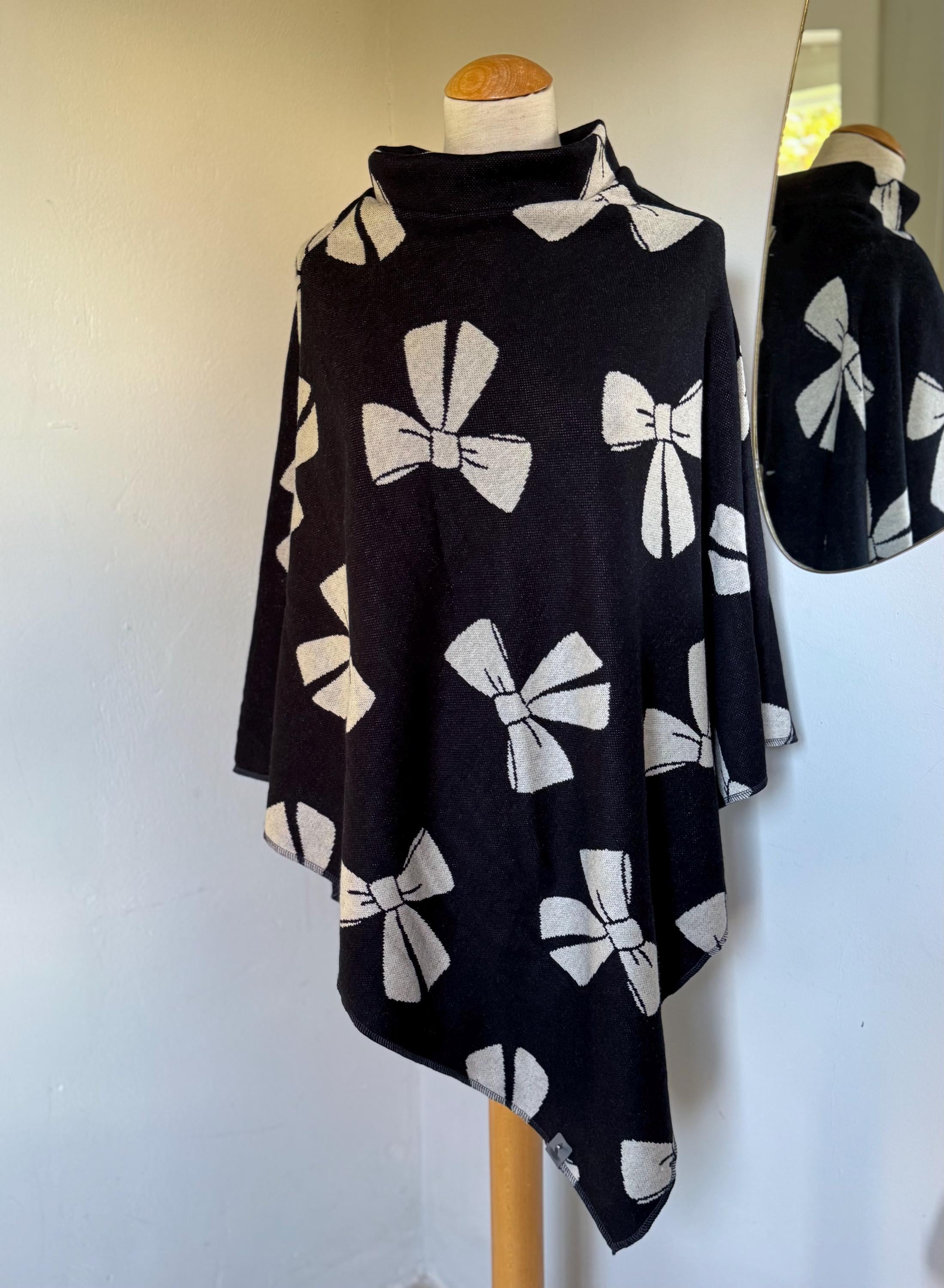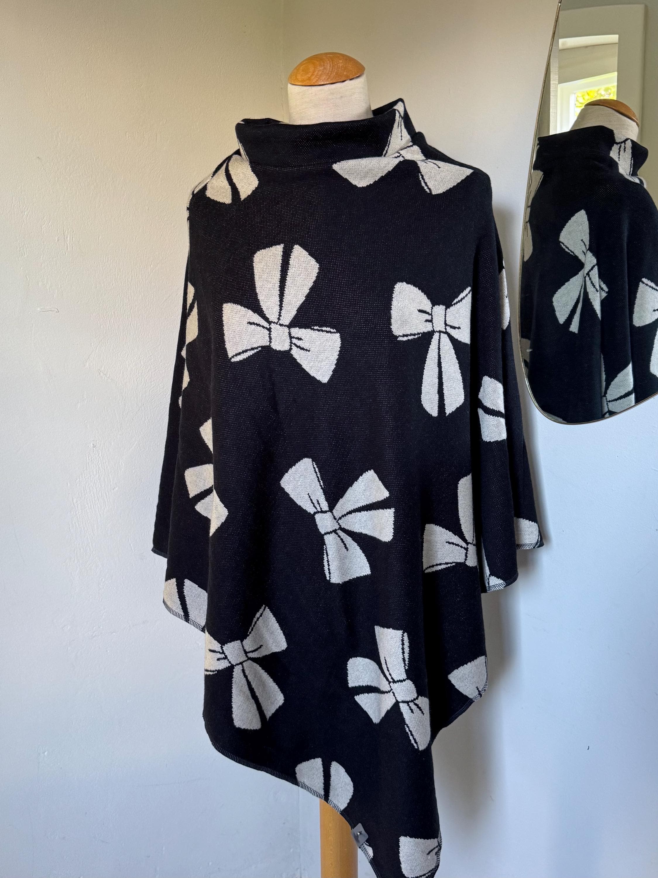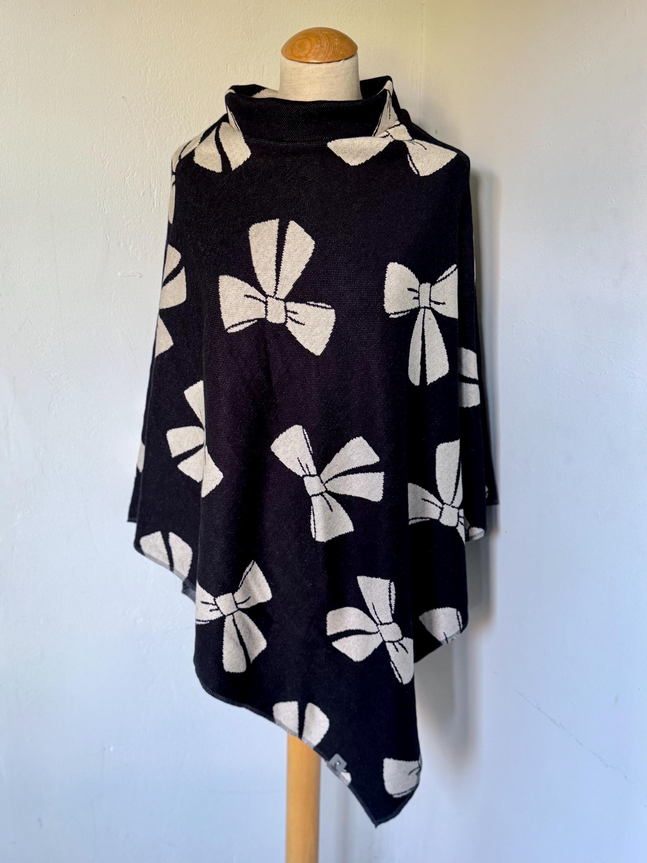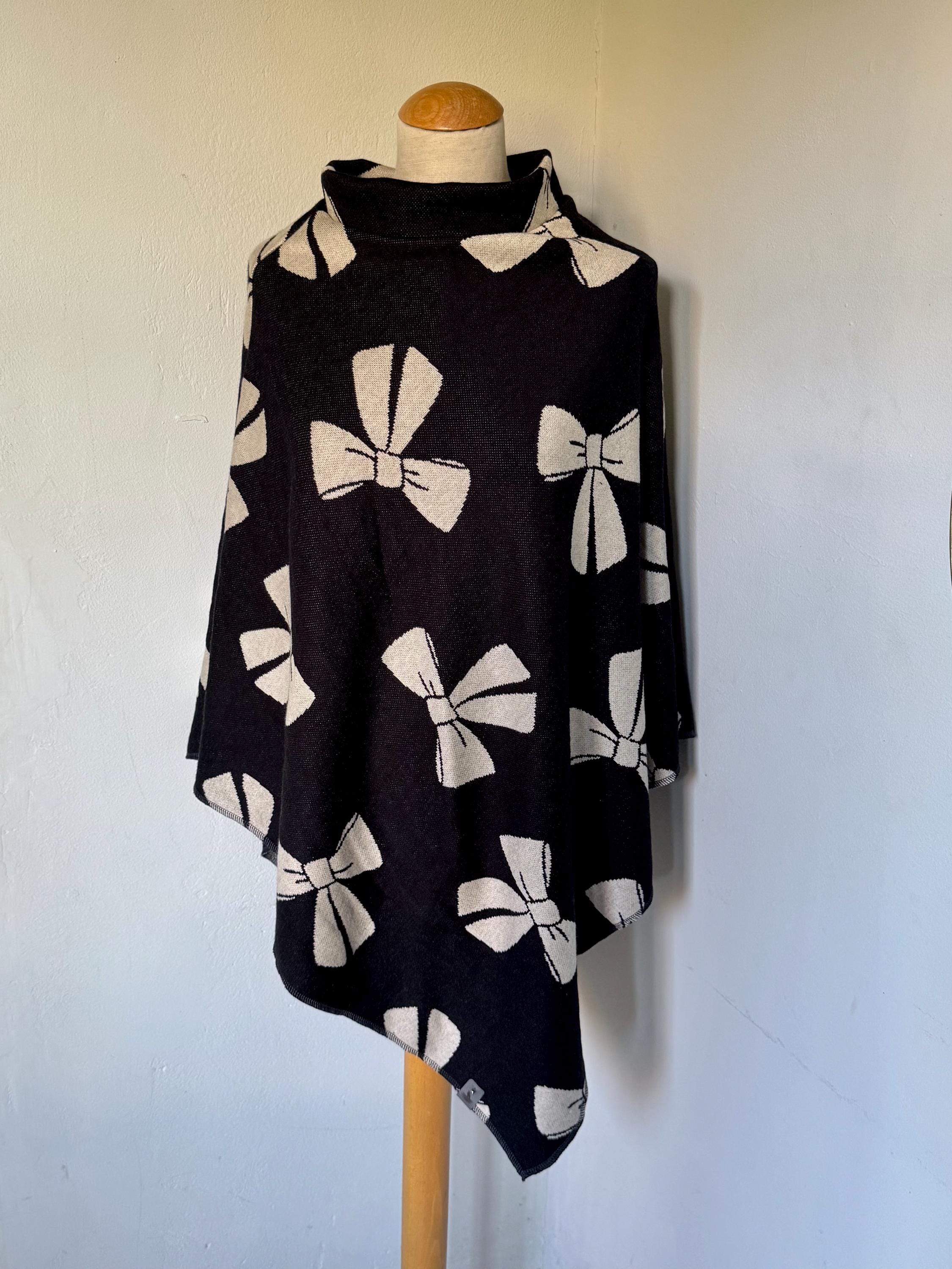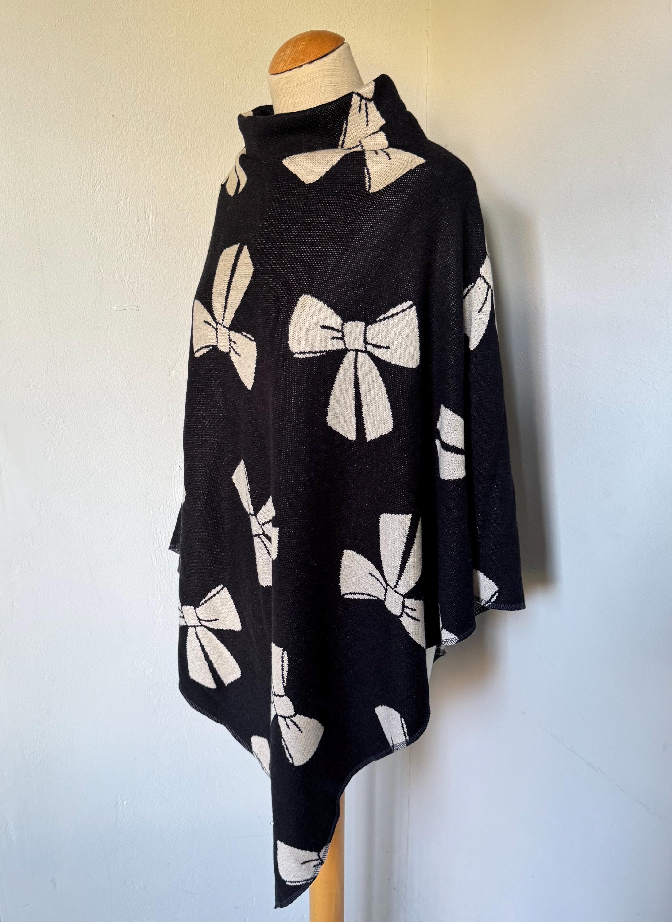 🖤 Jacquard Knit Poncho Black with Bow Pattern – Soft, Elegant & Stylish