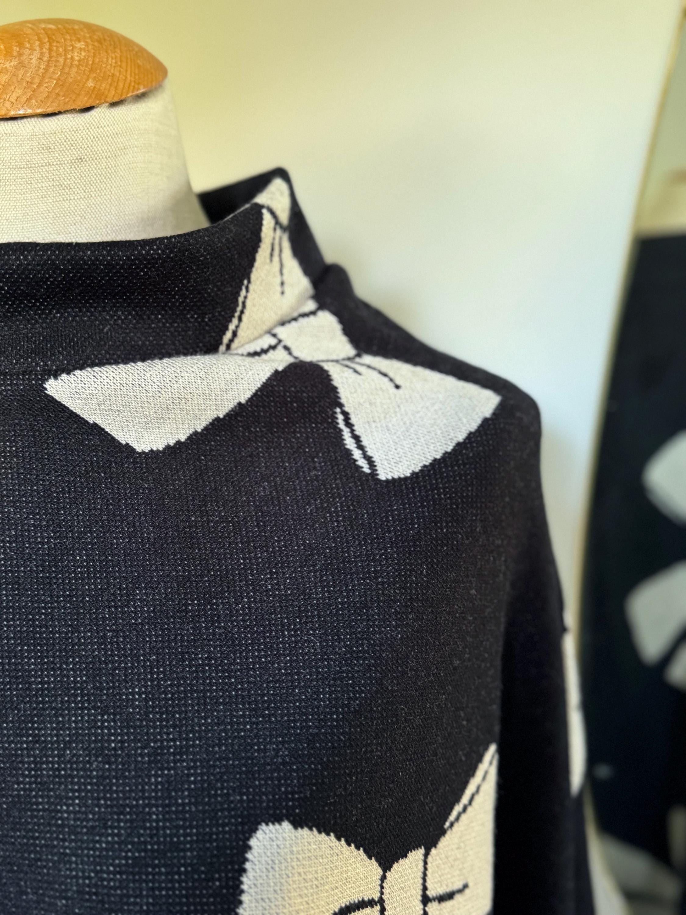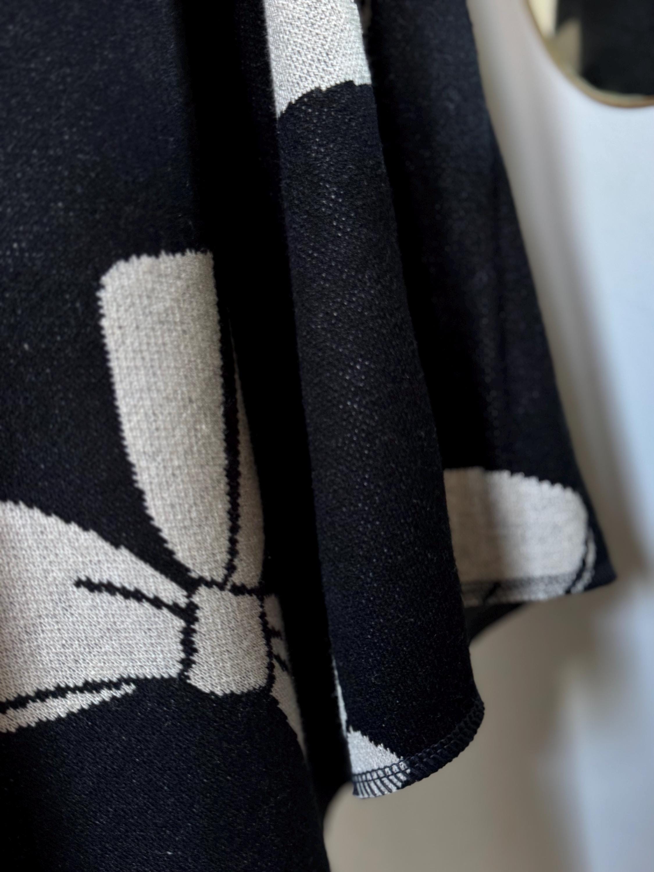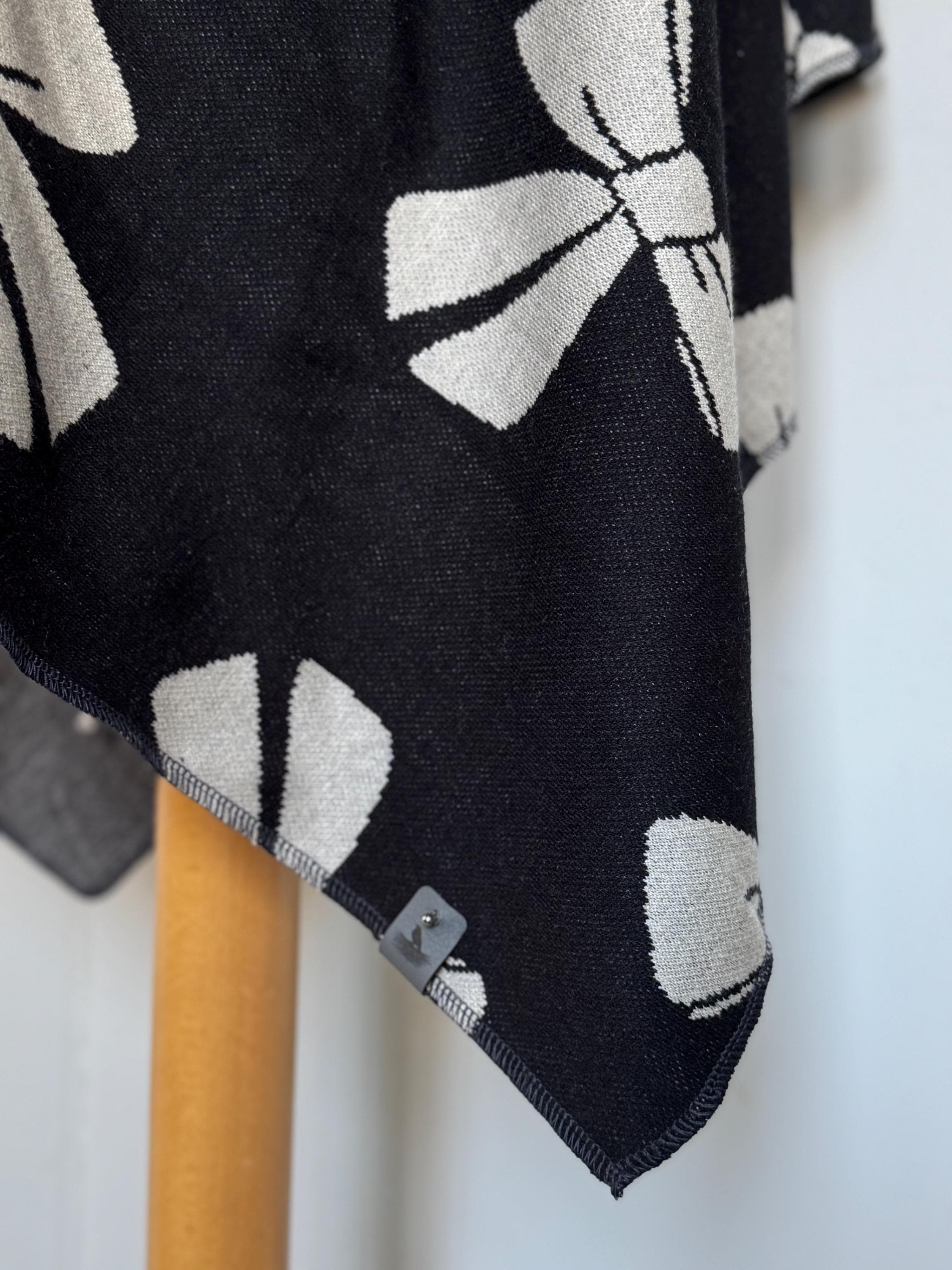 This black Jacquard knit poncho with a large bow design is a true statement piece – feminine, timeless, and wonderfully soft. The classic black and cream color combination adds an elegant touch, making it a versatile accessory for any season.
