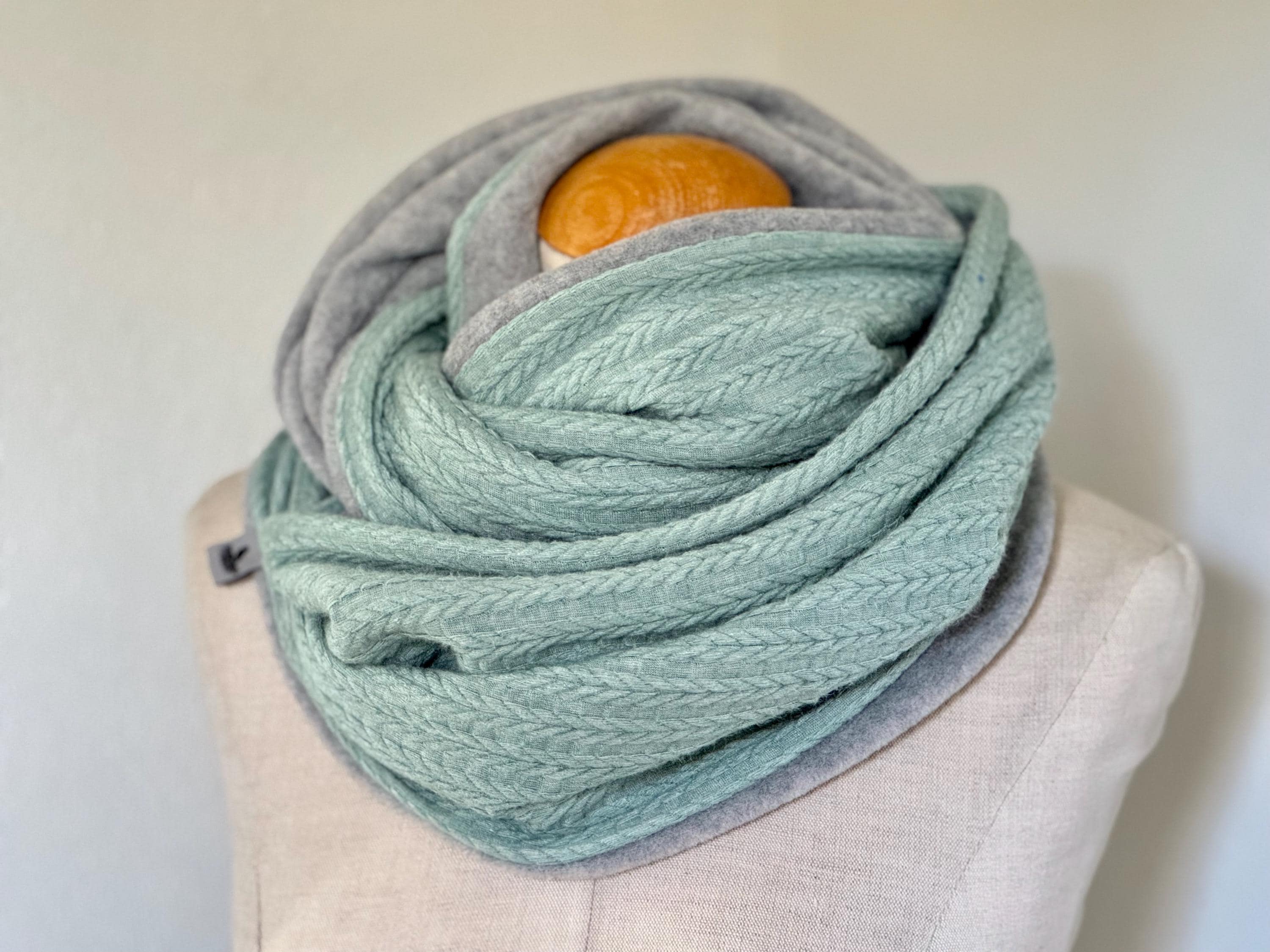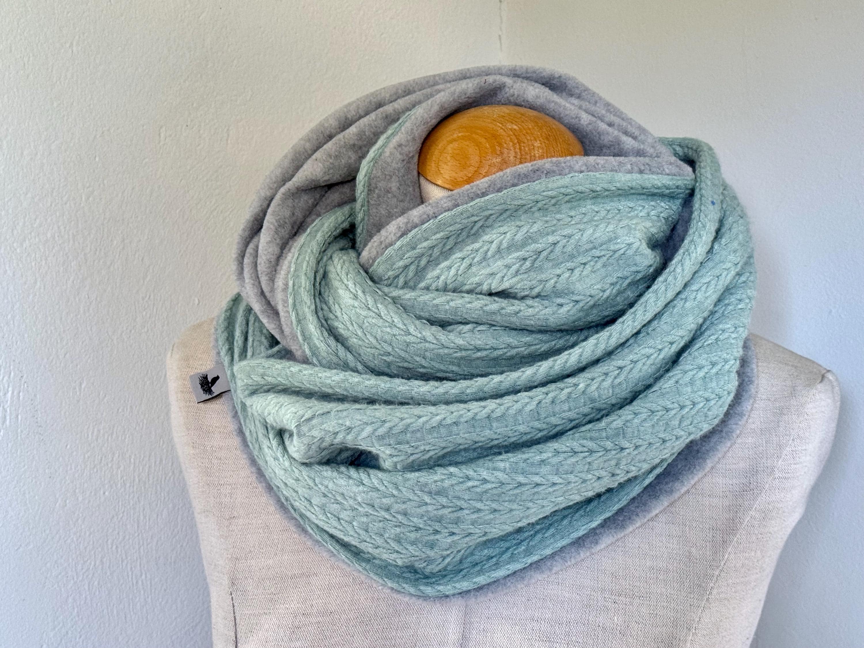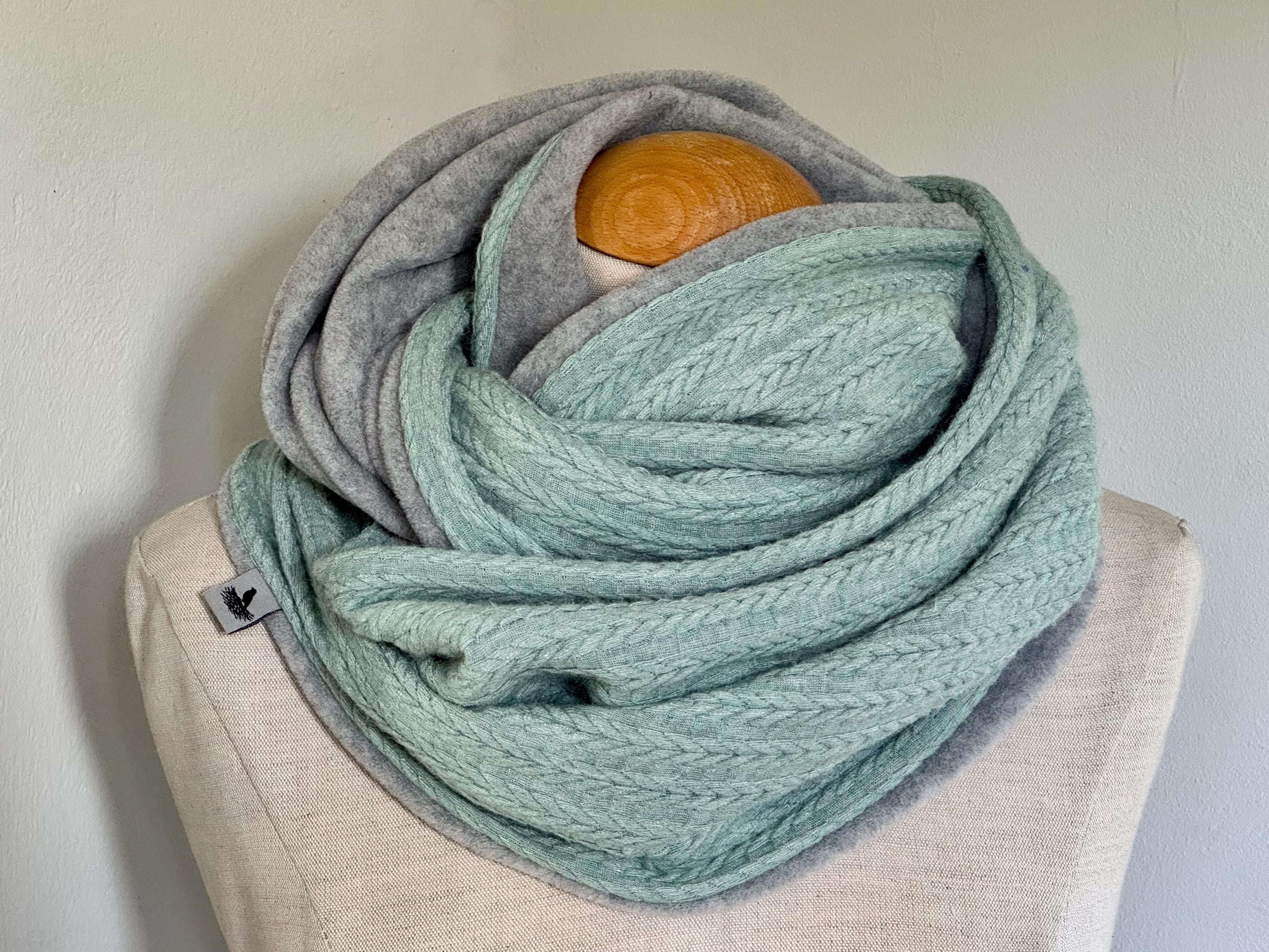 One side features a beautiful green cable-knit fabric, while the other features a light gray, fluffy fleece fabric that will keep you comfortably warm. The loop scarf can be wrapped twice around the neck and nestles softly against your skinâperfect for fall and winter, or simply for anyone who loves a cozy feel.