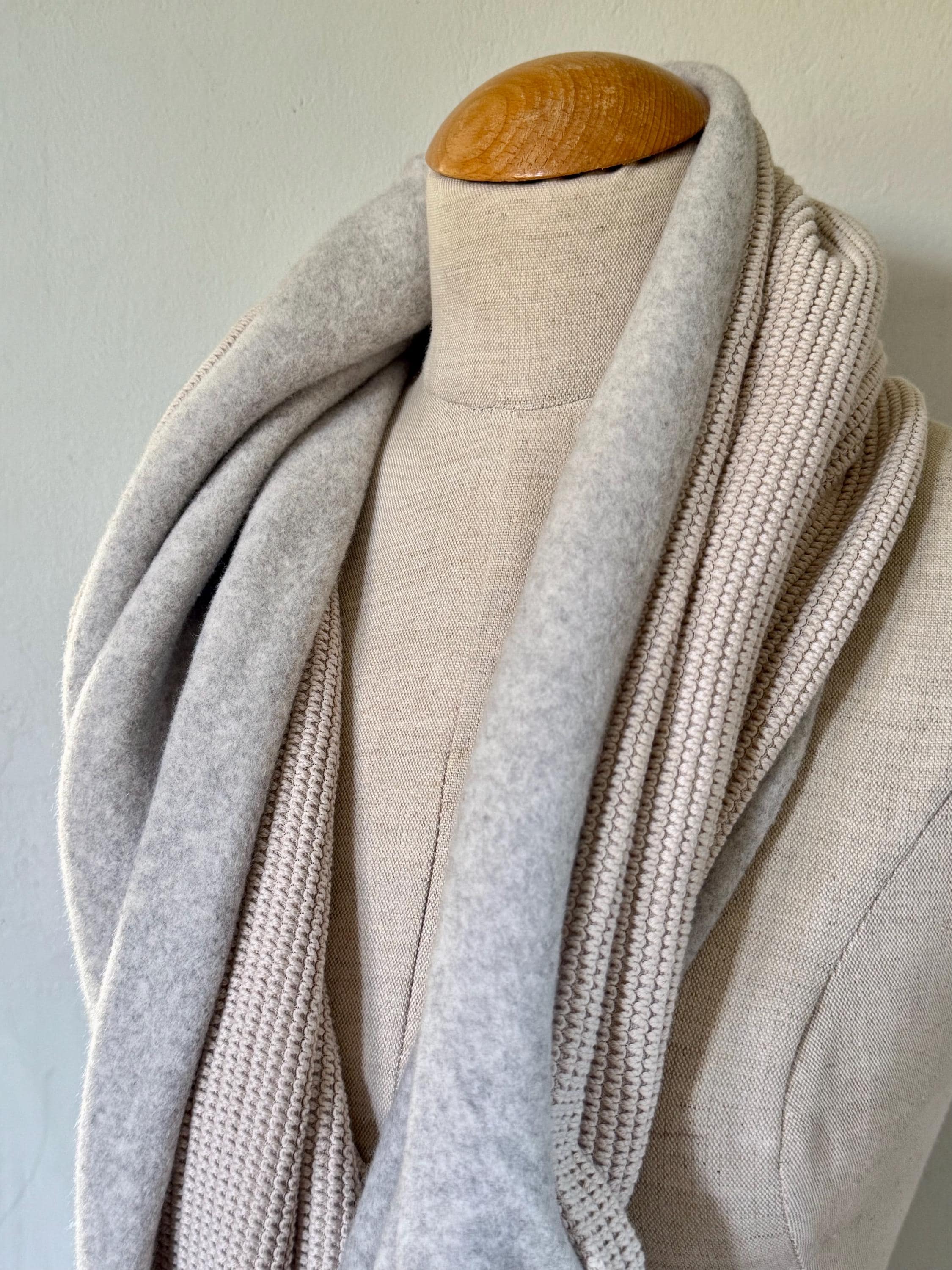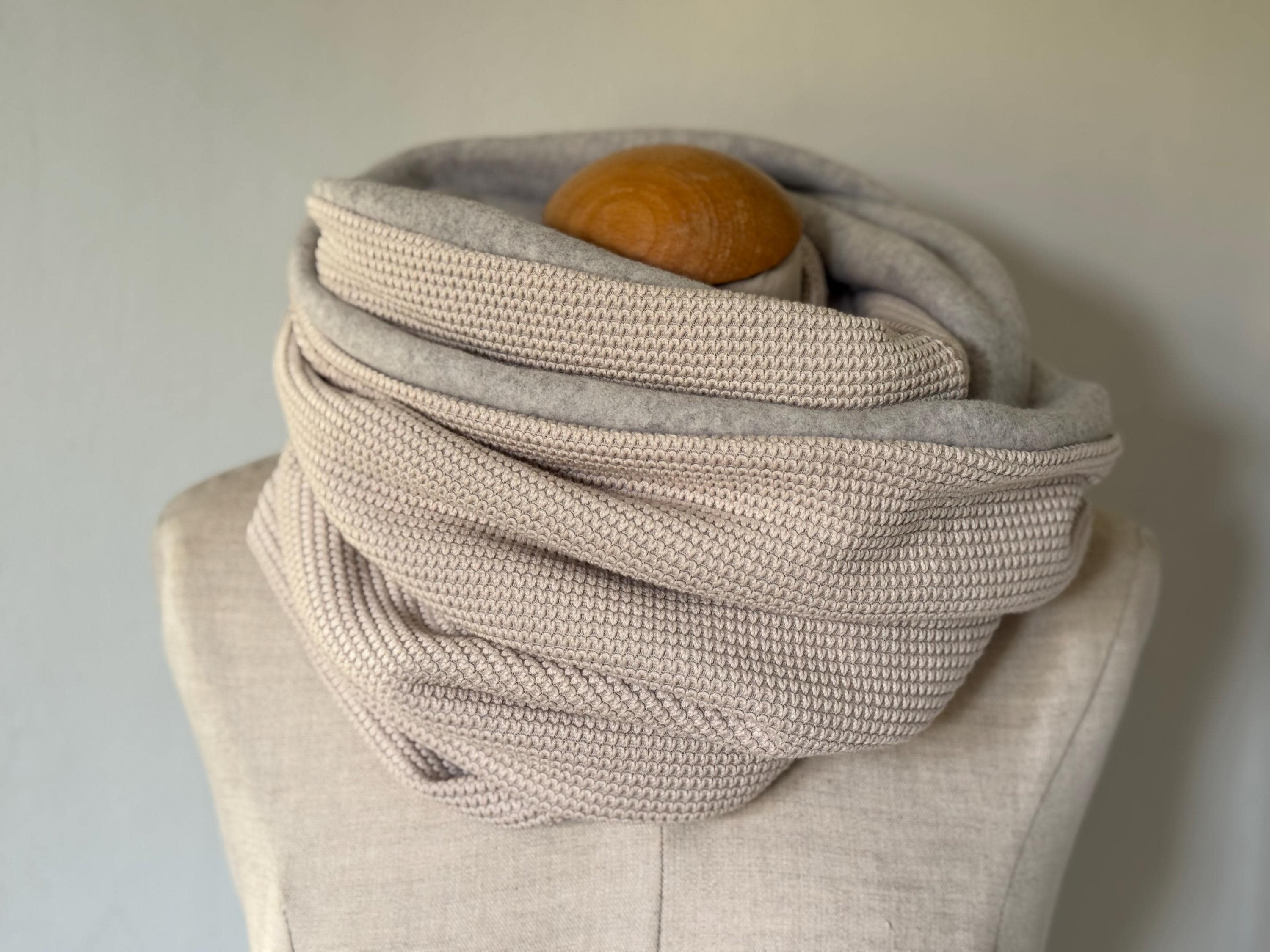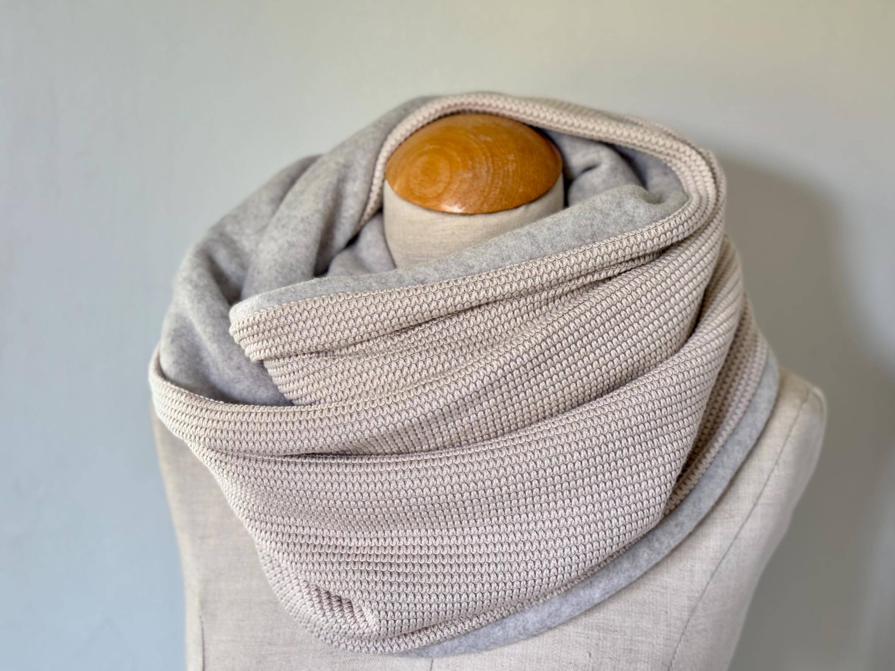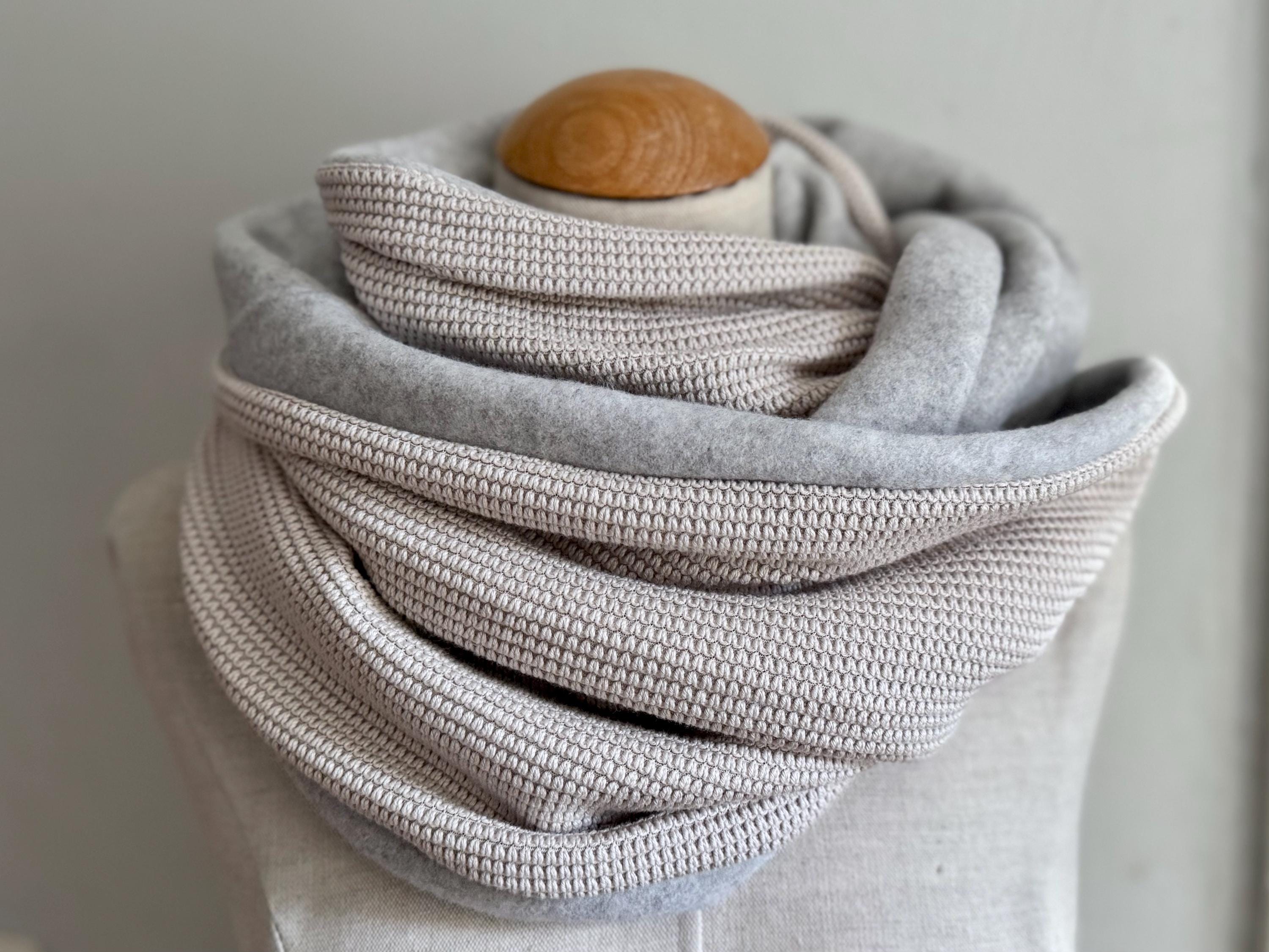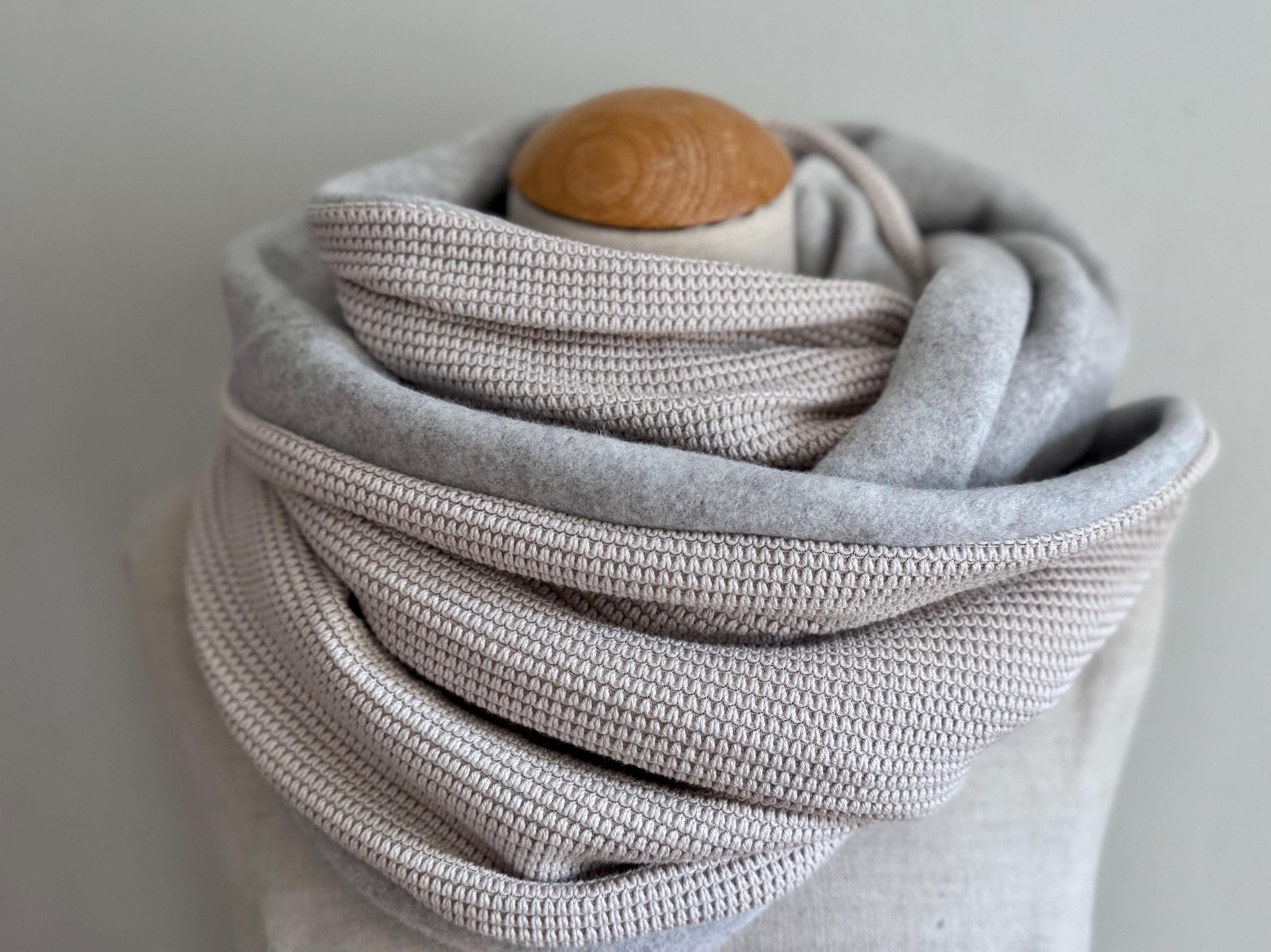 One side features a beautiful knit fabric, while the other features a light gray, fluffy organic cotton fleece that will keep you pleasantly warm. The loop scarf can be wrapped twice around the neck and nestles softly against your skin – perfect for fall and winter, or simply for anyone who loves coziness.
