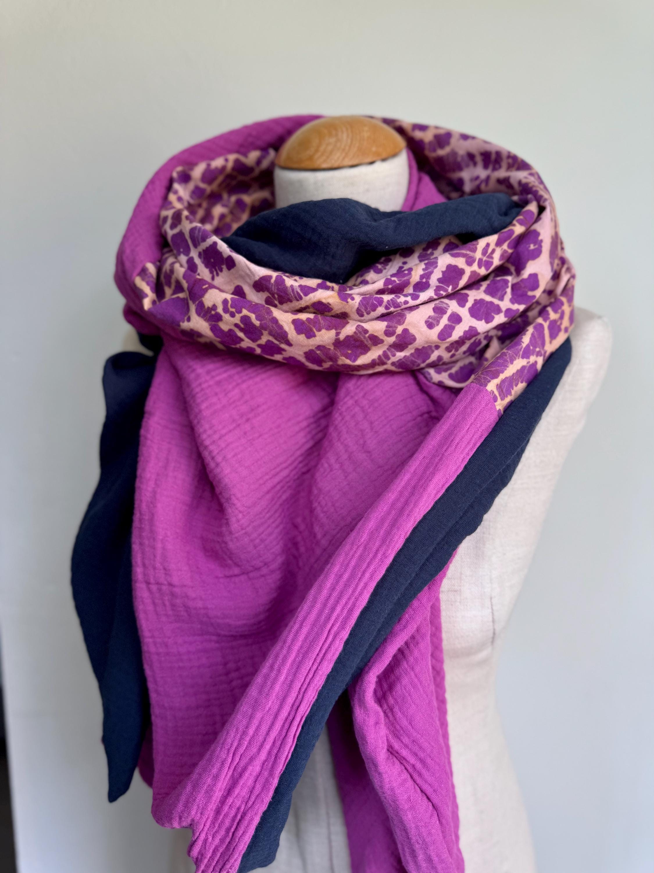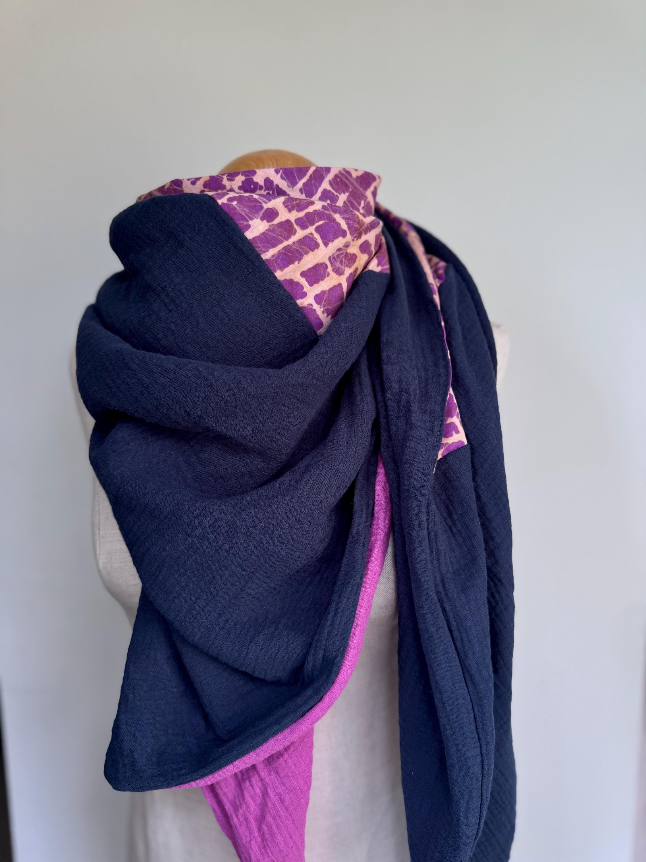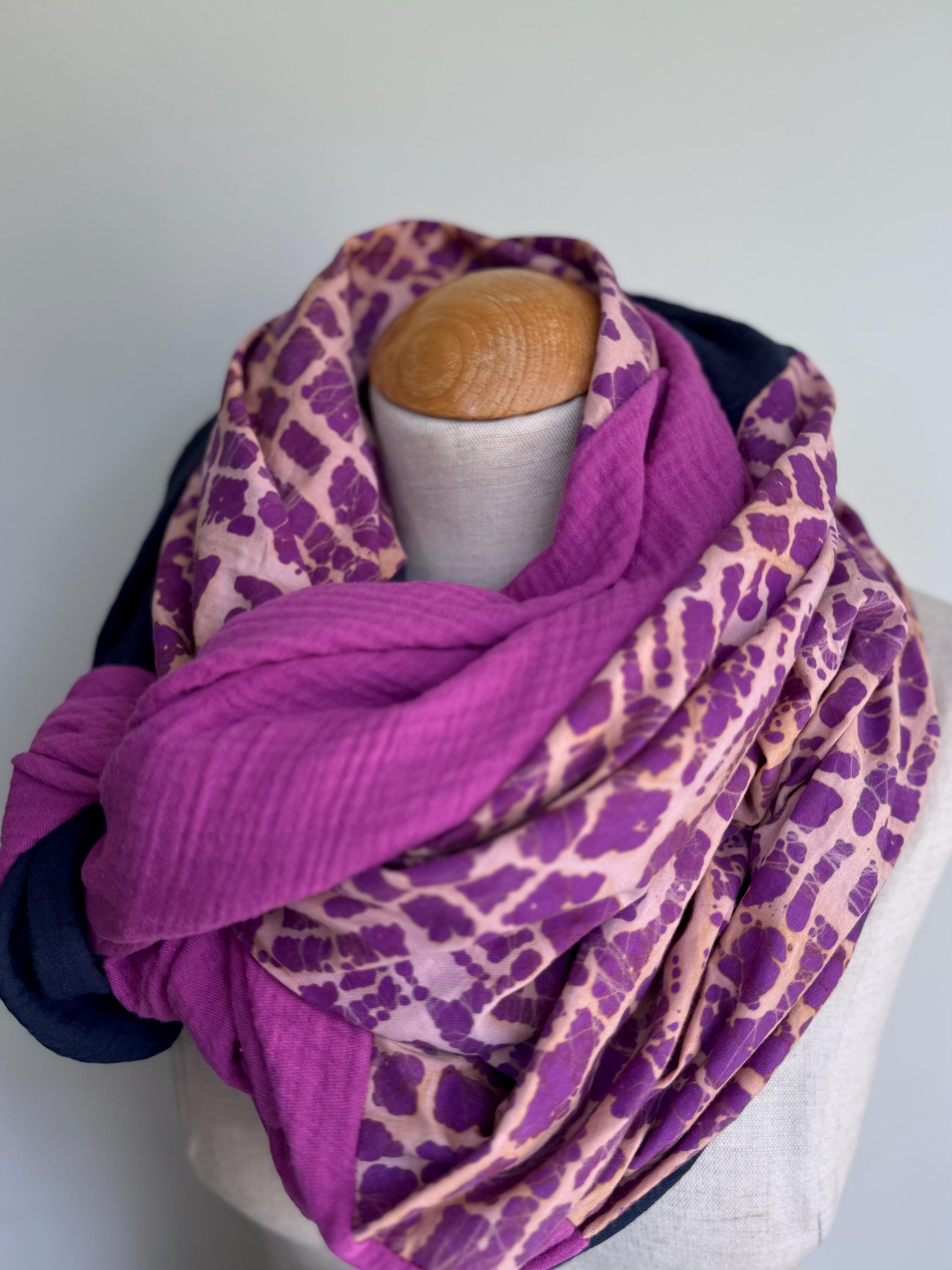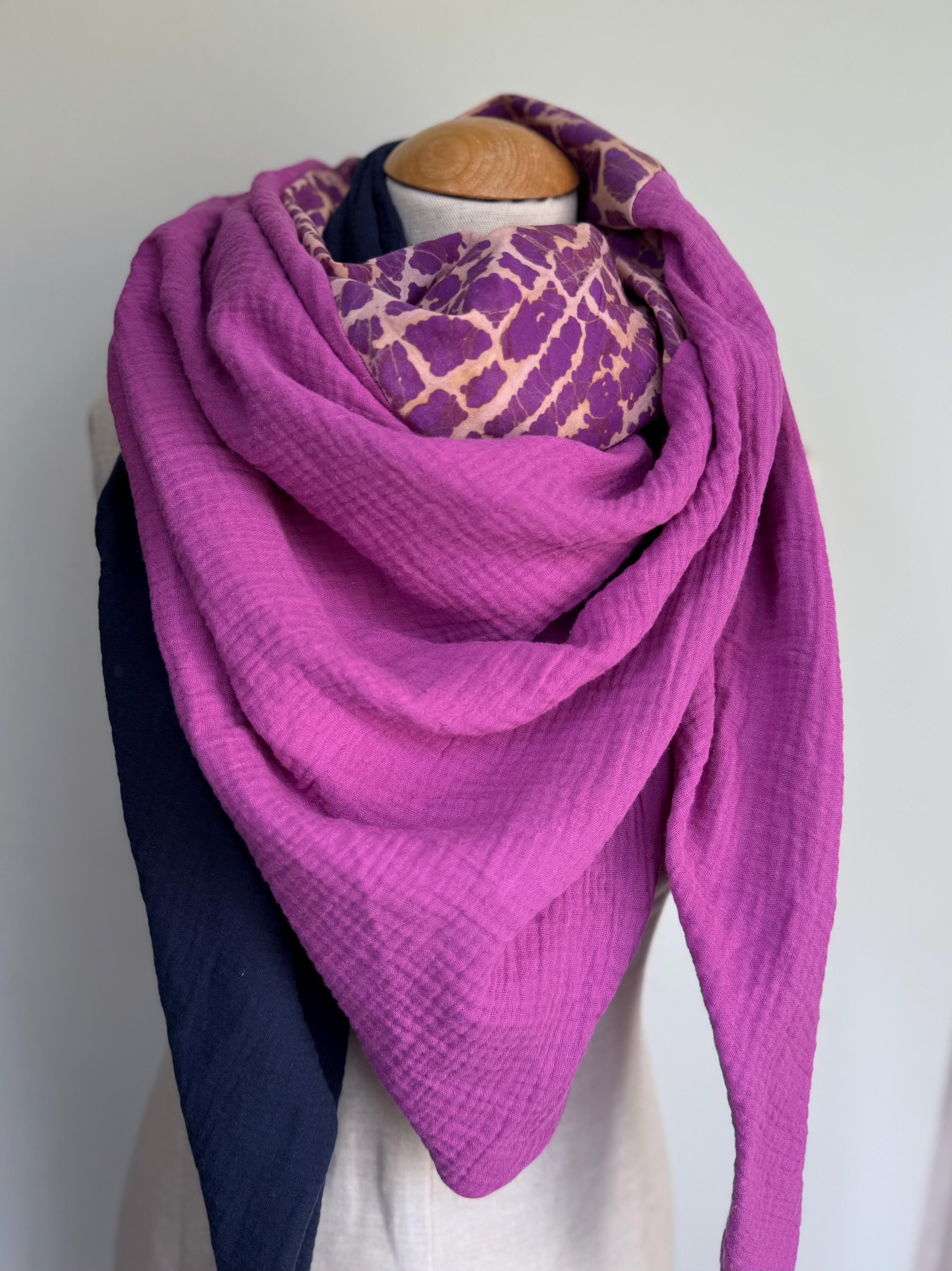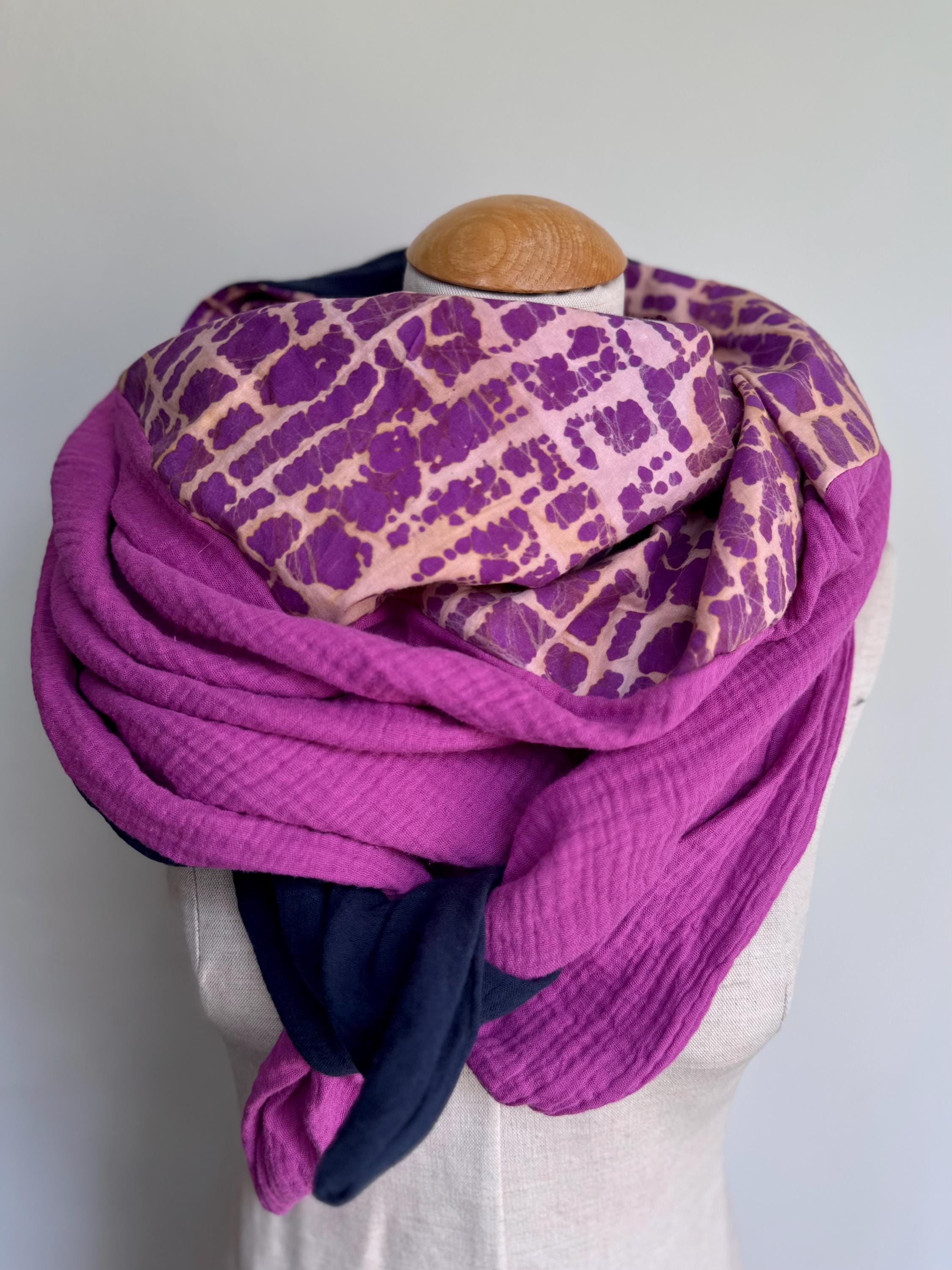 Crafted from two layers of cozy double gauze fabric in a rich berry and elegant navy, it also features a cotton batik print with playful purple accents. The combination of textures and colors makes this piece truly one of a kind — stylish, eye-catching, and incredibly soft to wear.