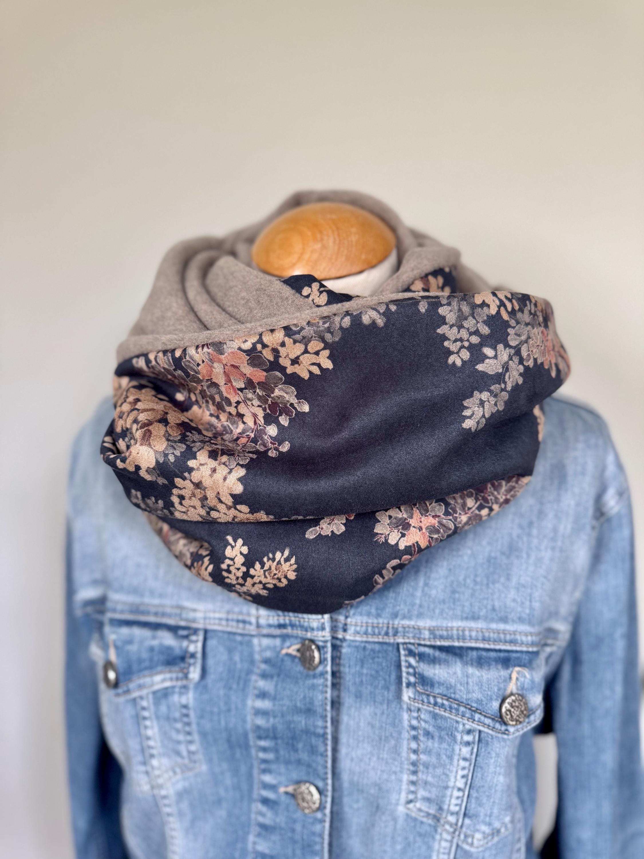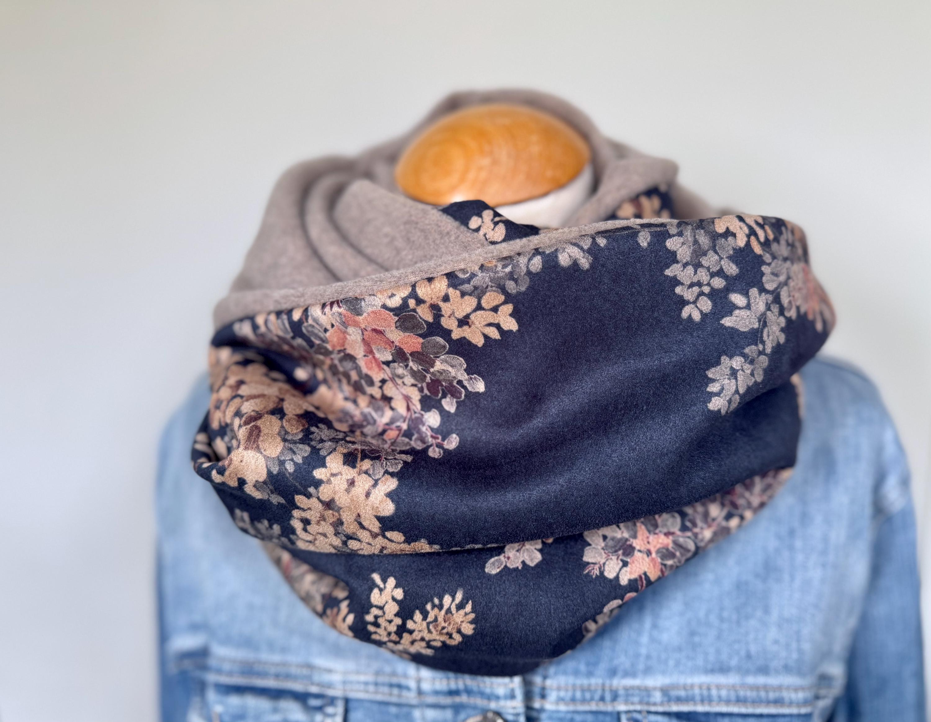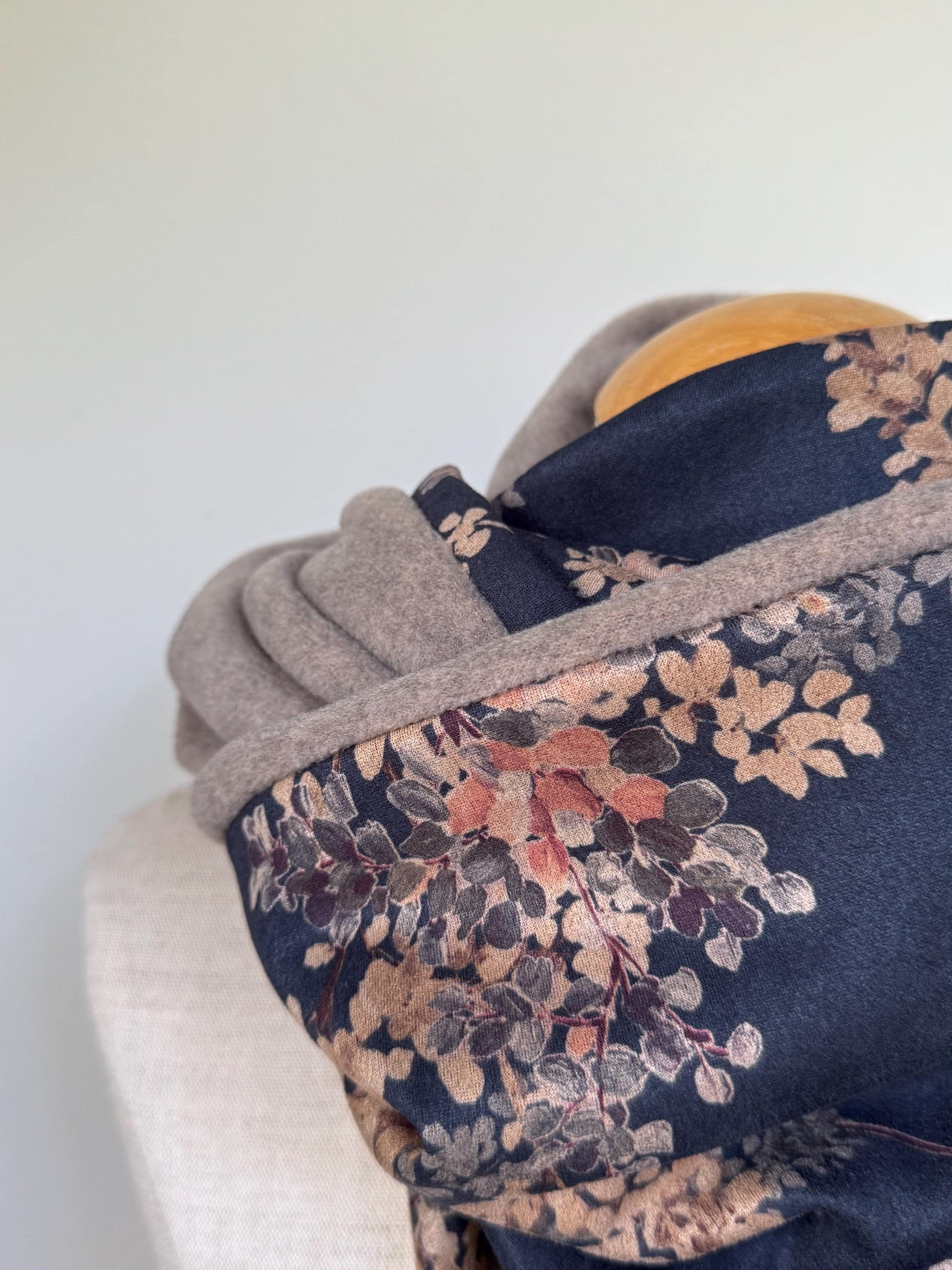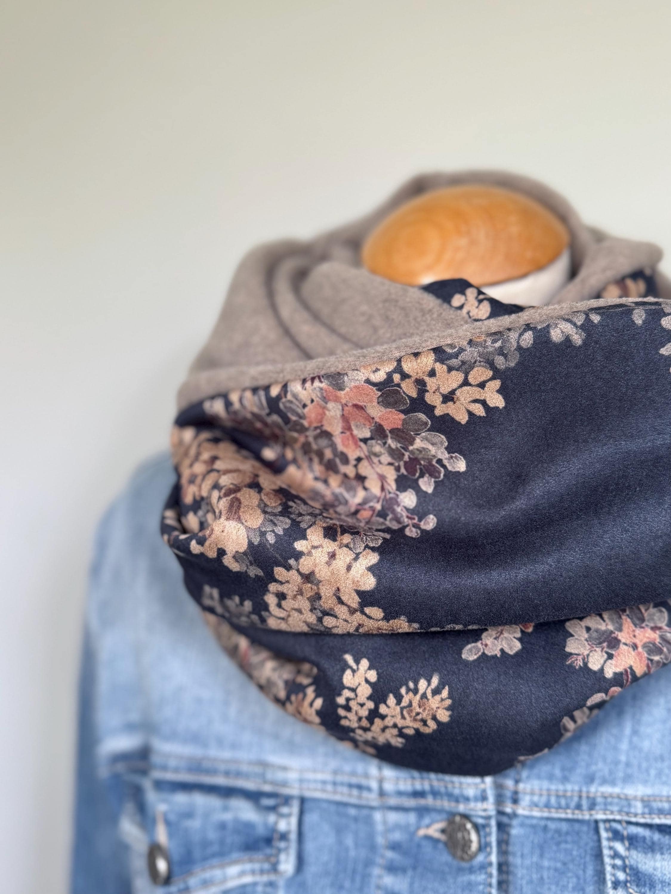 The combination of soft, heathered fleece in taupe and an elegant jersey with a subtle floral pattern on a blue background makes this accessory a versatile companion for everyday wear. Whether for the office, a stroll through the city, or walks on cool days – this scarf is always a perfect fit.