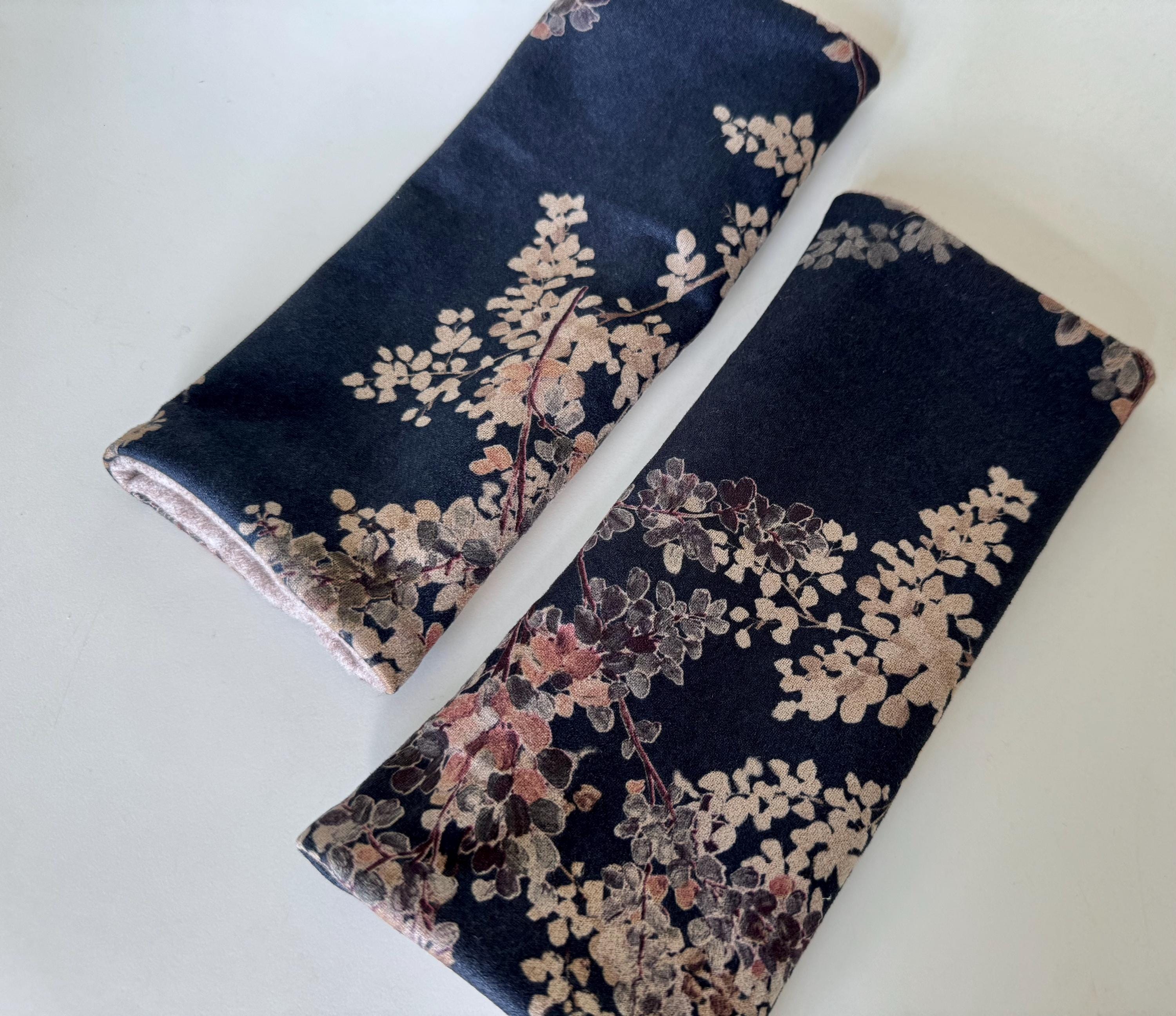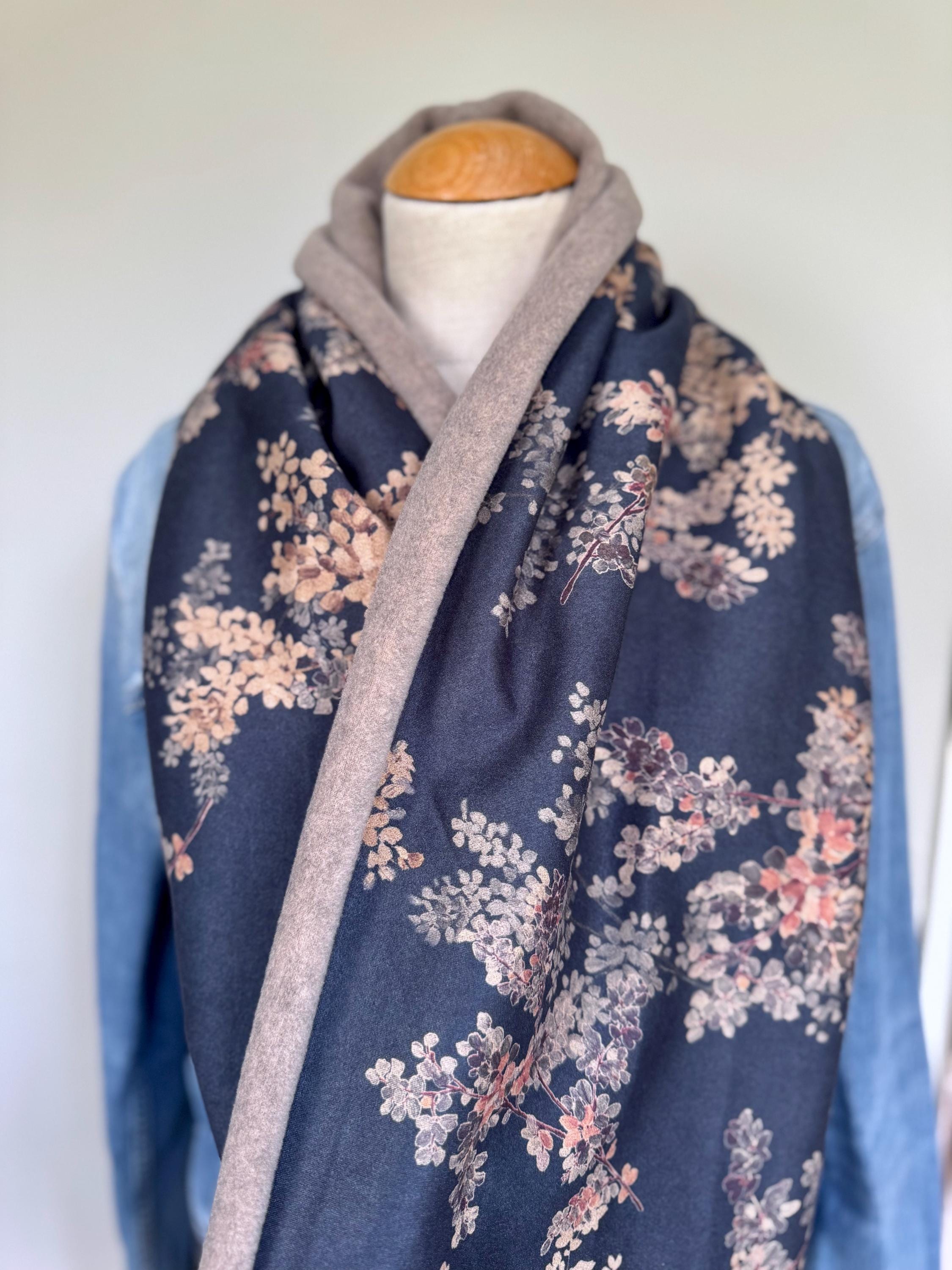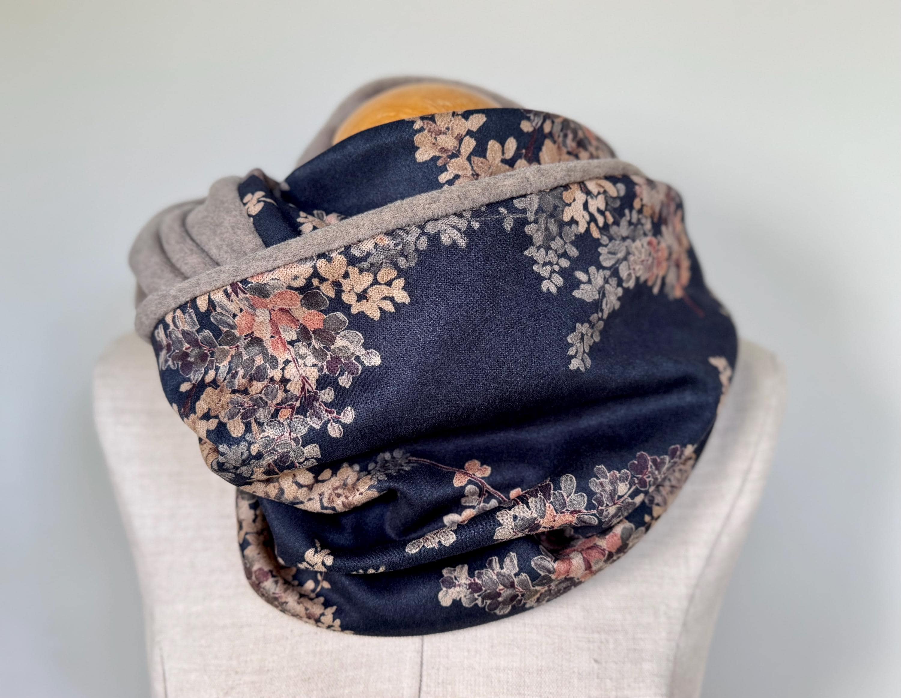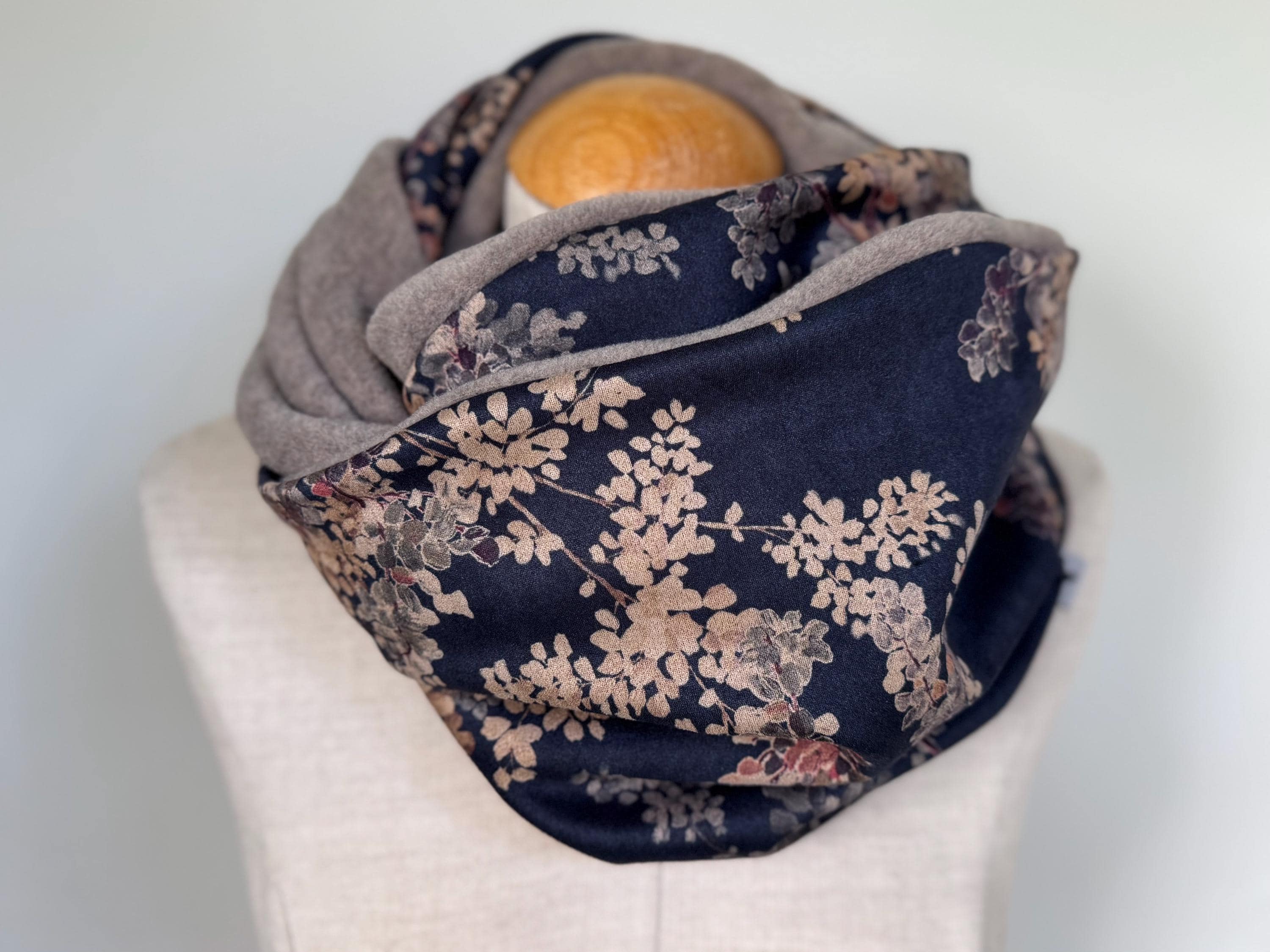 The combination of soft, heathered fleece in taupe and an elegant jersey with a subtle floral pattern on a blue background makes this accessory a versatile companion for everyday wear. Whether for the office, a stroll through the city, or walks on cool days – this scarf is always a perfect fit.