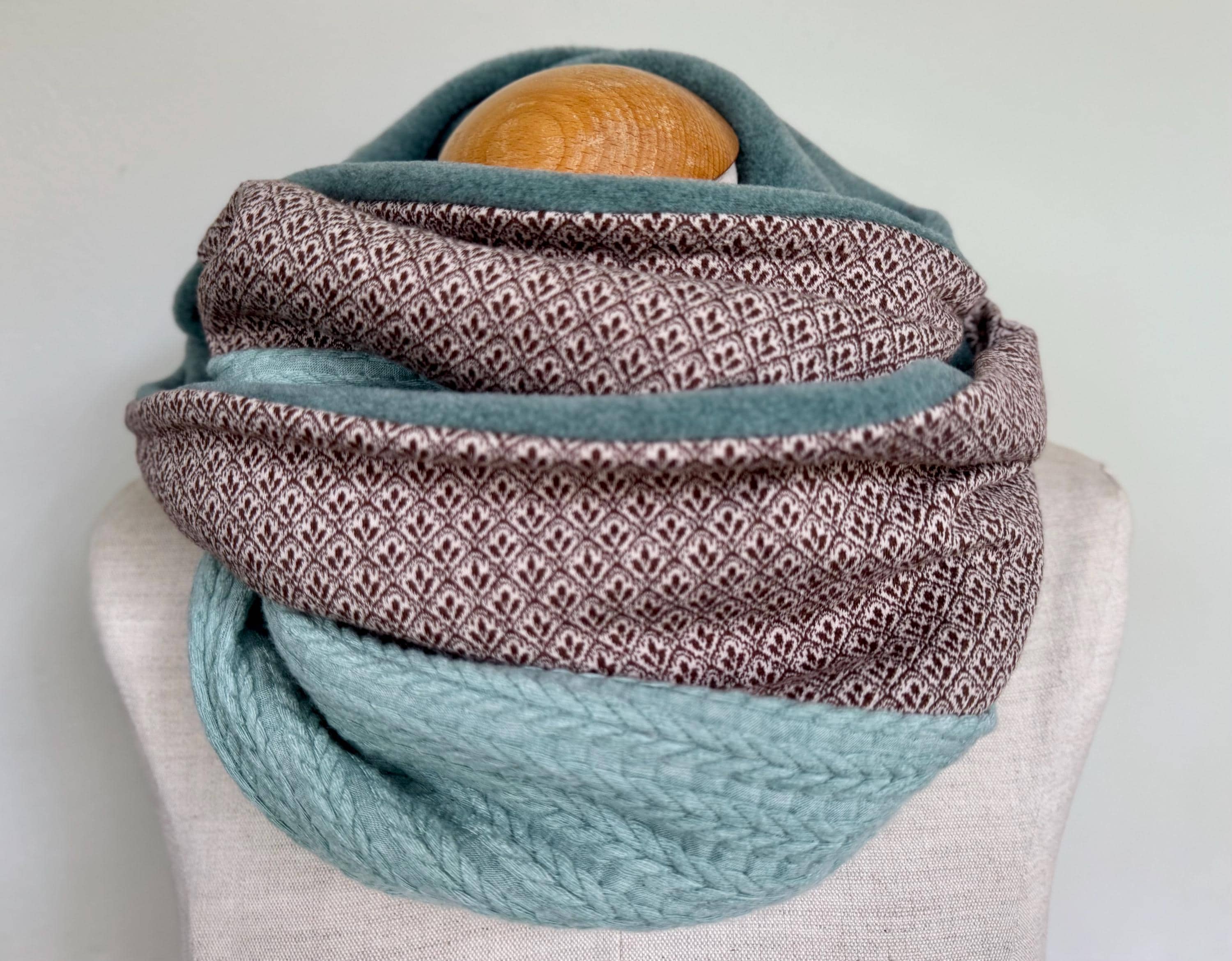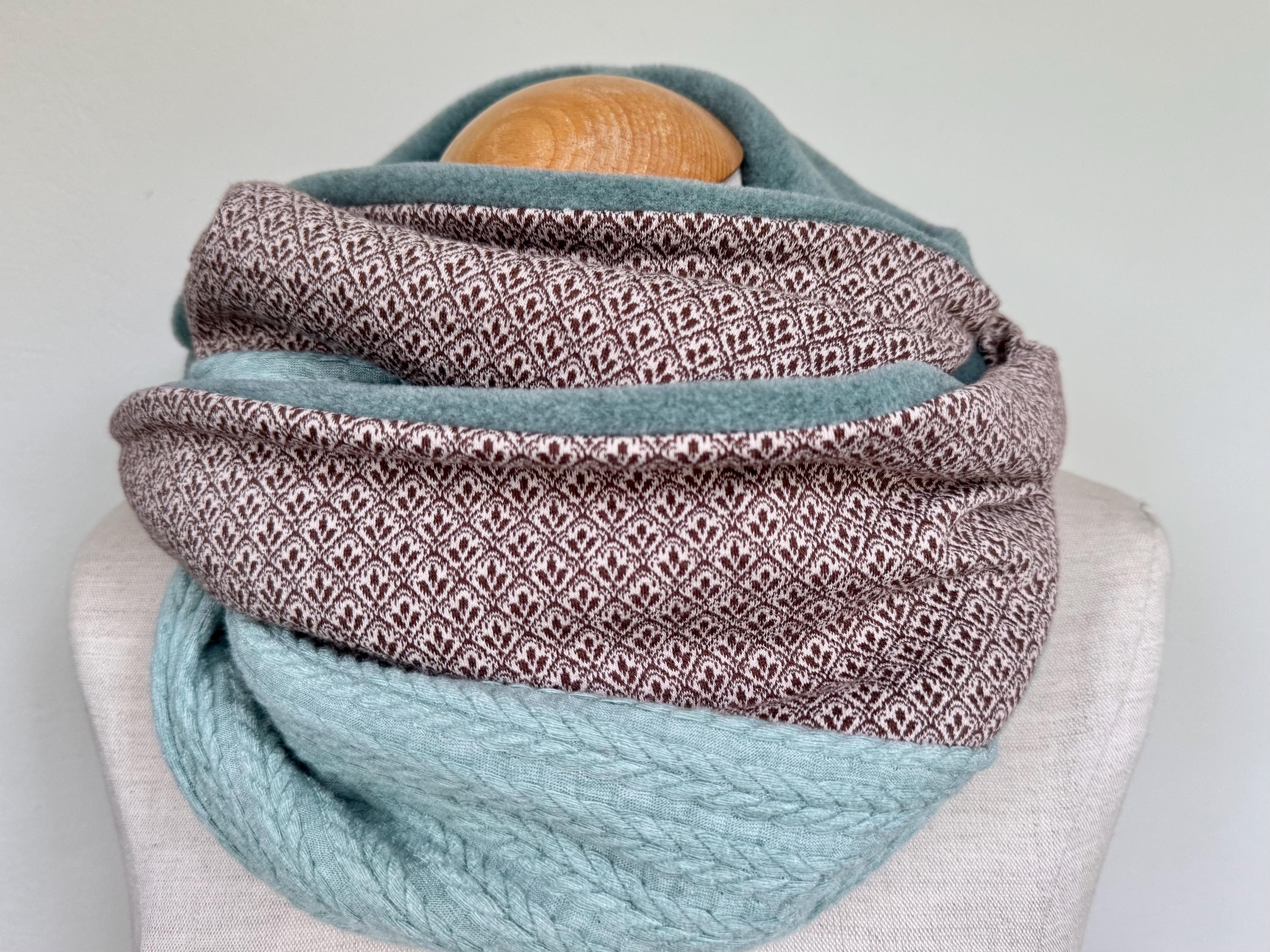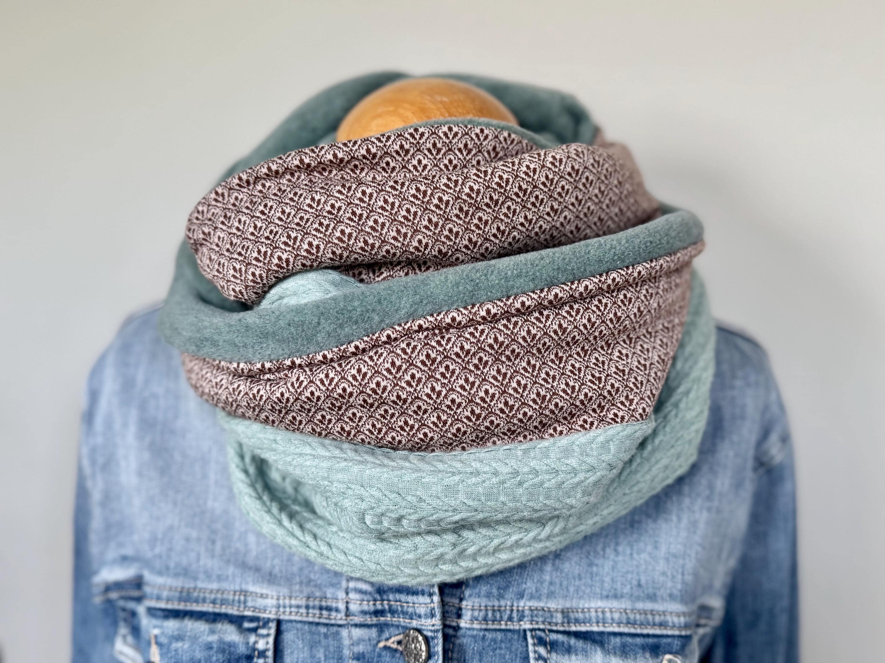 Here is a wonderfully soft loop scarf. It's made from three beautiful fabrics, is reversible, and therefore offers a variety of looks. The front features a reed-green knit combined with a soft jacquard jersey. The scarf is lined with warm, reed-green fleece.