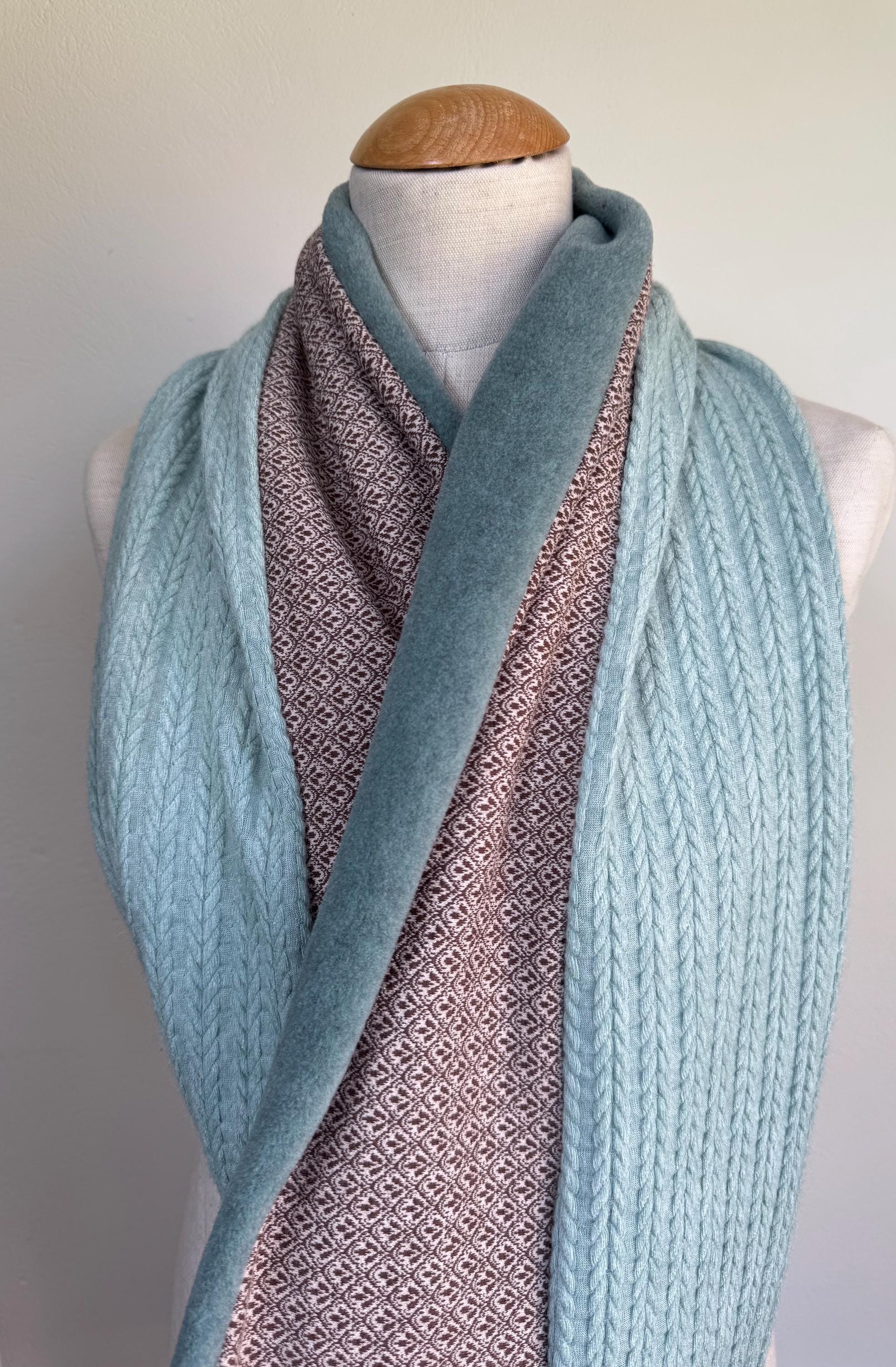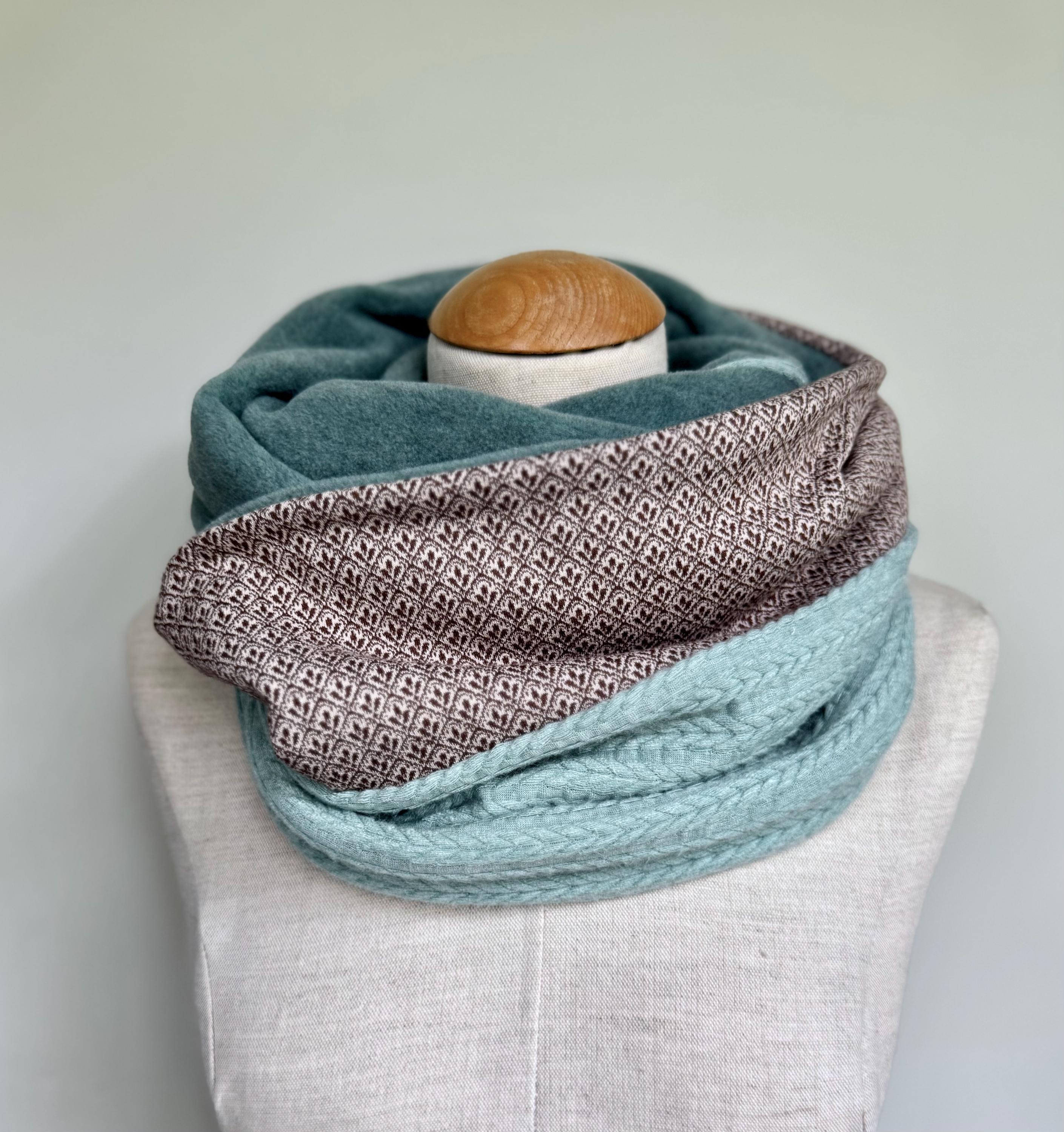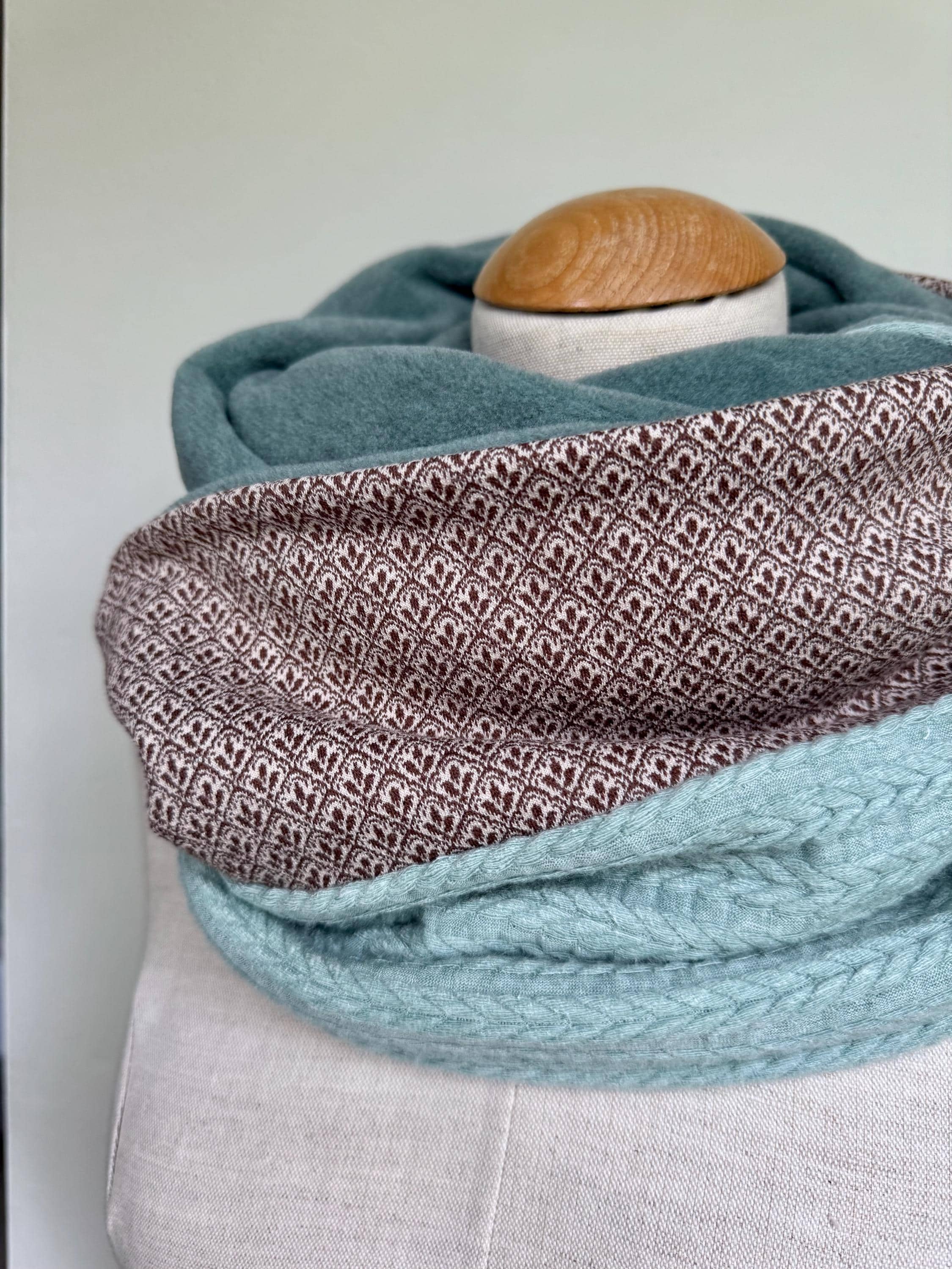 Here is a wonderfully soft loop scarf. It's made from three beautiful fabrics, is reversible, and therefore offers a variety of looks. The front features a reed-green knit combined with a soft jacquard jersey. The scarf is lined with warm, reed-green fleece.