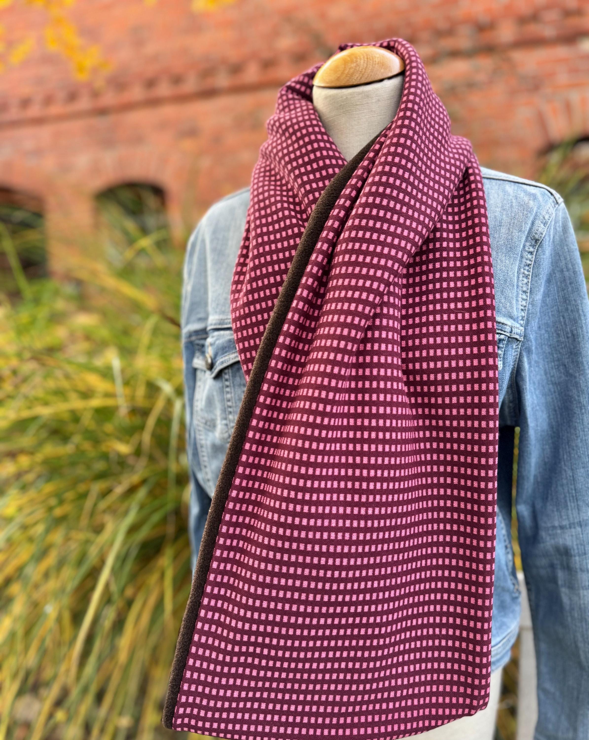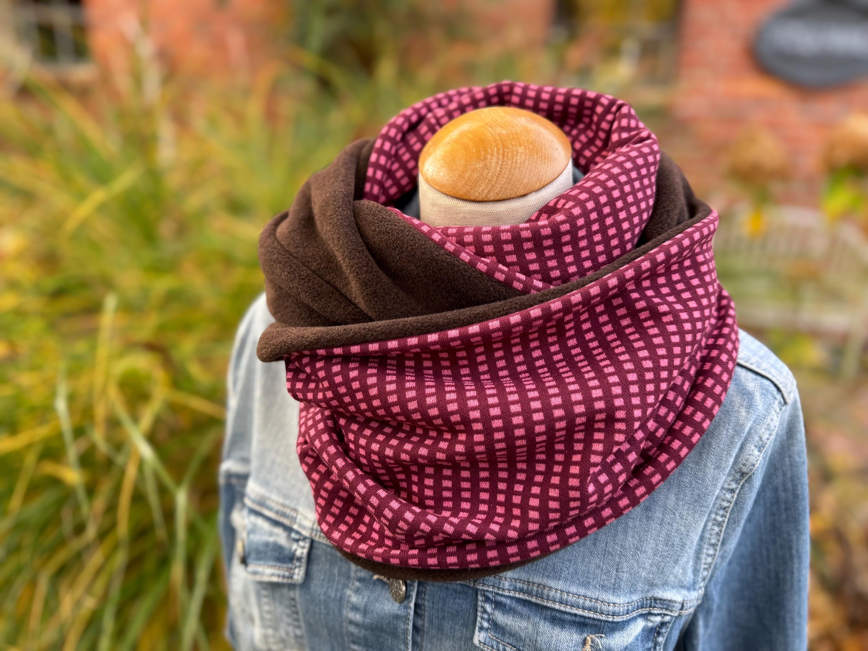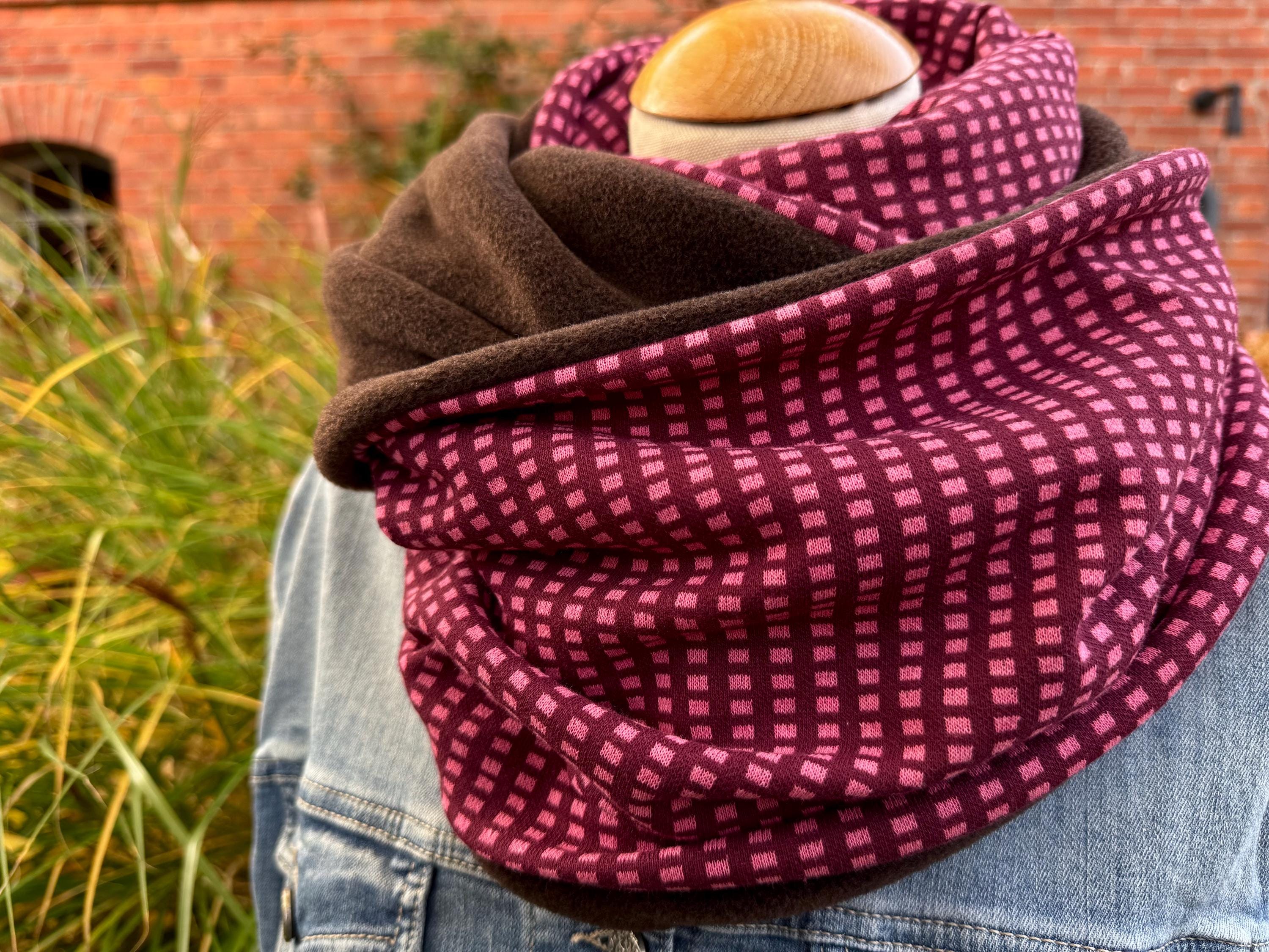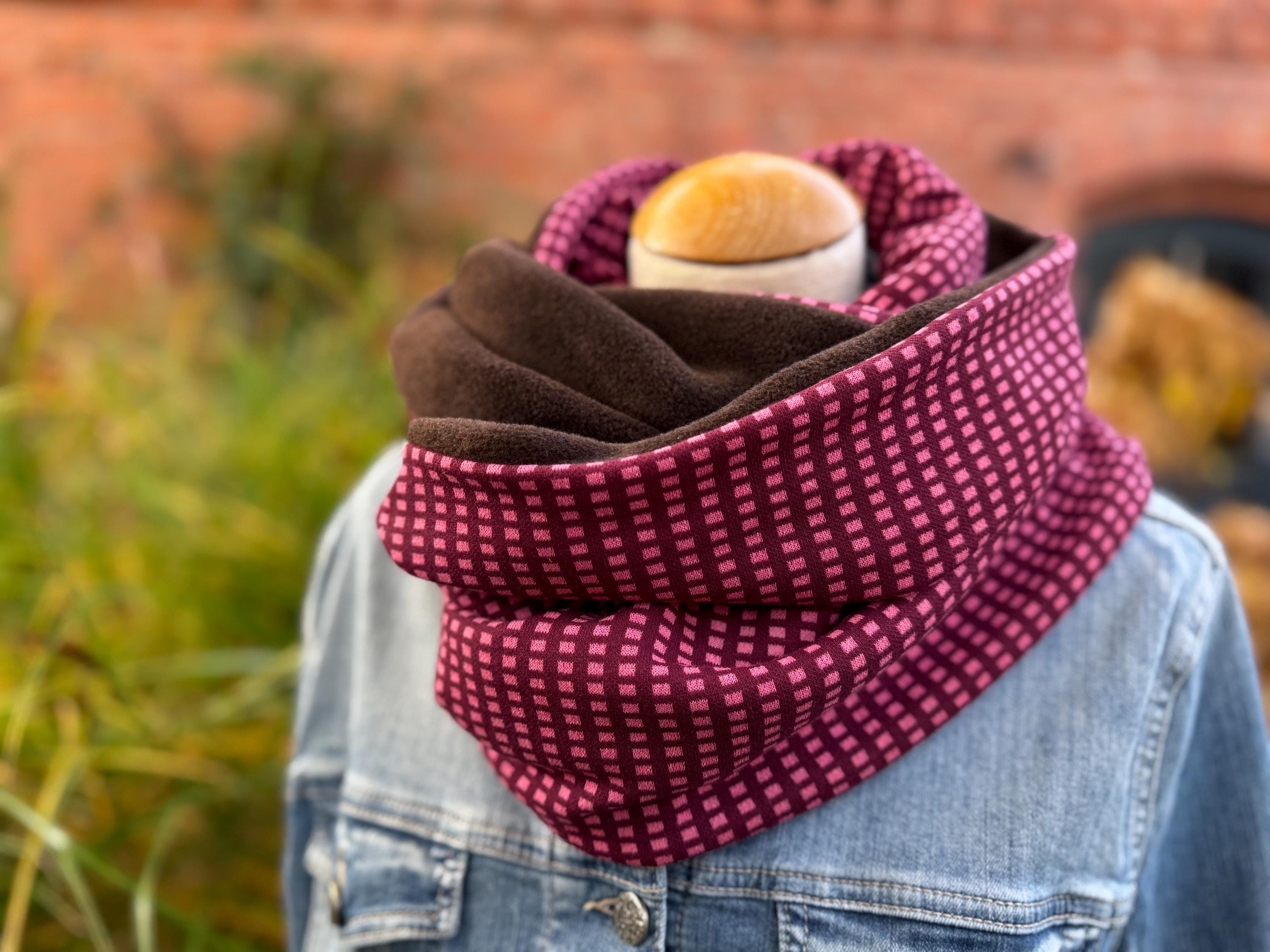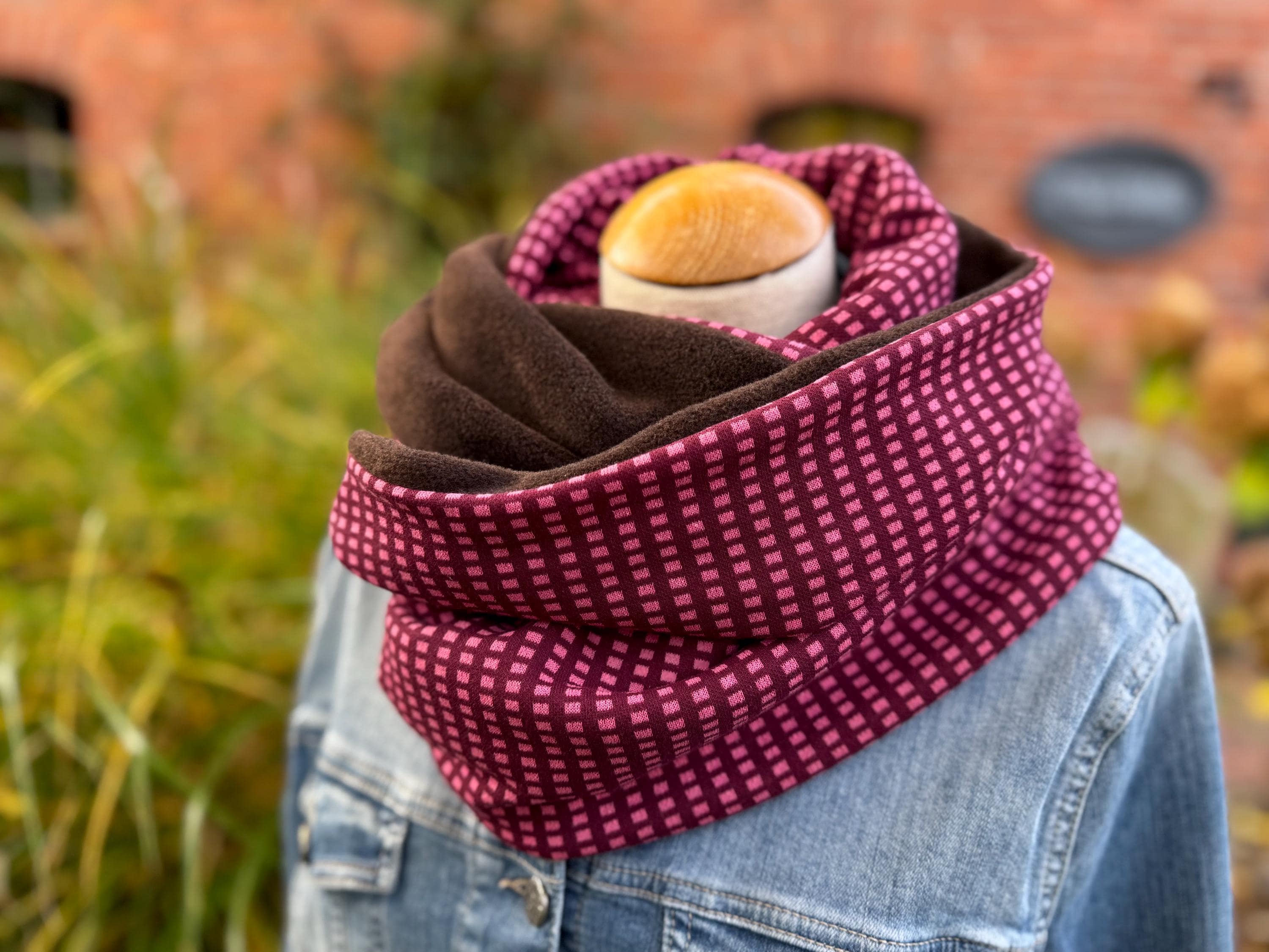 Here is a wonderfully cozy scarf. It was sewn from a knitted jacquard with a fine check pattern. The loop scarf is lined with a high-quality fleece fabric in dark brown.