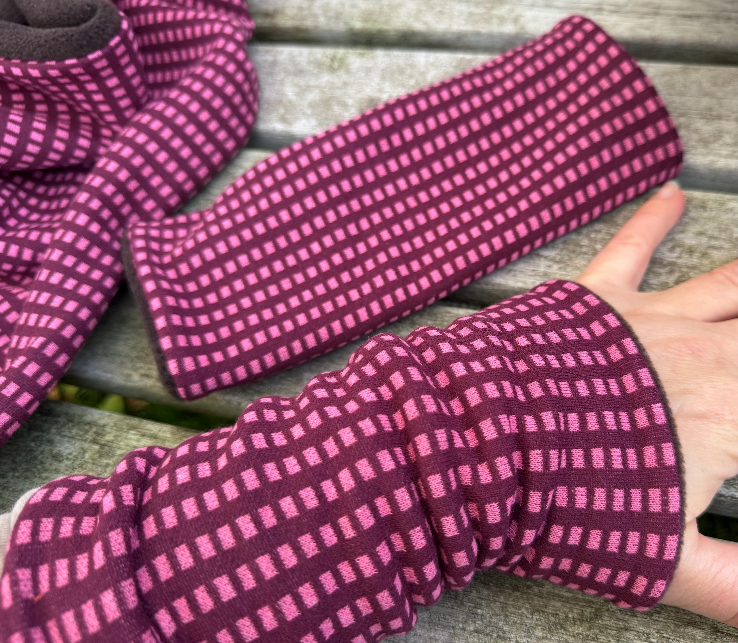 Matching arm warmers are available for the loop scarf. They are approximately 23 cm long and elastic/stretchy in width.