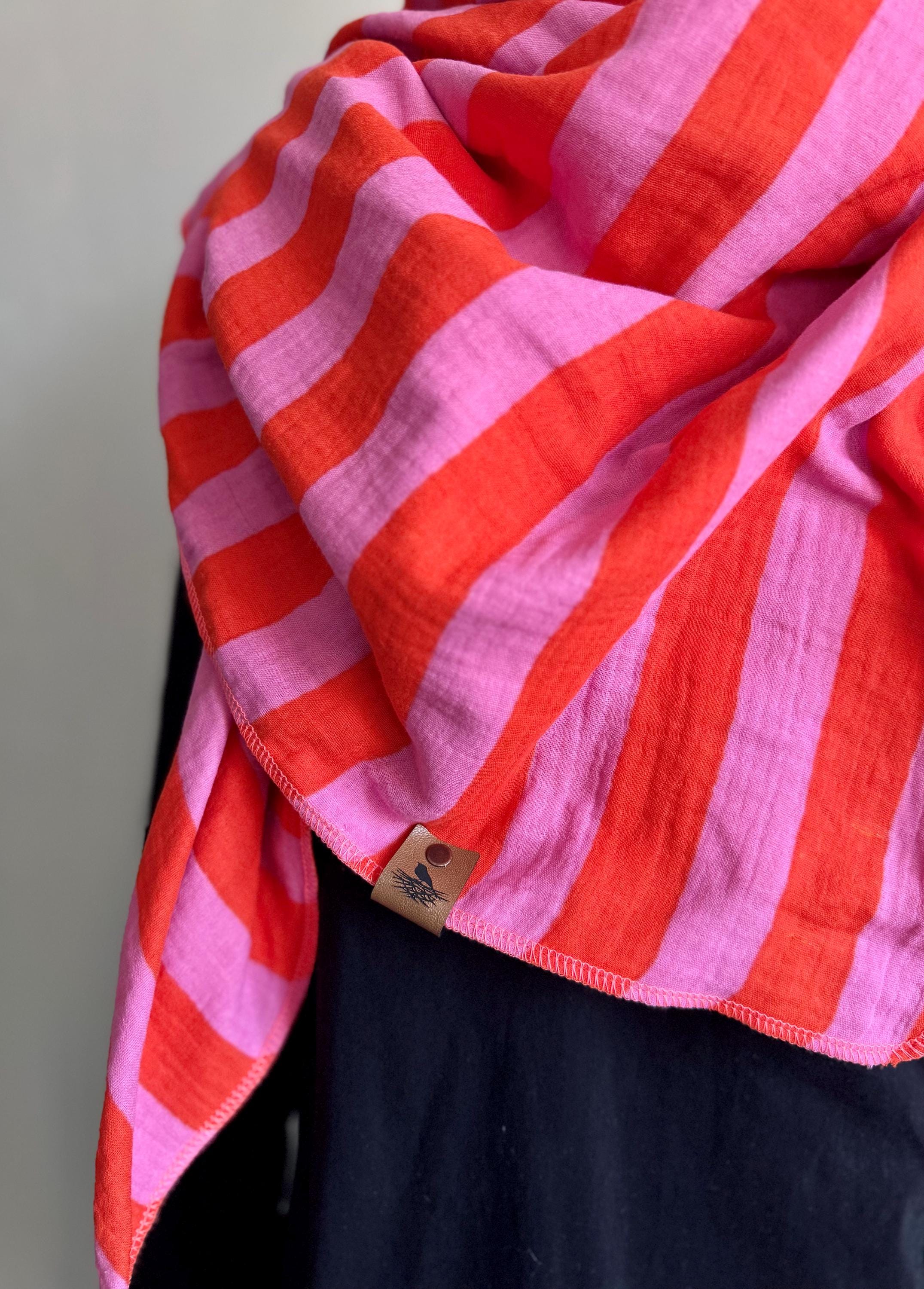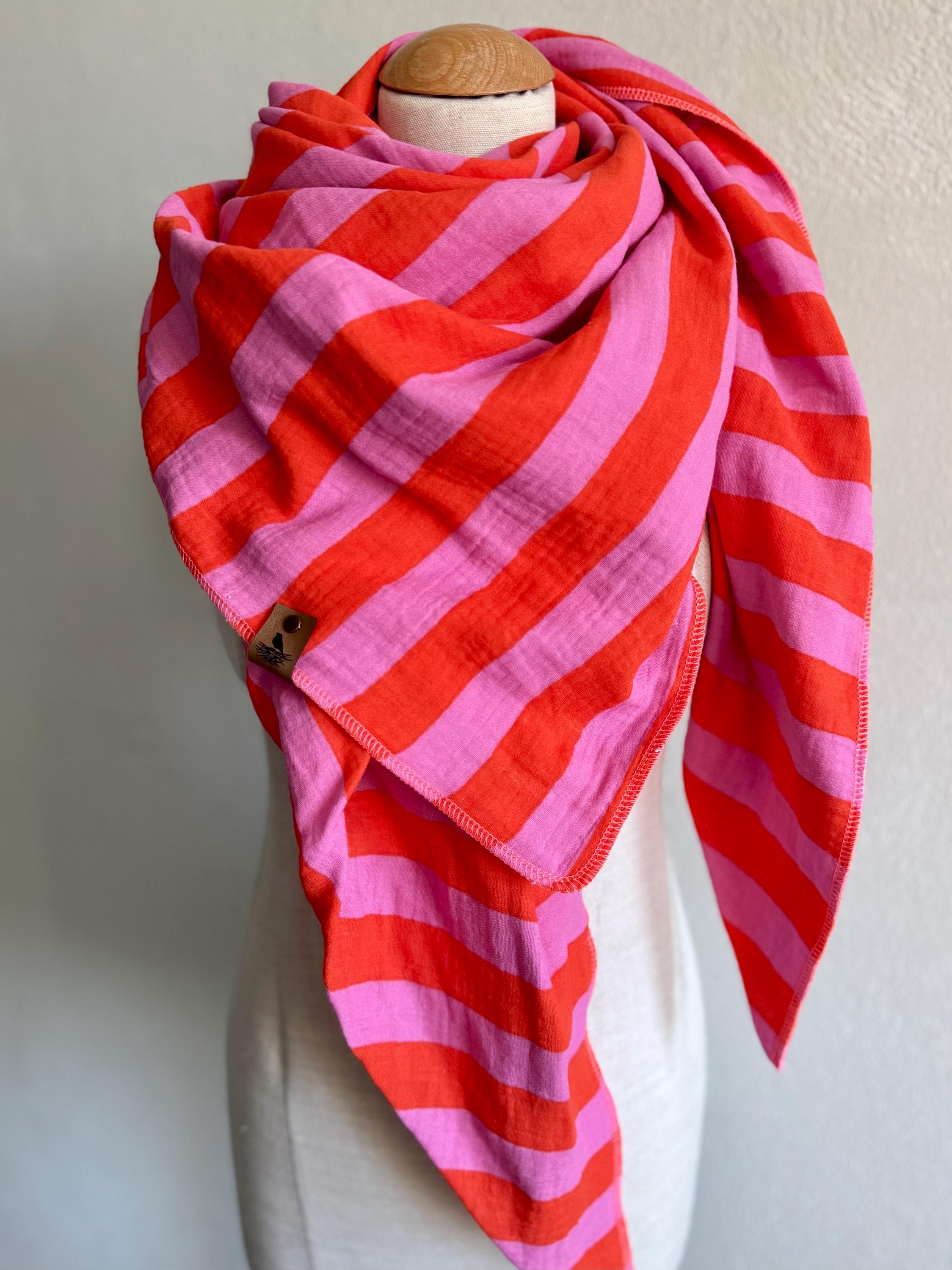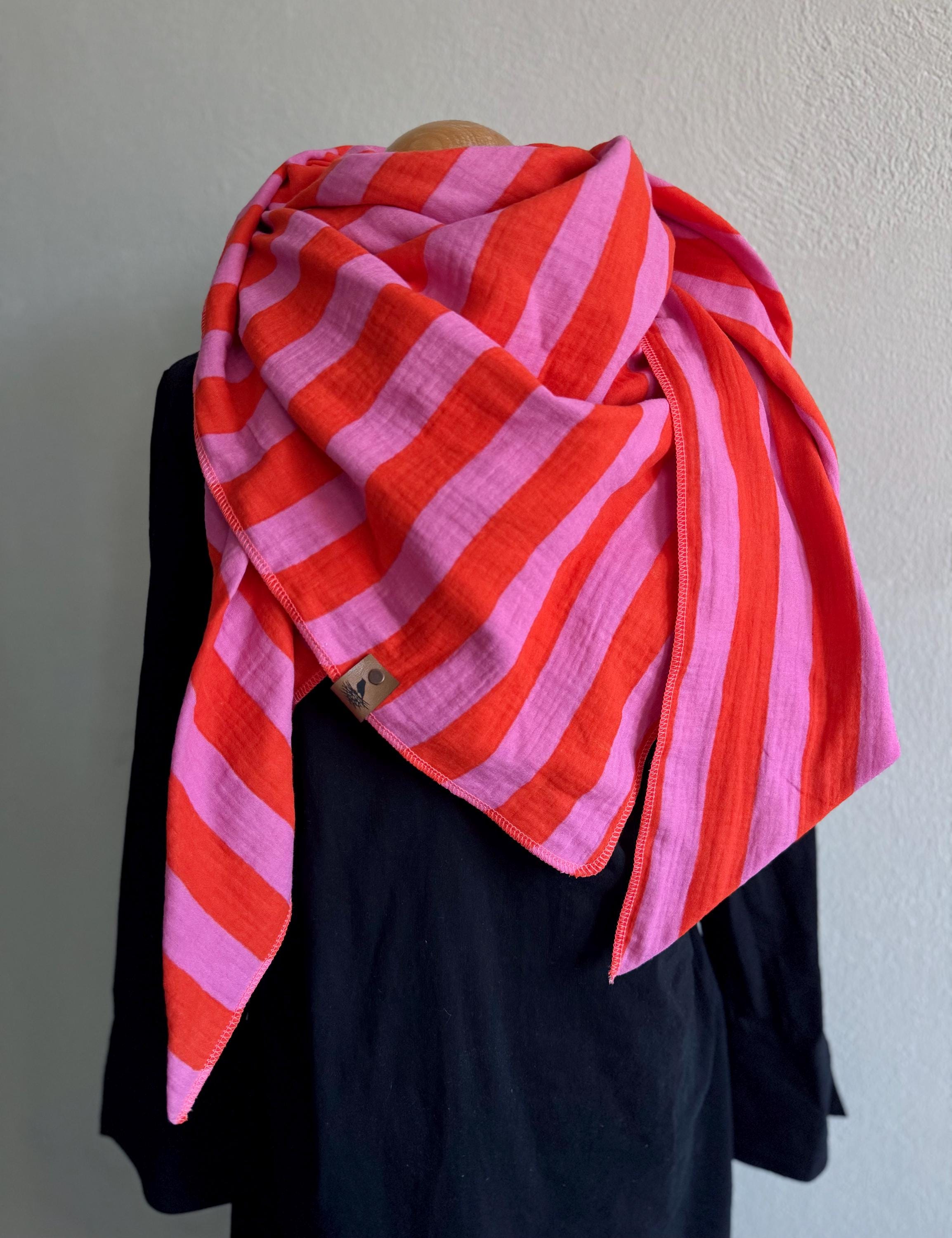 Crafted from two premium cotton fabrics — soft double gauze (muslin) in pink and a lightweight cotton batiste featuring a modern red-orange line print — this scarf adds energy and style to every outfit. The large triangular shape gives you endless styling options: wrap it, drape it, knot it… always stunning.