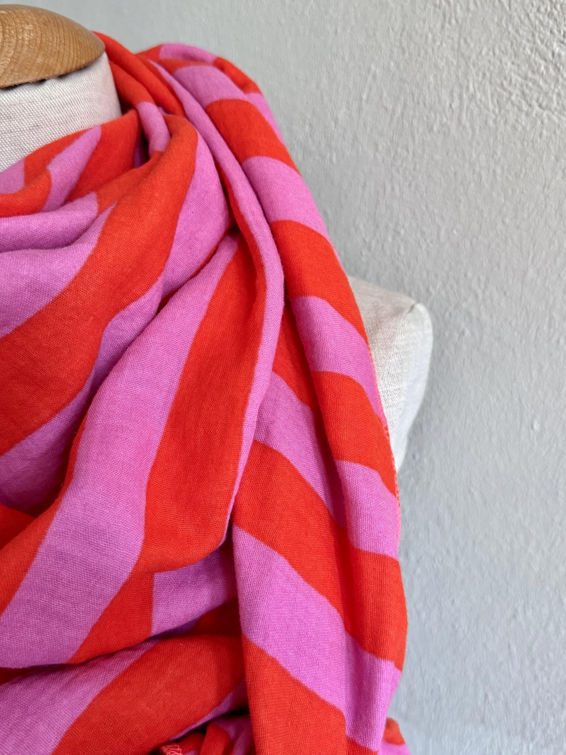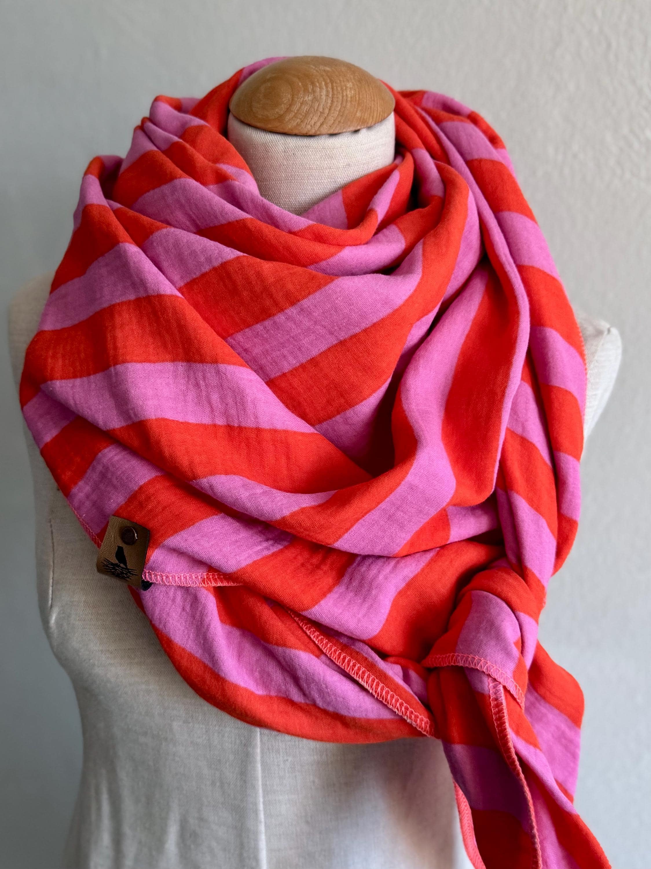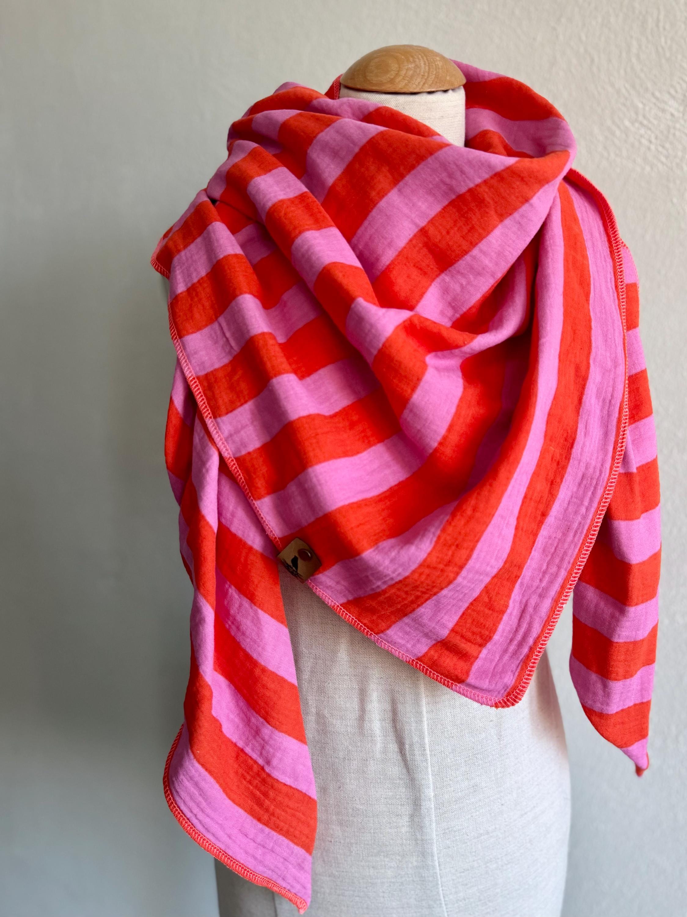 Crafted from two premium cotton fabrics — soft double gauze (muslin) in pink and a lightweight cotton batiste featuring a modern red-orange line print — this scarf adds energy and style to every outfit. The large triangular shape gives you endless styling options: wrap it, drape it, knot it… always stunning.