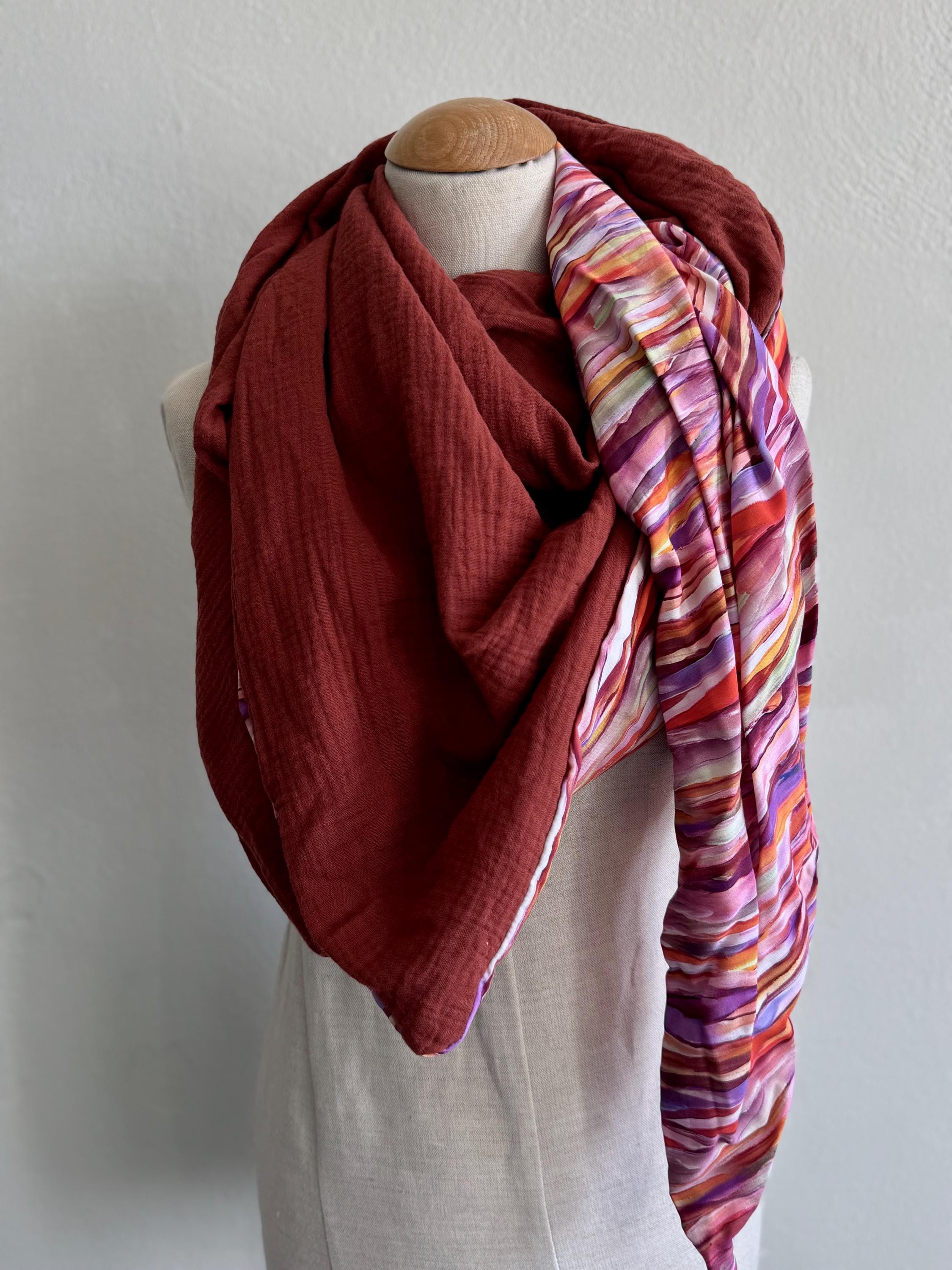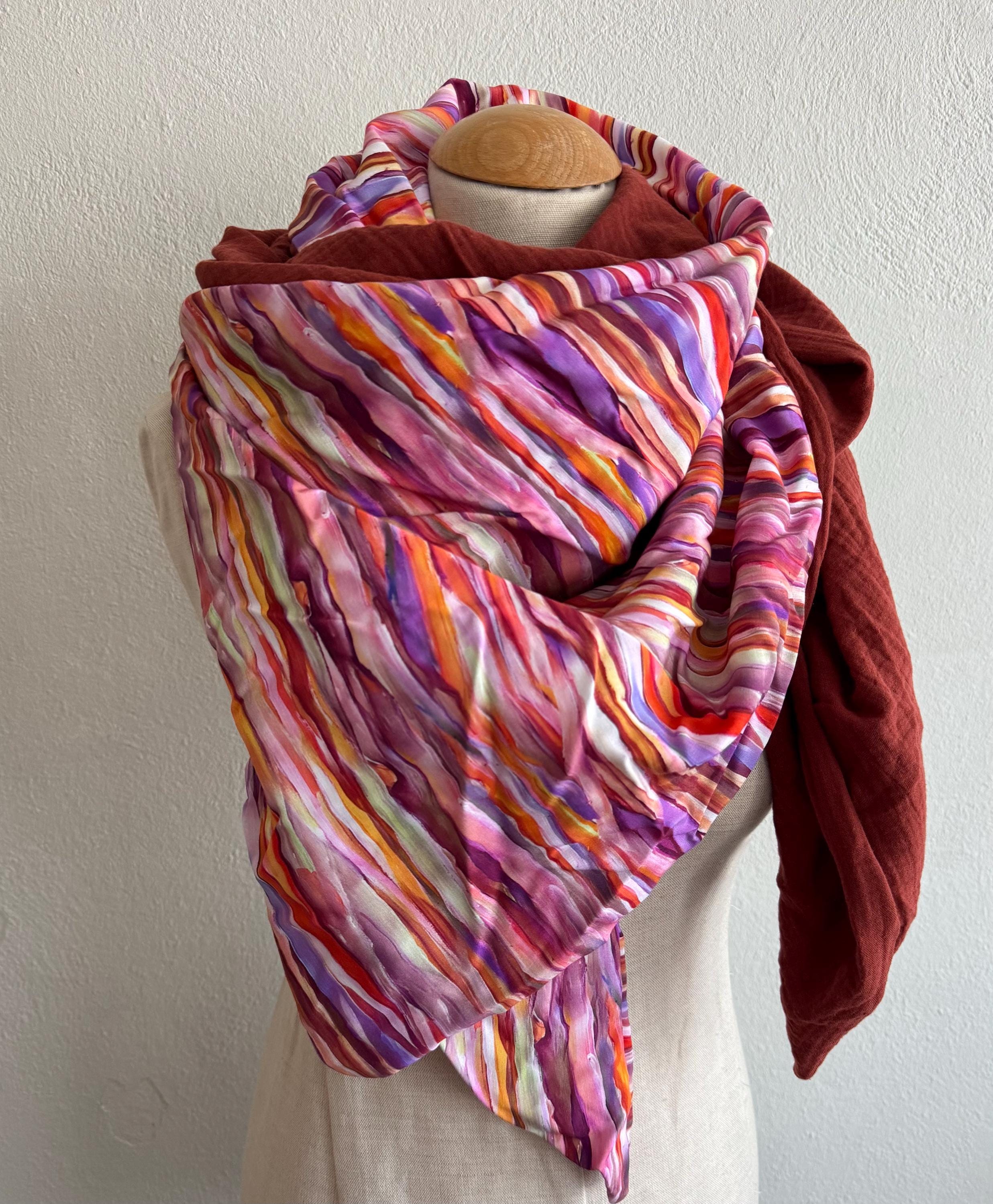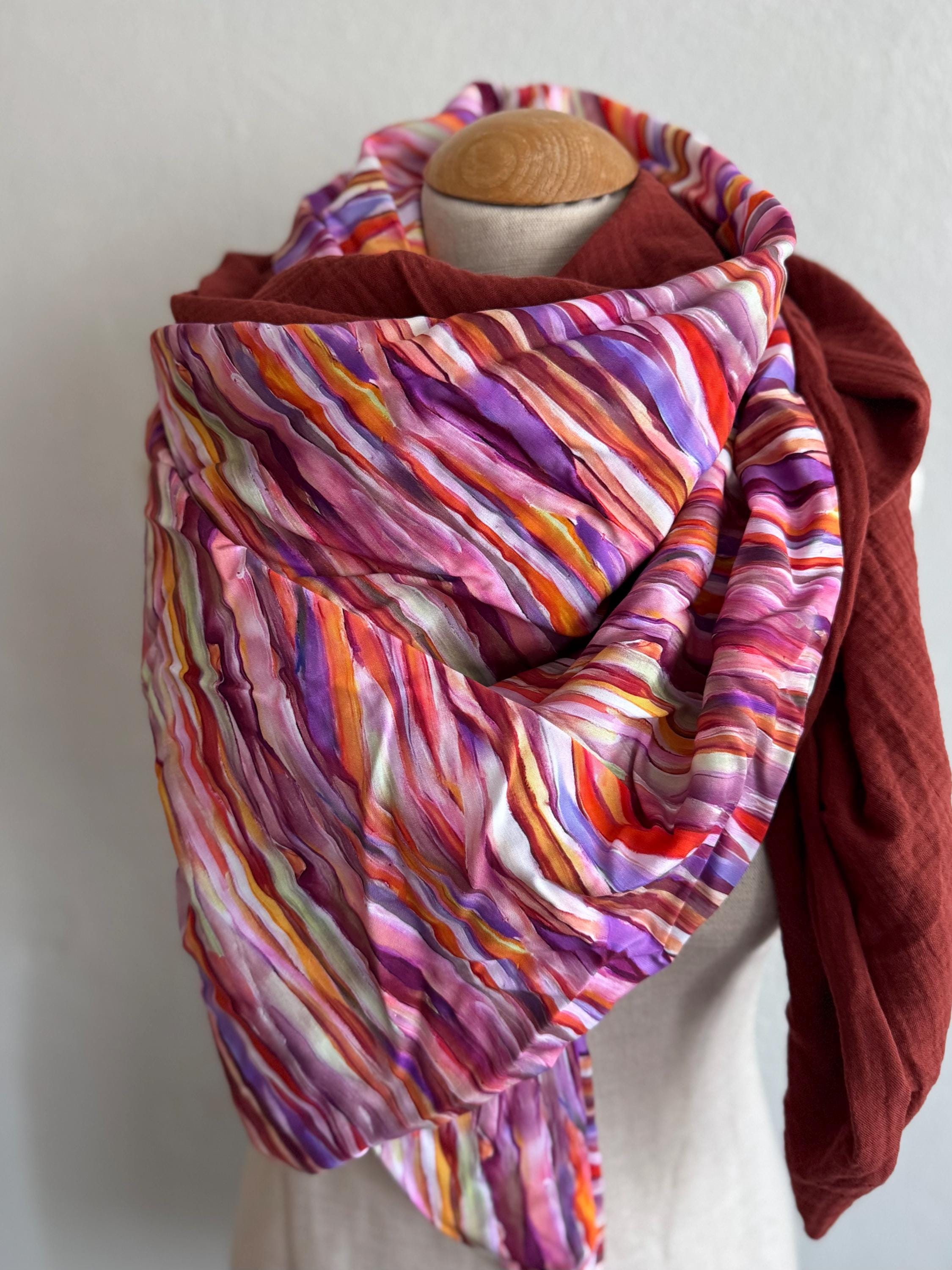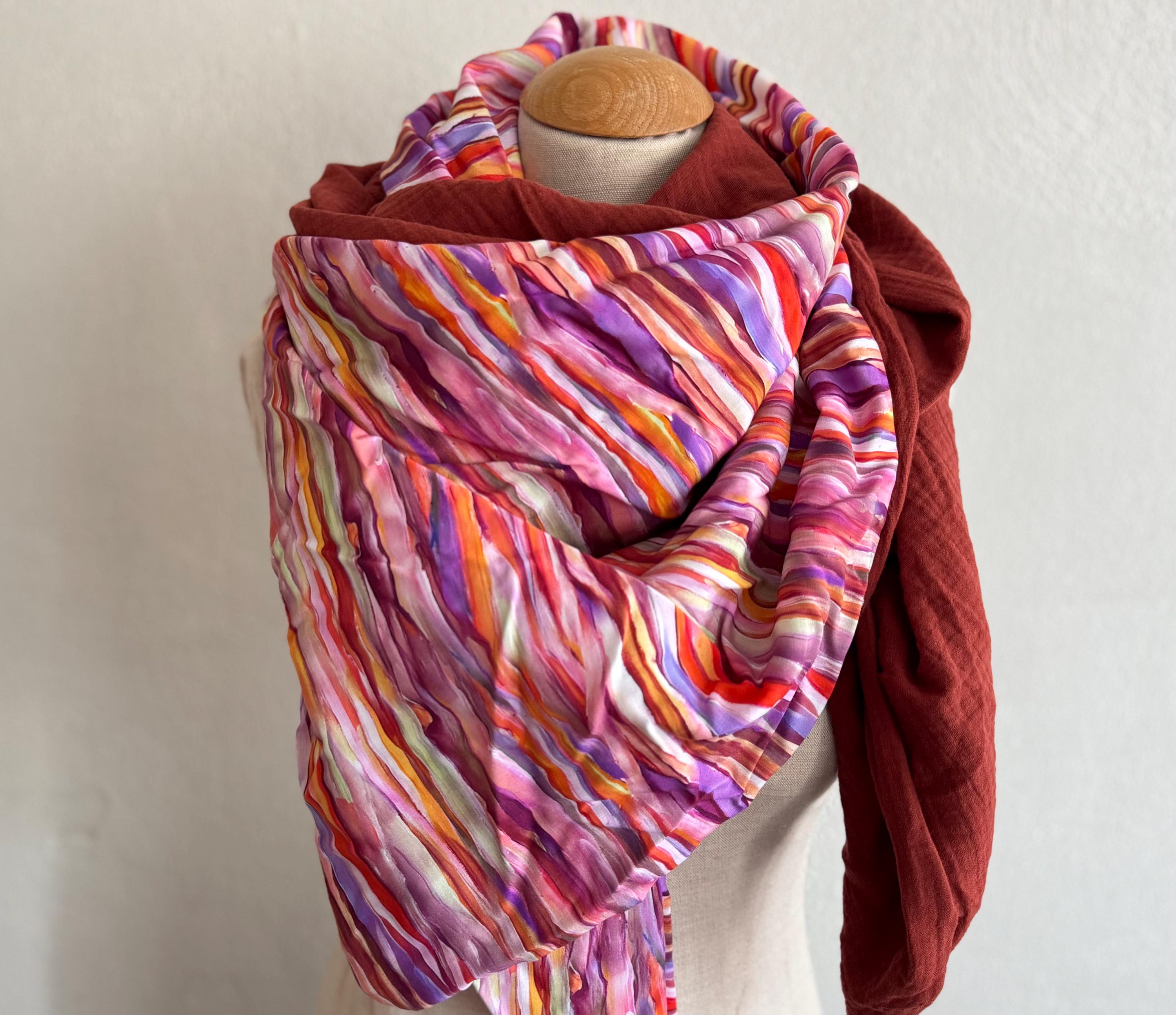 This handmade triangular scarf is a real eye-catcher! It combines a sophisticated viscose print with a colorful striped motif in purple and pink with a soft, rust-brown muslin fabric – a harmonious interplay of color, texture, and comfort.