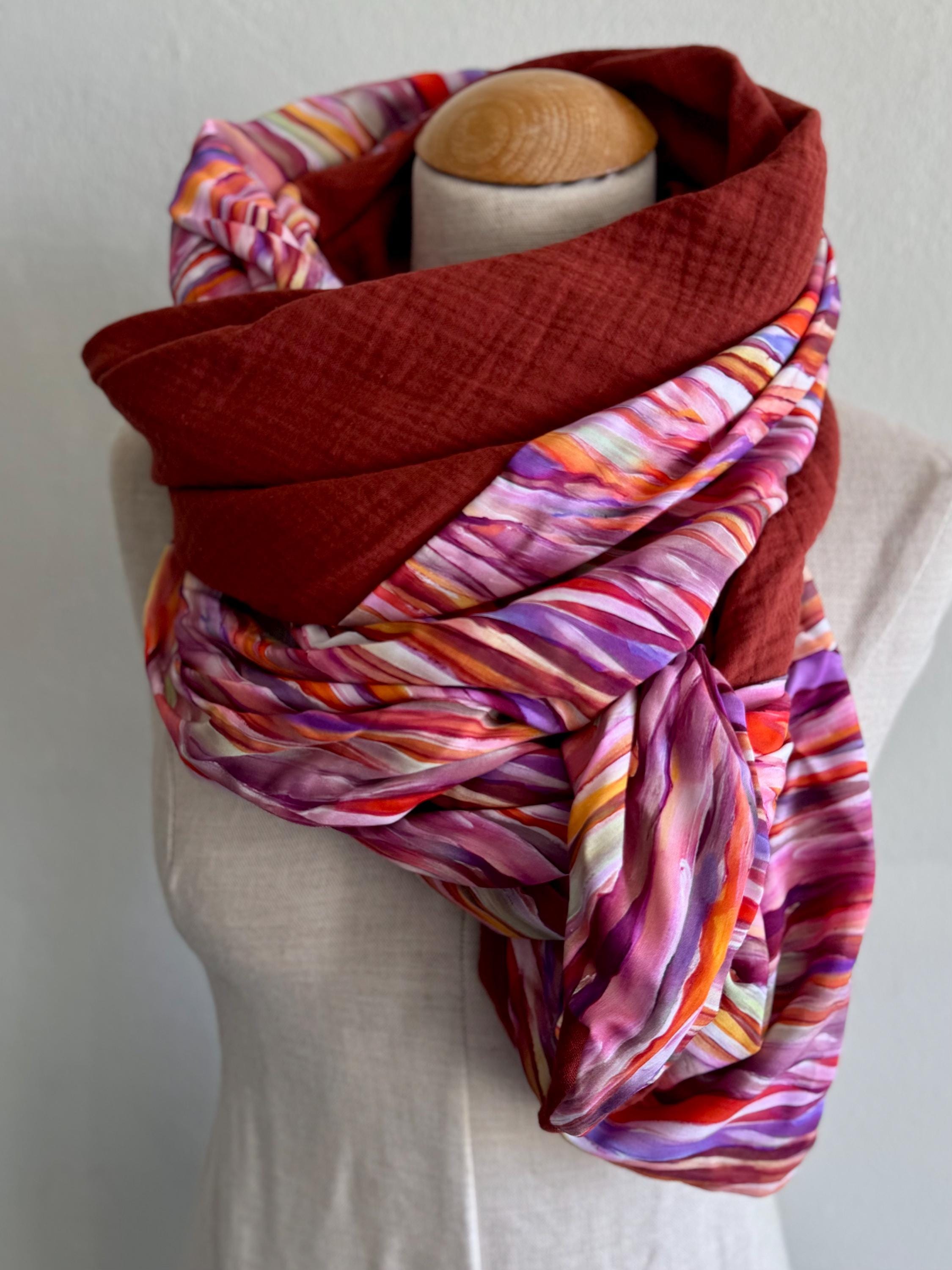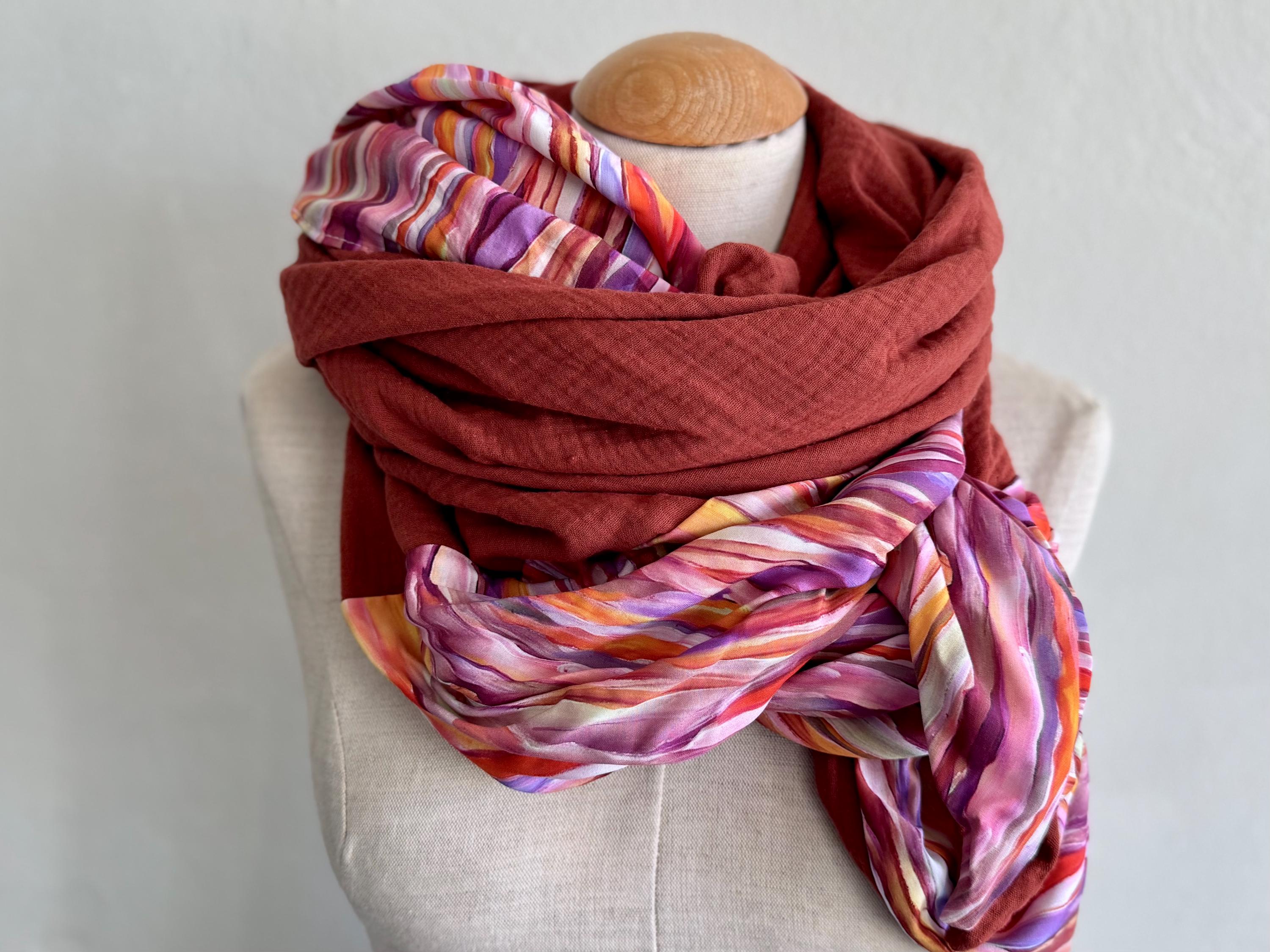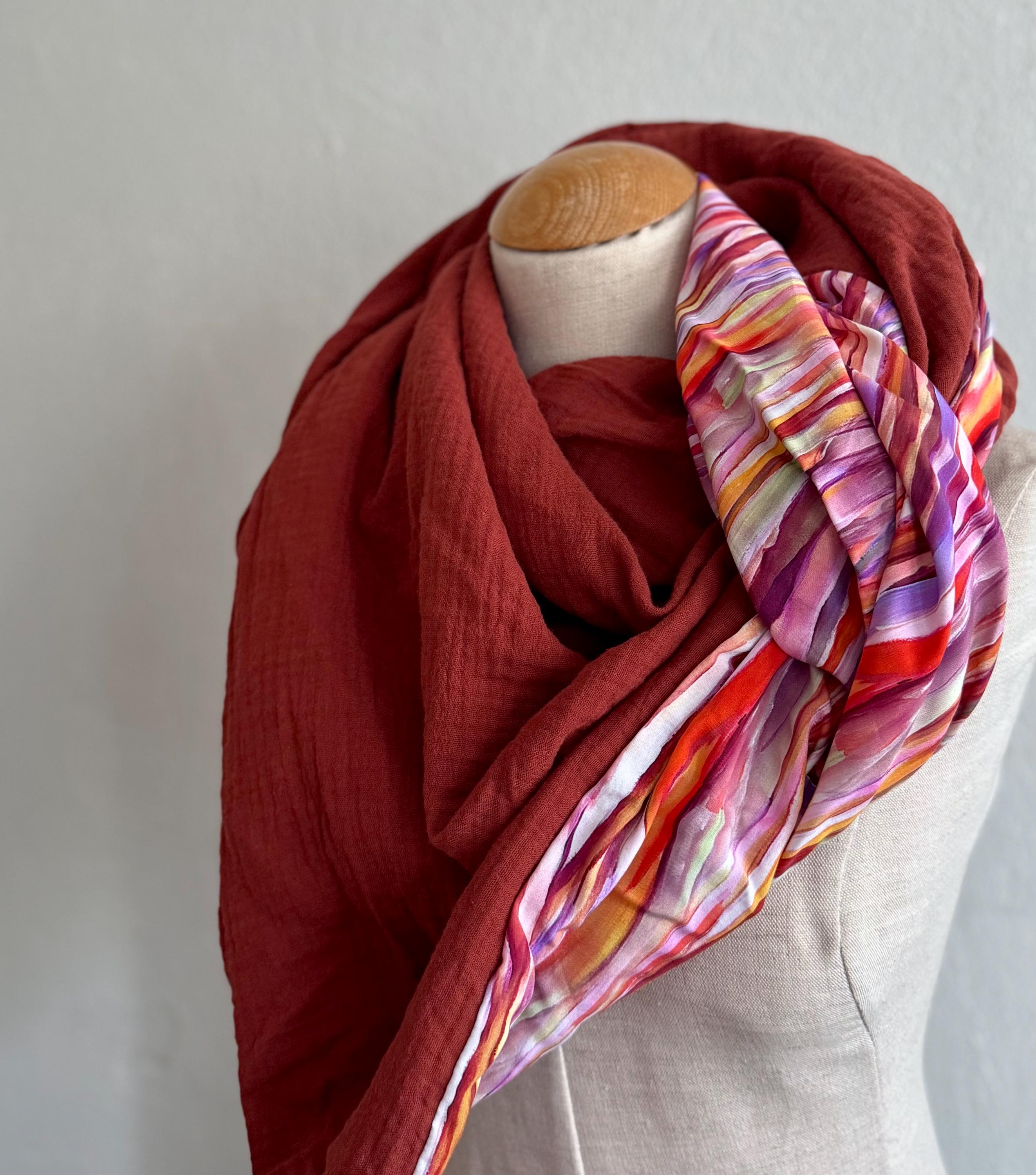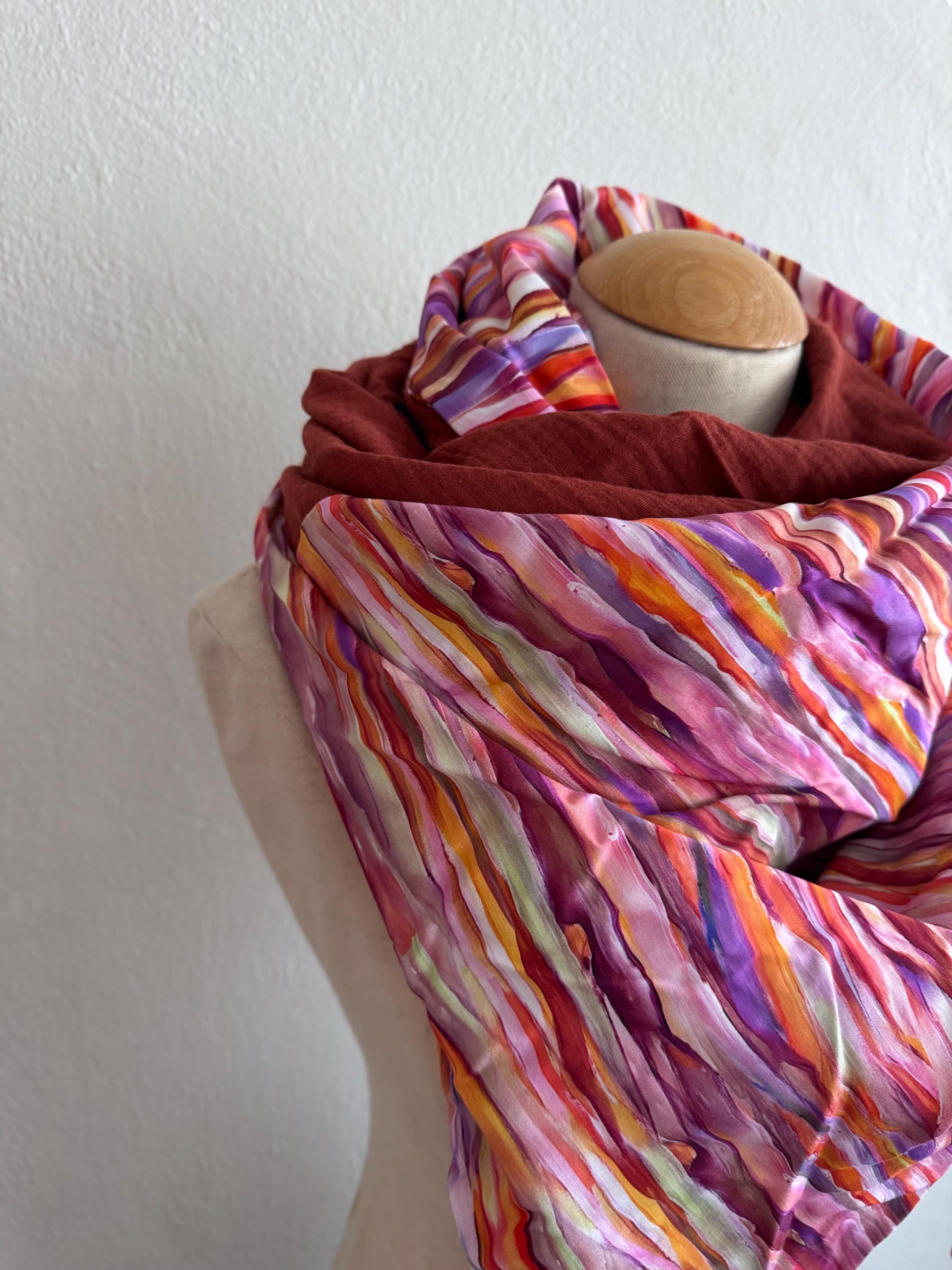 This handmade triangular scarf is a real eye-catcher! It combines a sophisticated viscose print with a colorful striped motif in purple and pink with a soft, rust-brown muslin fabric – a harmonious interplay of color, texture, and comfort.